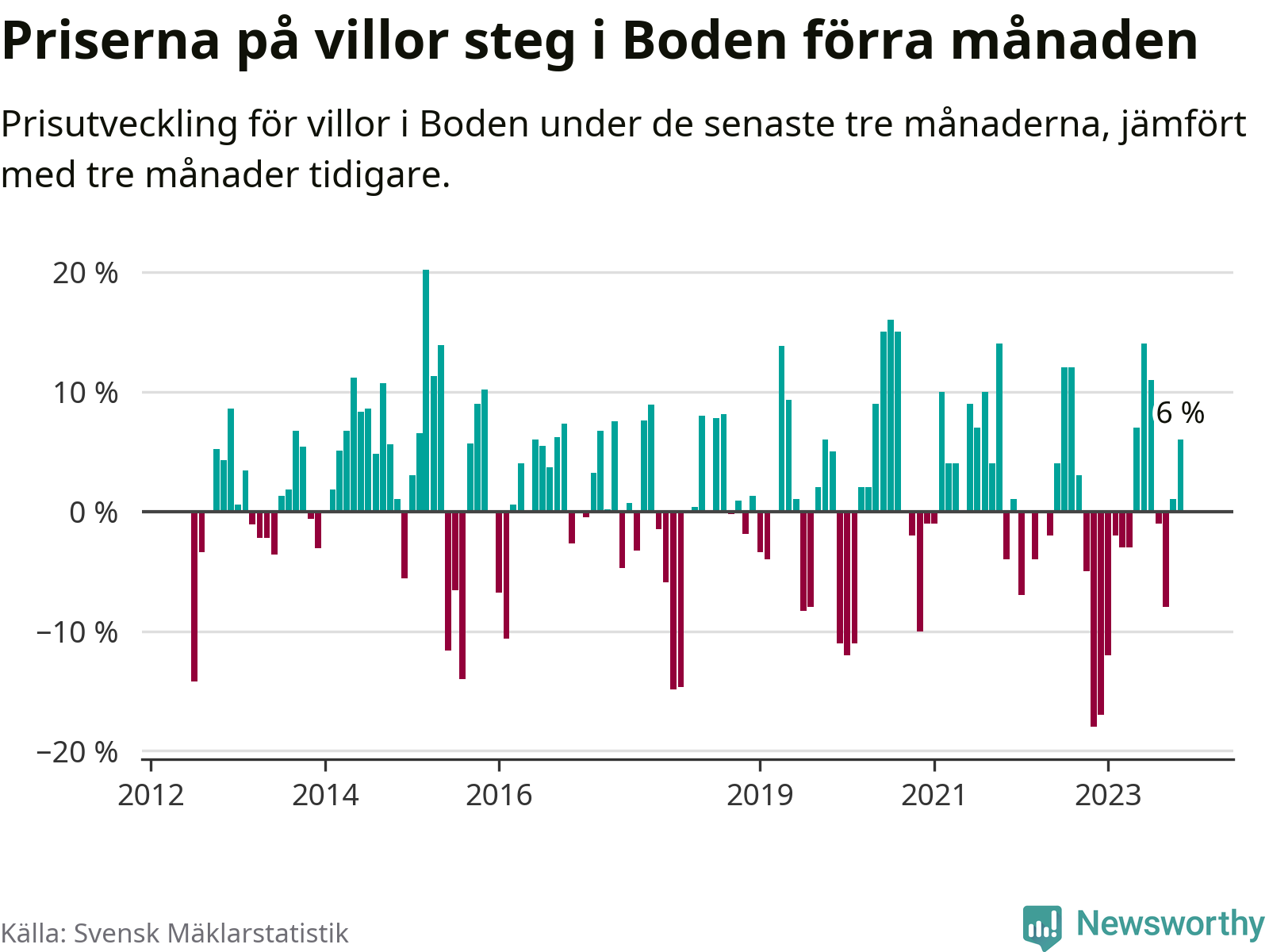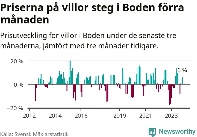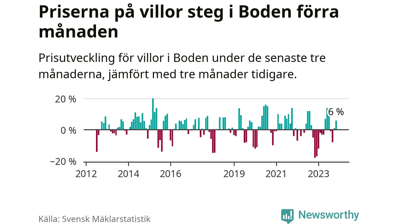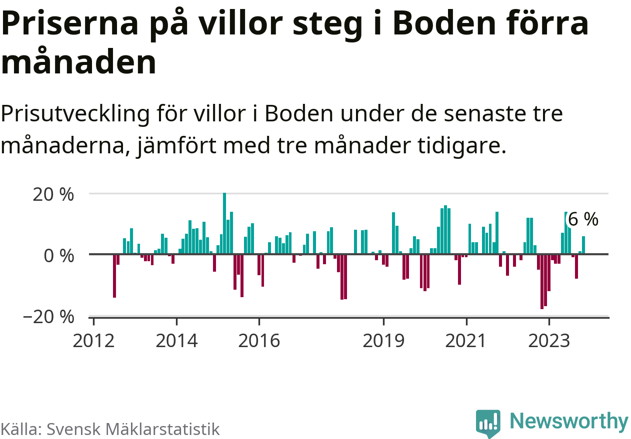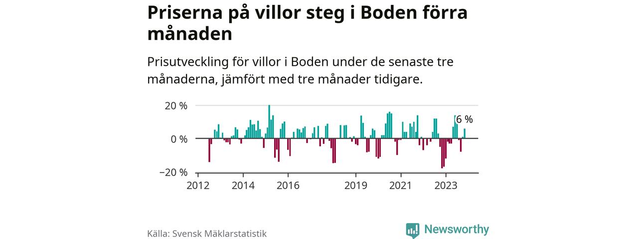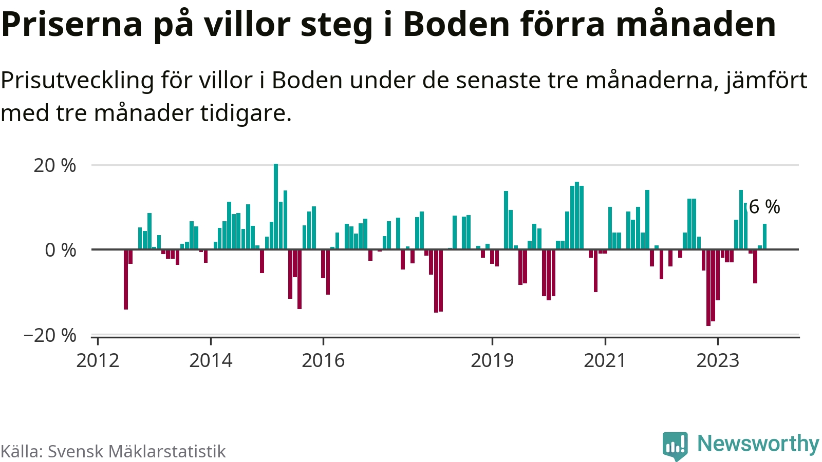 Villapriserna har gått upp i Bodens kommun. Medelpriset på försäljningarna under de senaste tre månaderna visar på en uppgång med 6 procent.