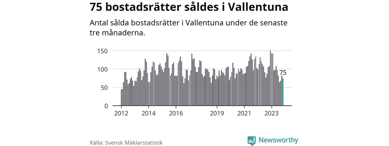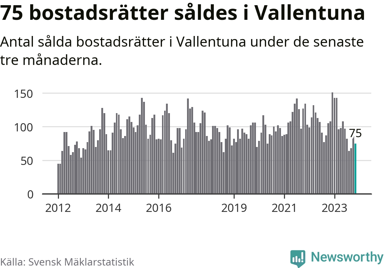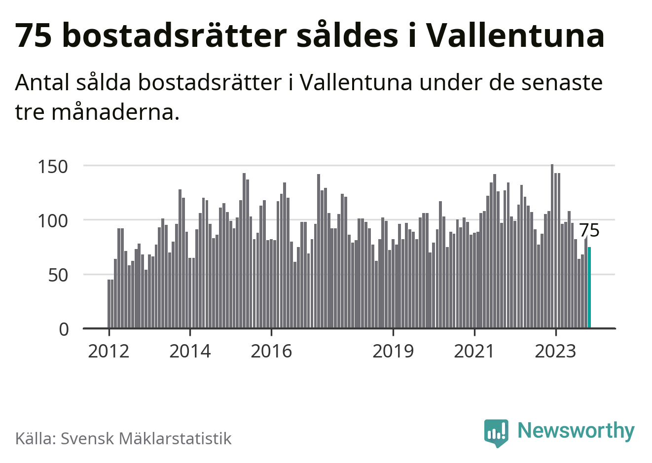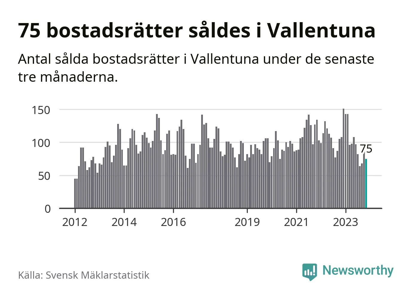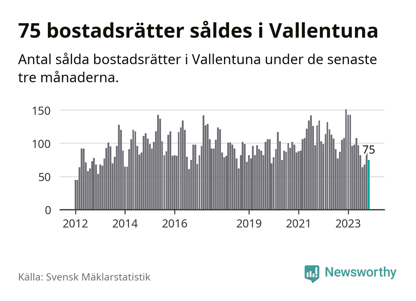 Mellan september och november såldes 75 bostadsrätter i Vallentuna kommun. Det är relativt få sett till aktiviteten på bostadsmarknaden i kommunen under de senaste tolv månaderna, samt det historiska snittet för den här tiden på året.