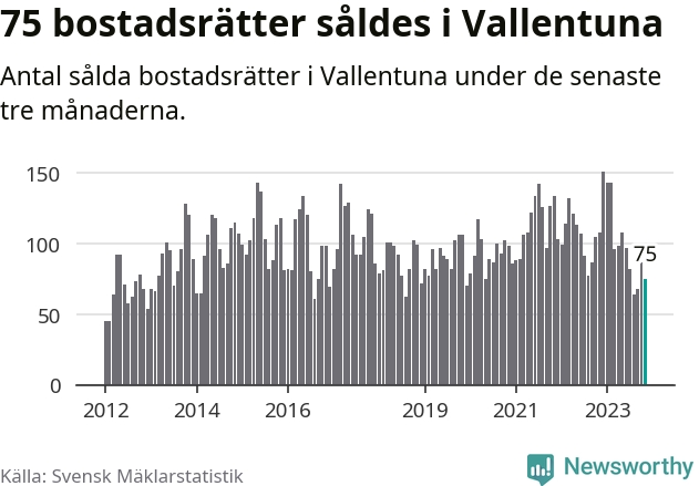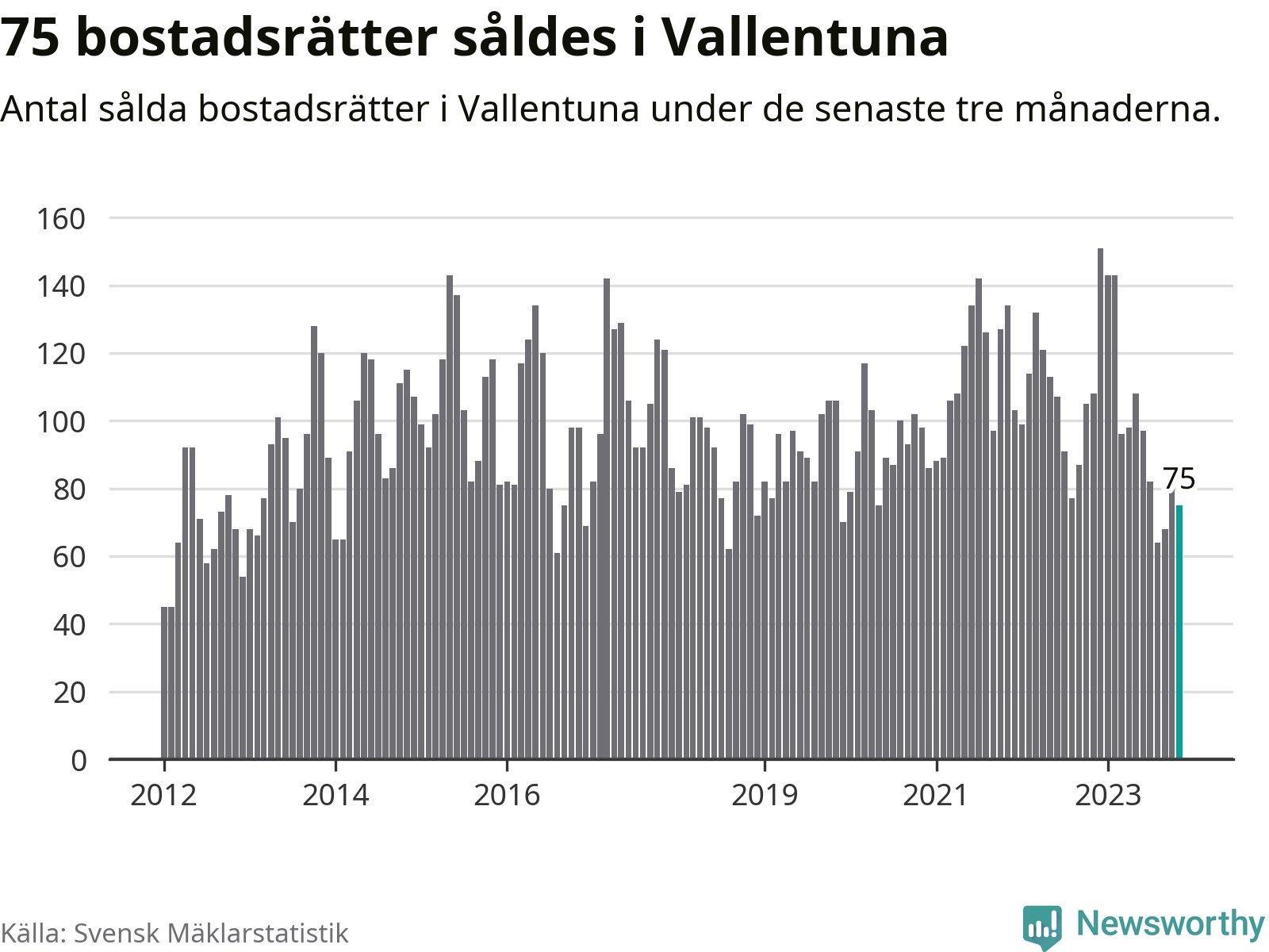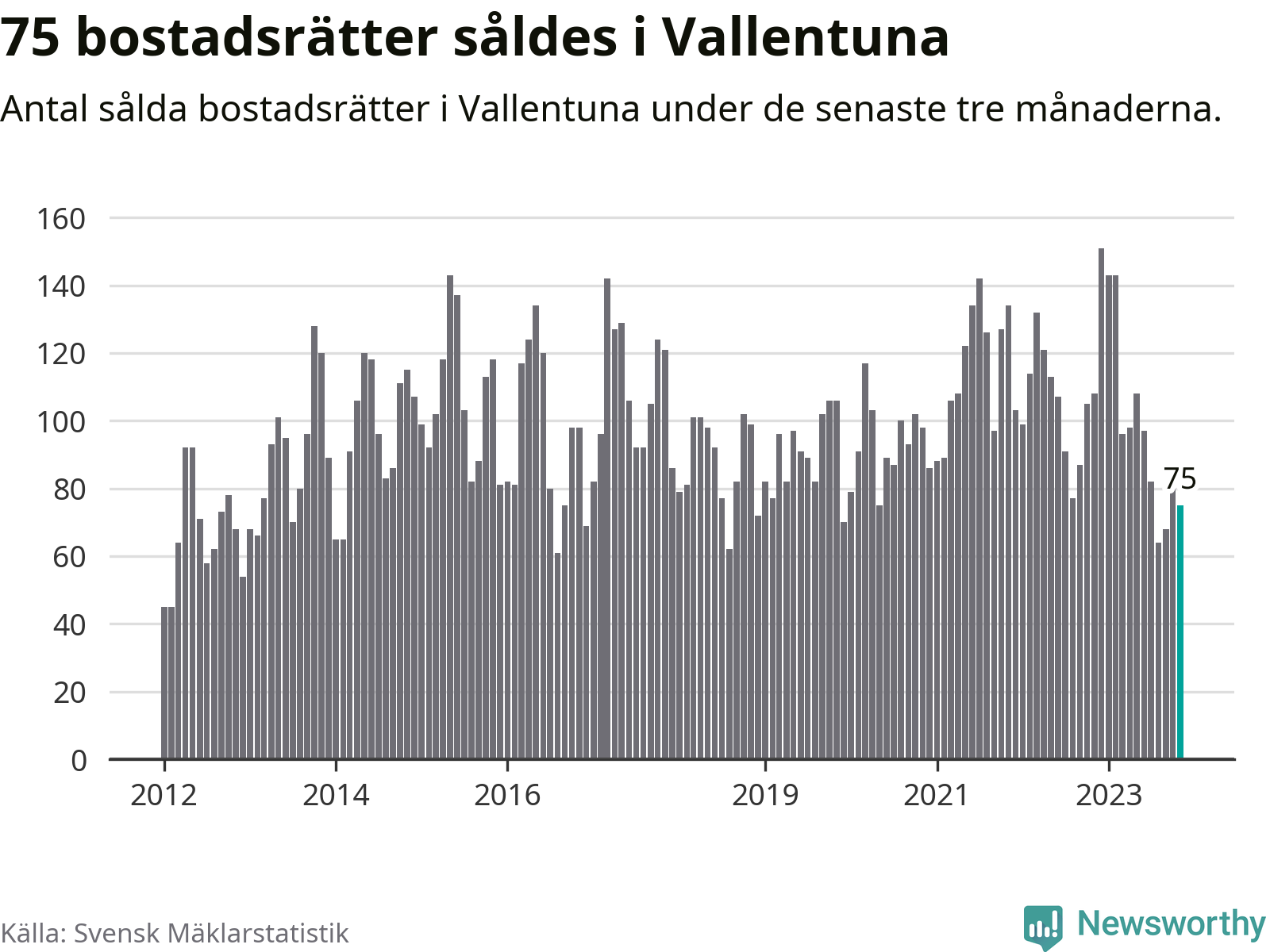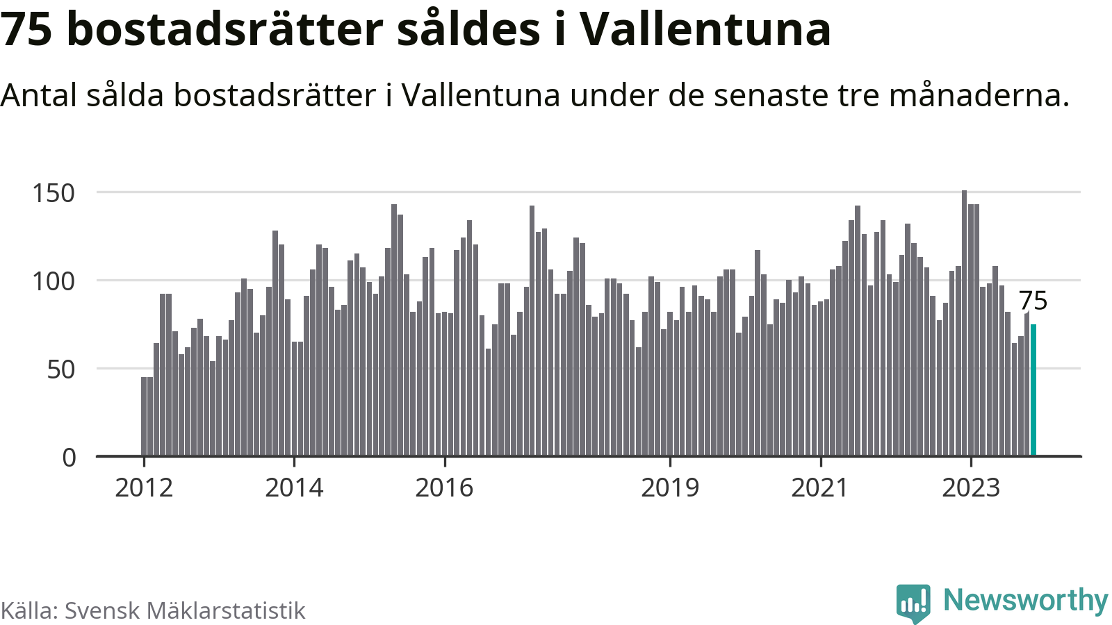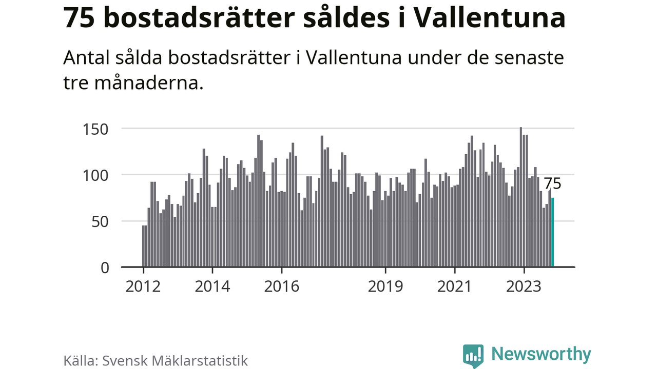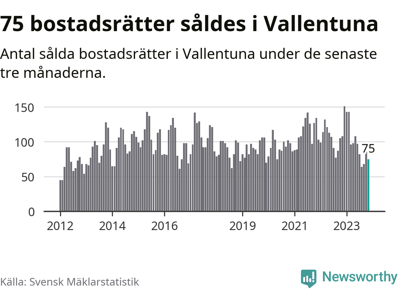 Mellan september och november såldes 75 bostadsrätter i Vallentuna kommun. Det är relativt få sett till aktiviteten på bostadsmarknaden i kommunen under de senaste tolv månaderna, samt det historiska snittet för den här tiden på året.