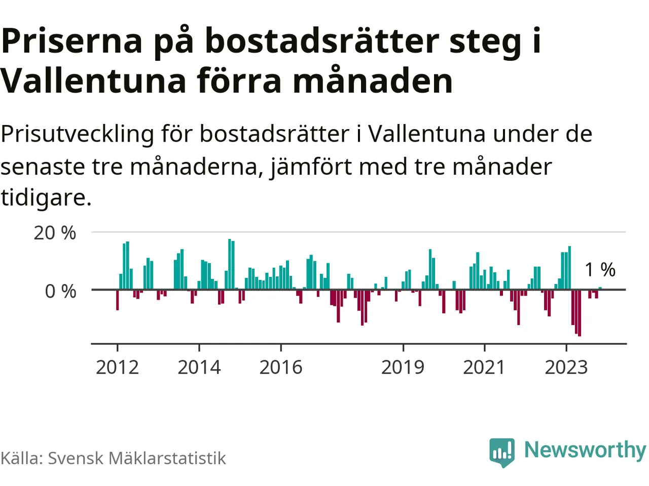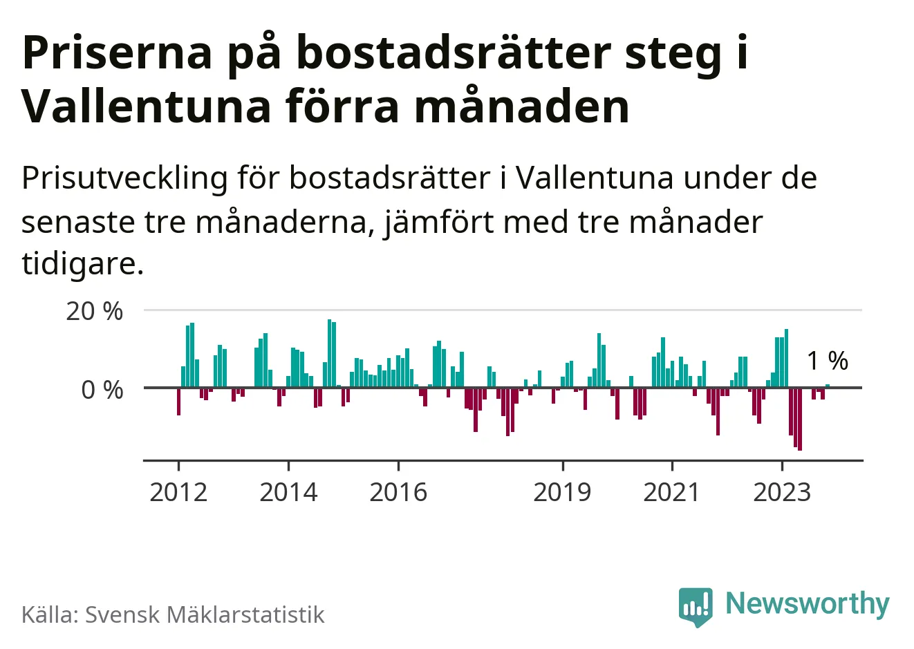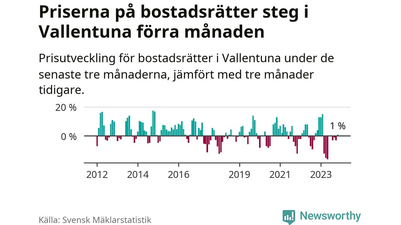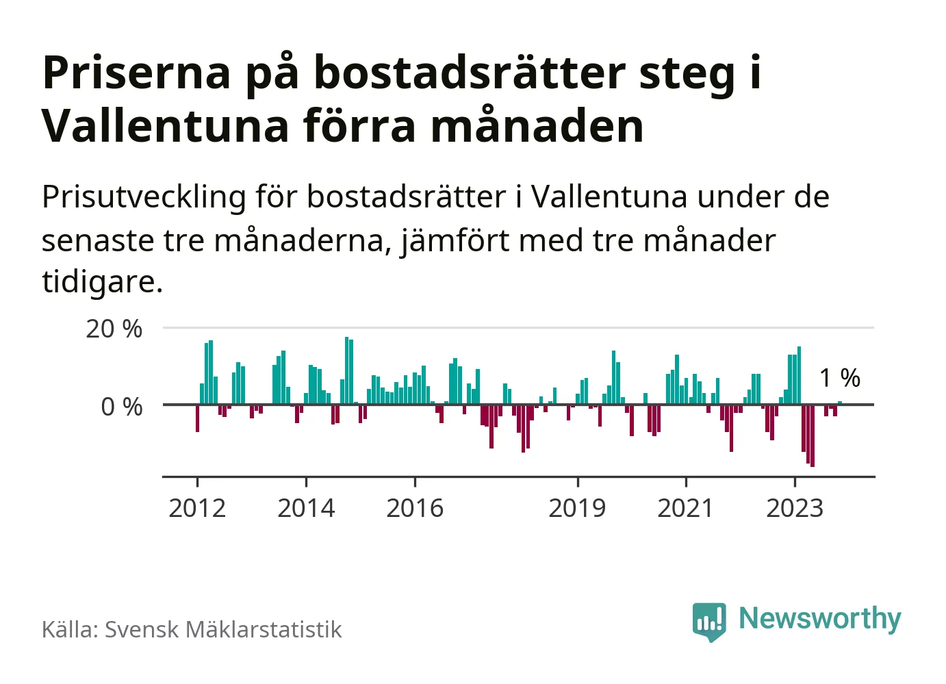 Statistiken visar även på en prisuppgång i Vallentuna kommun. Medelpriset på försäljningarna av bostadsrätter i kommunen var 1 procent högre än för tre månader sedan. Även i hela Stockholms län ökar priserna på bostadsrätter. I hela länet noterades en prisuppgång på 1 procent.