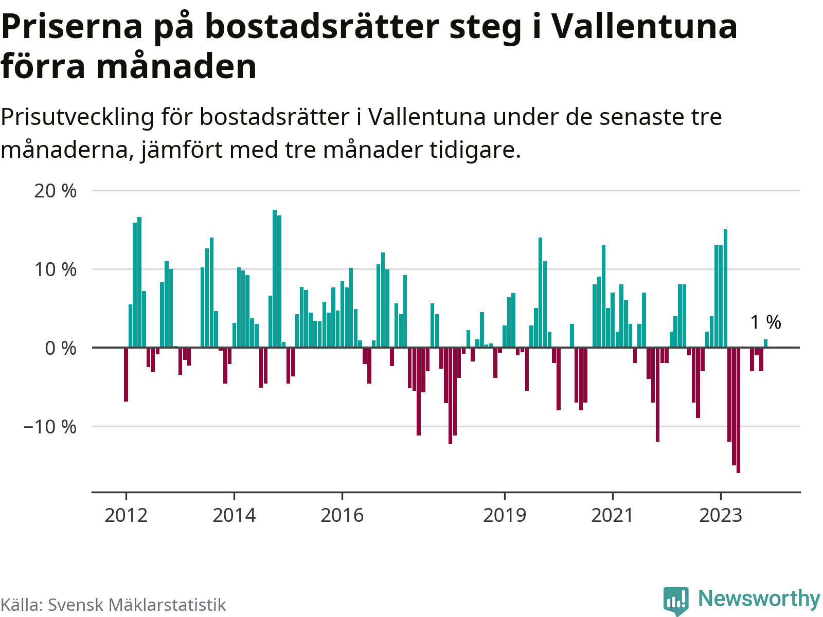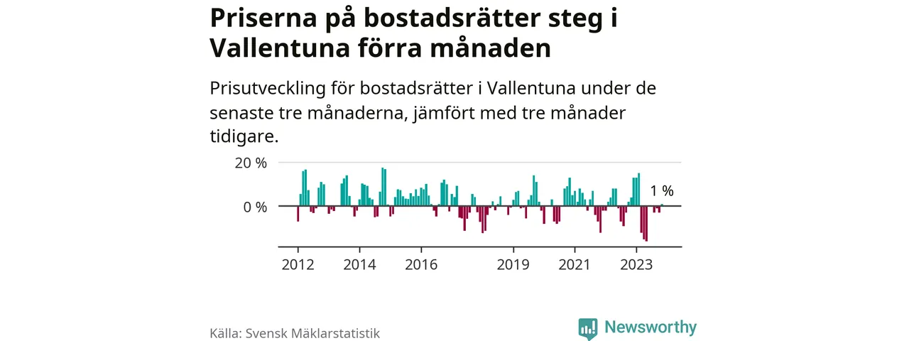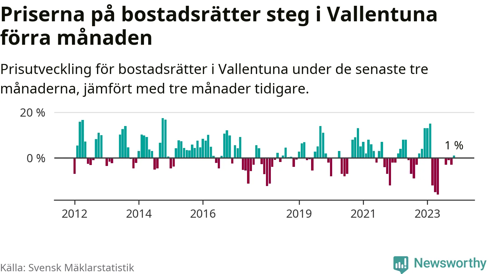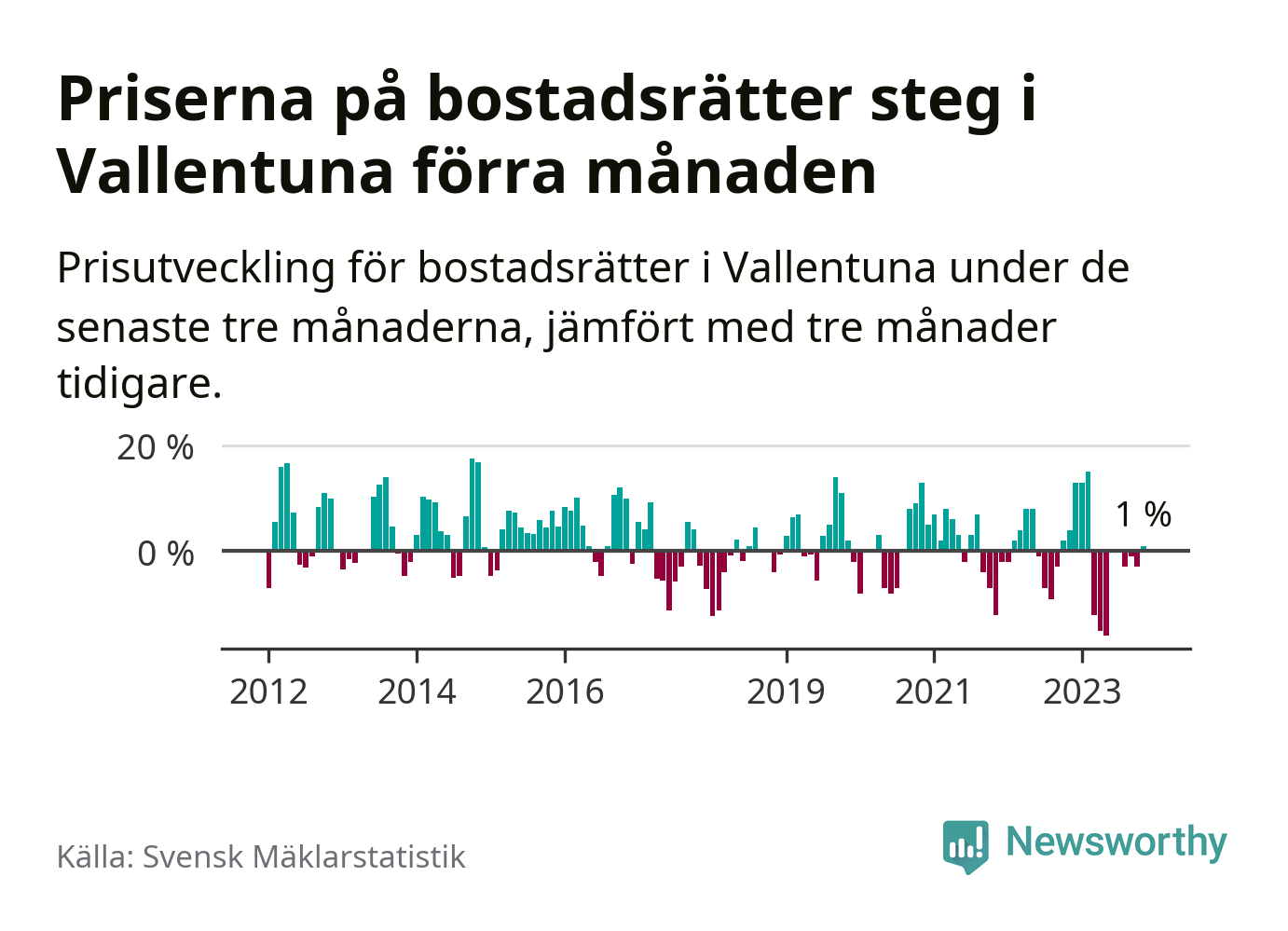 Statistiken visar även på en prisuppgång i Vallentuna kommun. Medelpriset på försäljningarna av bostadsrätter i kommunen var 1 procent högre än för tre månader sedan. Även i hela Stockholms län ökar priserna på bostadsrätter. I hela länet noterades en prisuppgång på 1 procent.