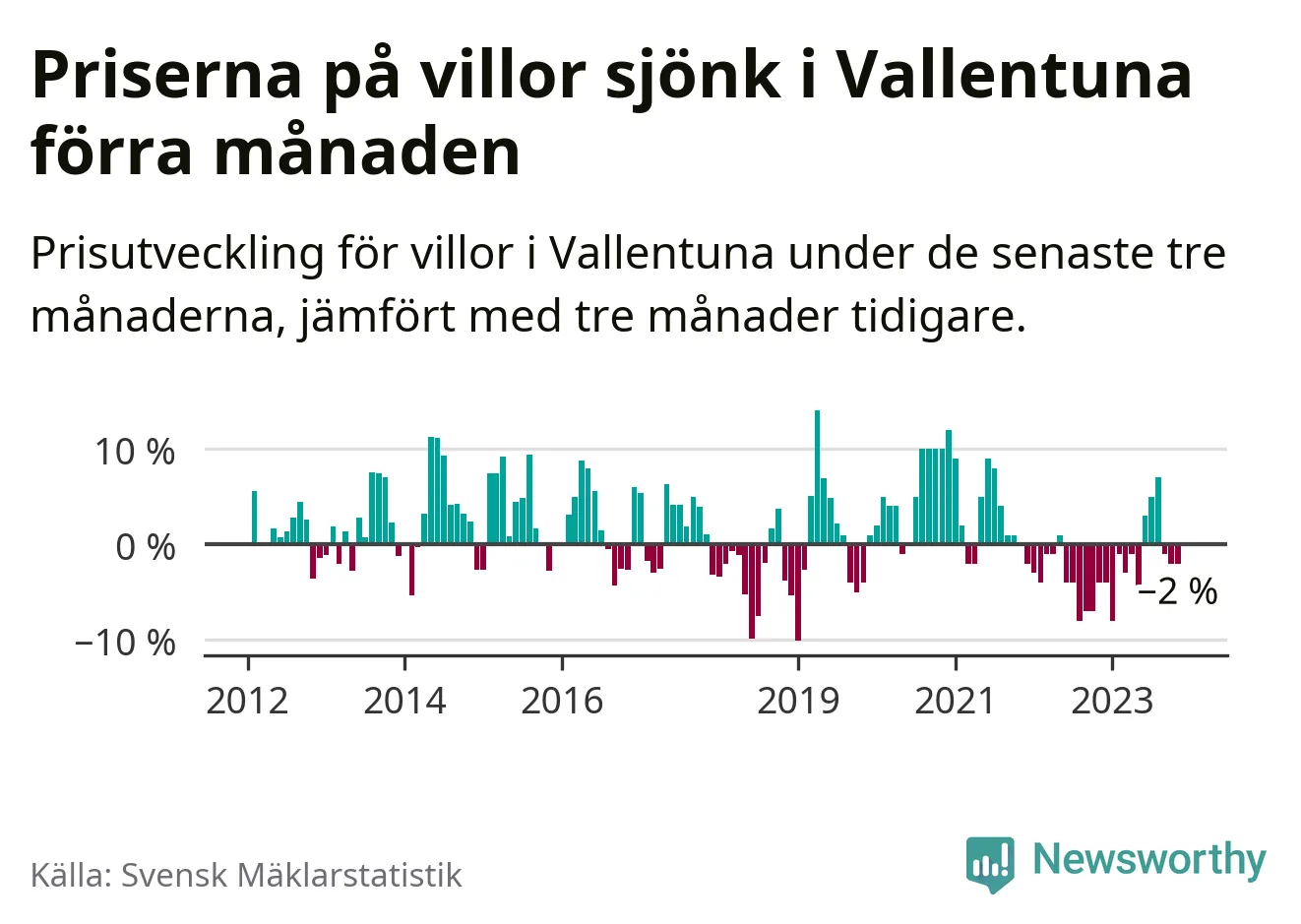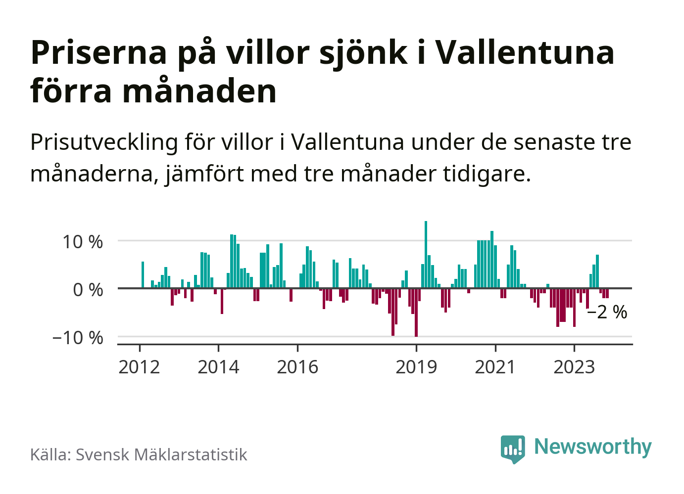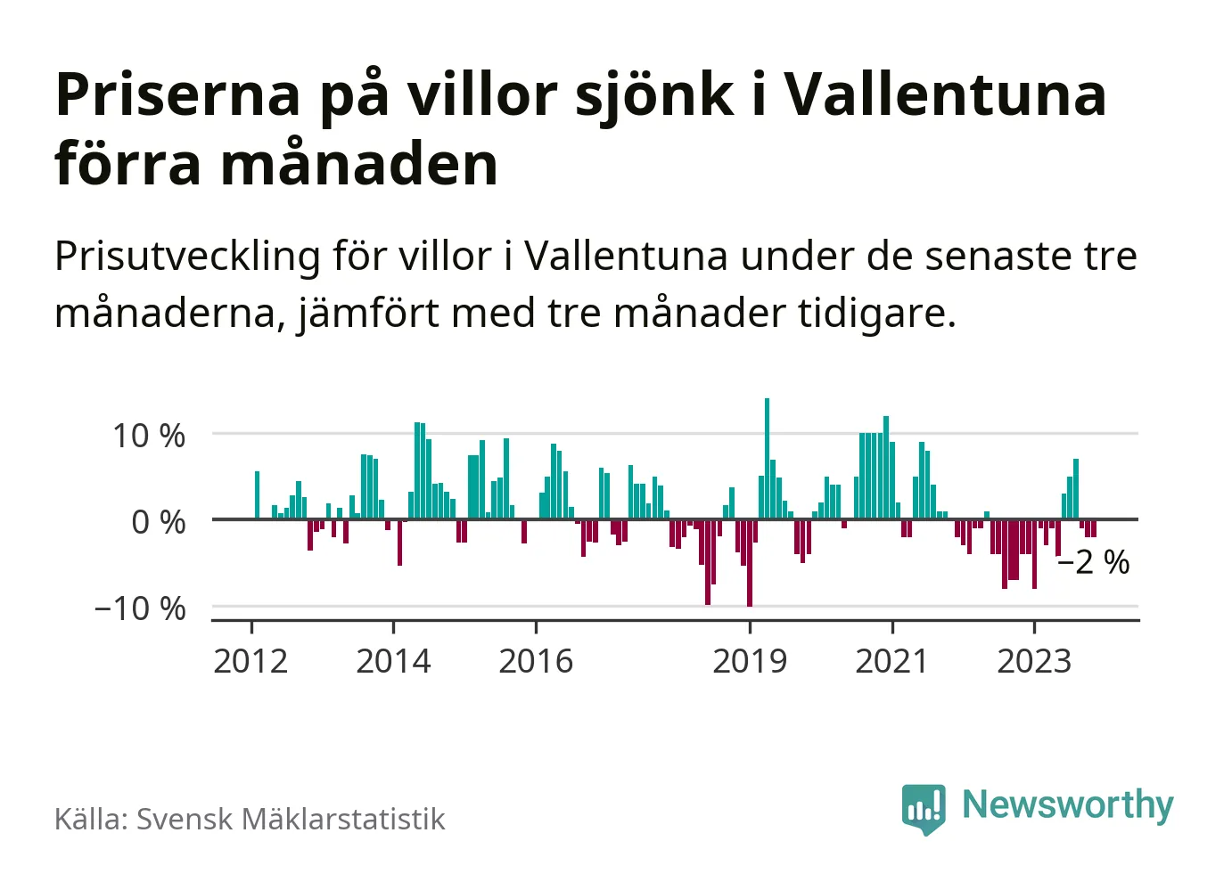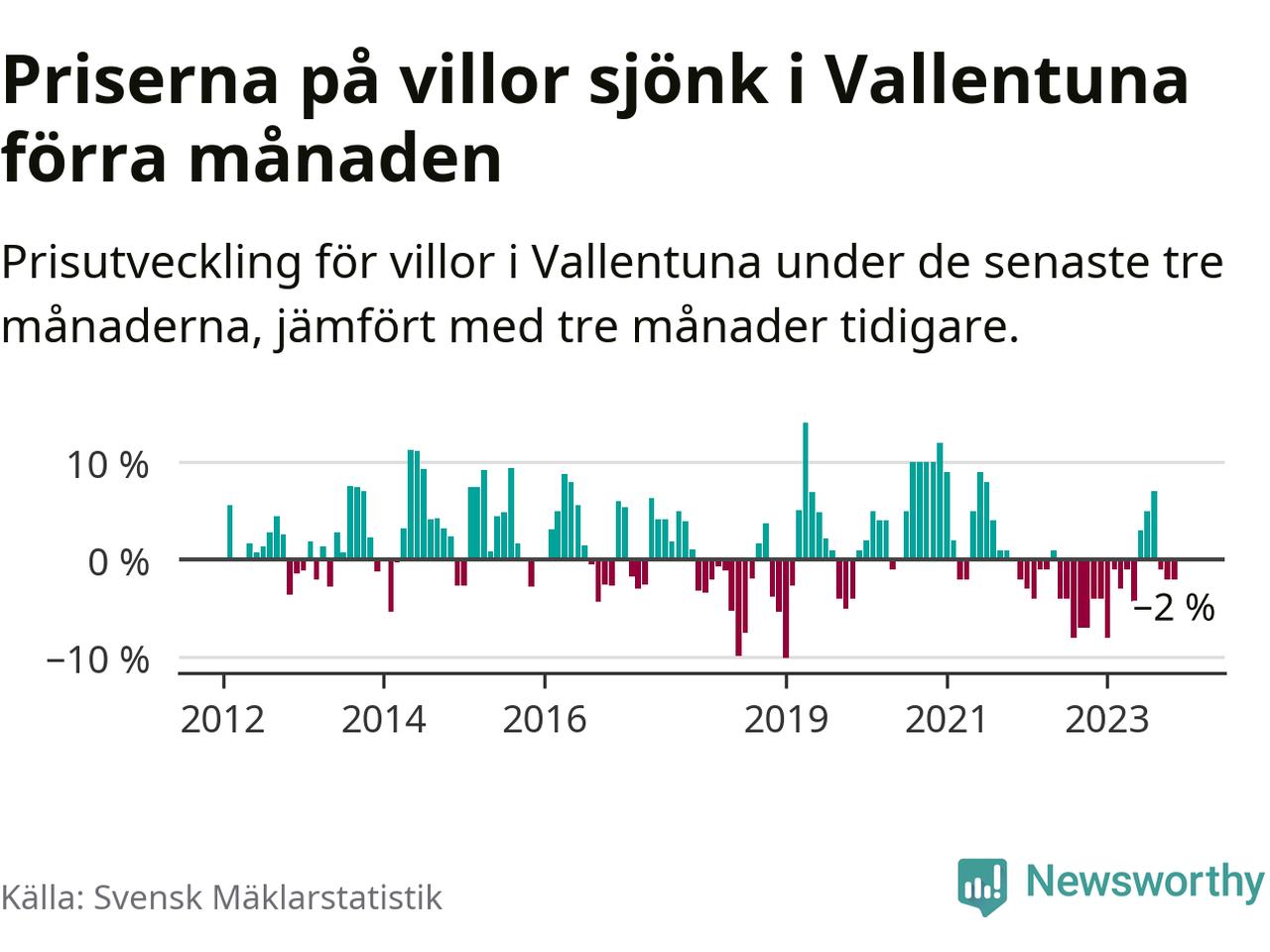 Villapriserna har gått ner i Vallentuna kommun. Medelpriset på försäljningarna under de senaste tre månaderna visar på en nedgång med 2 procent.