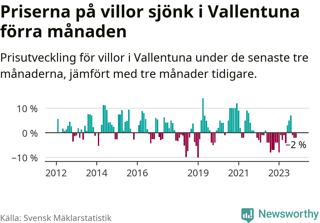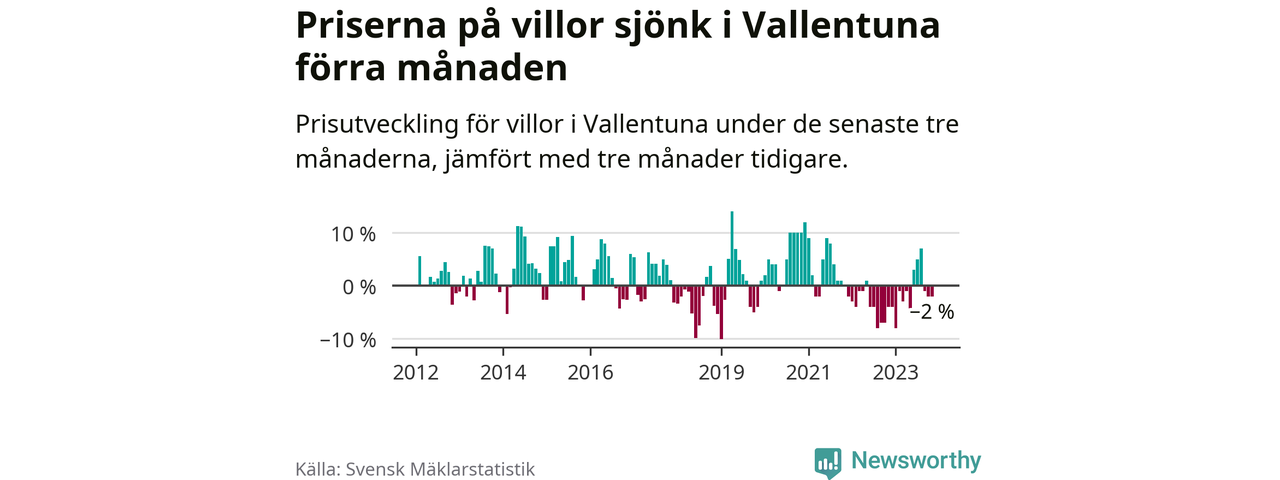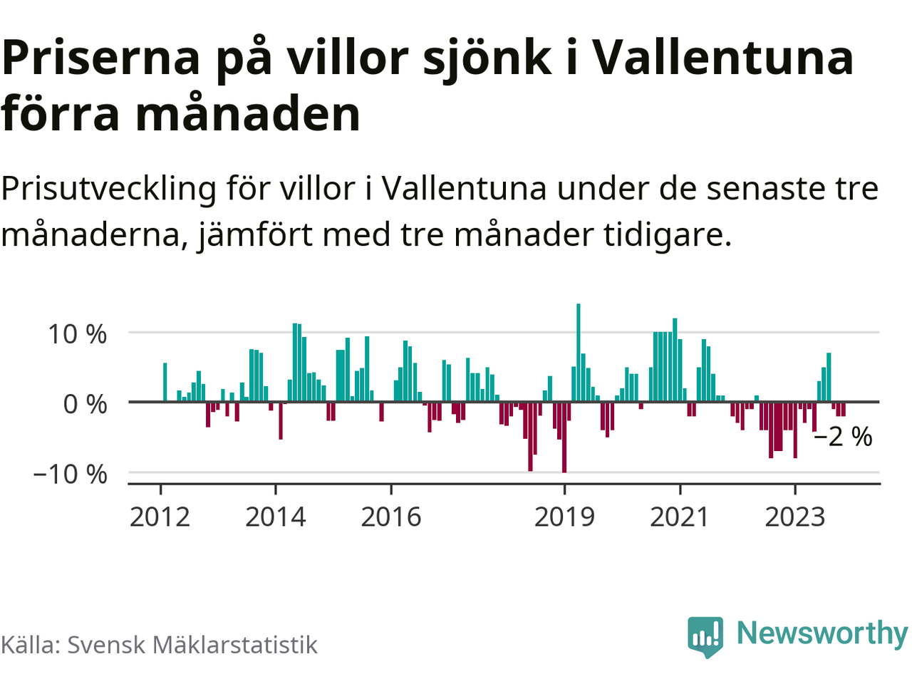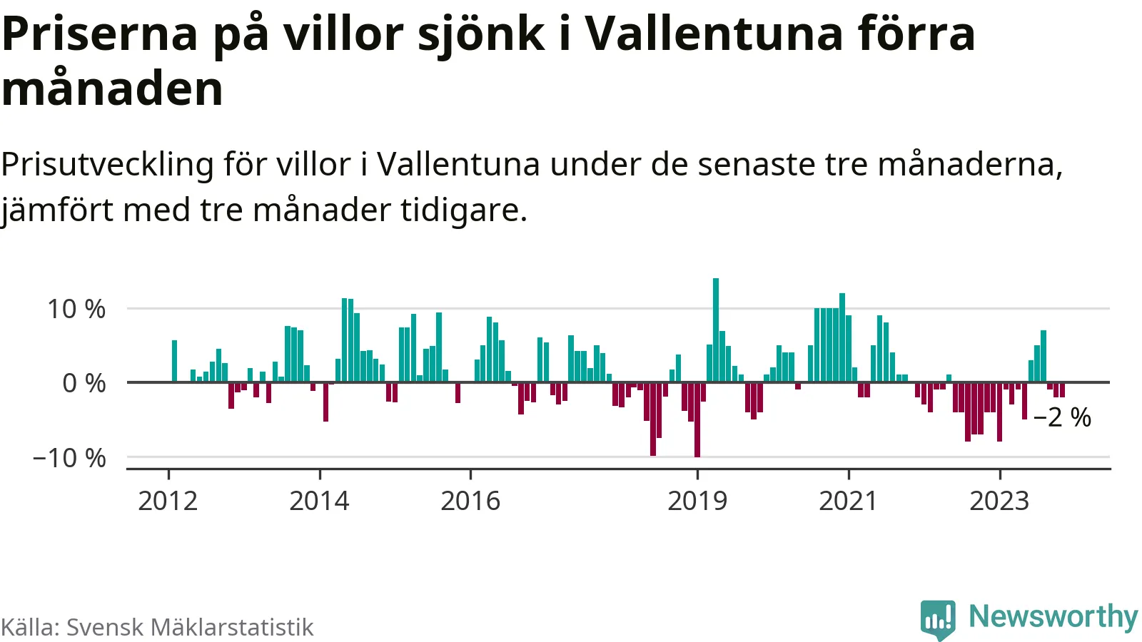 Villapriserna har gått ner i Vallentuna kommun. Medelpriset på försäljningarna under de senaste tre månaderna visar på en nedgång med 2 procent.