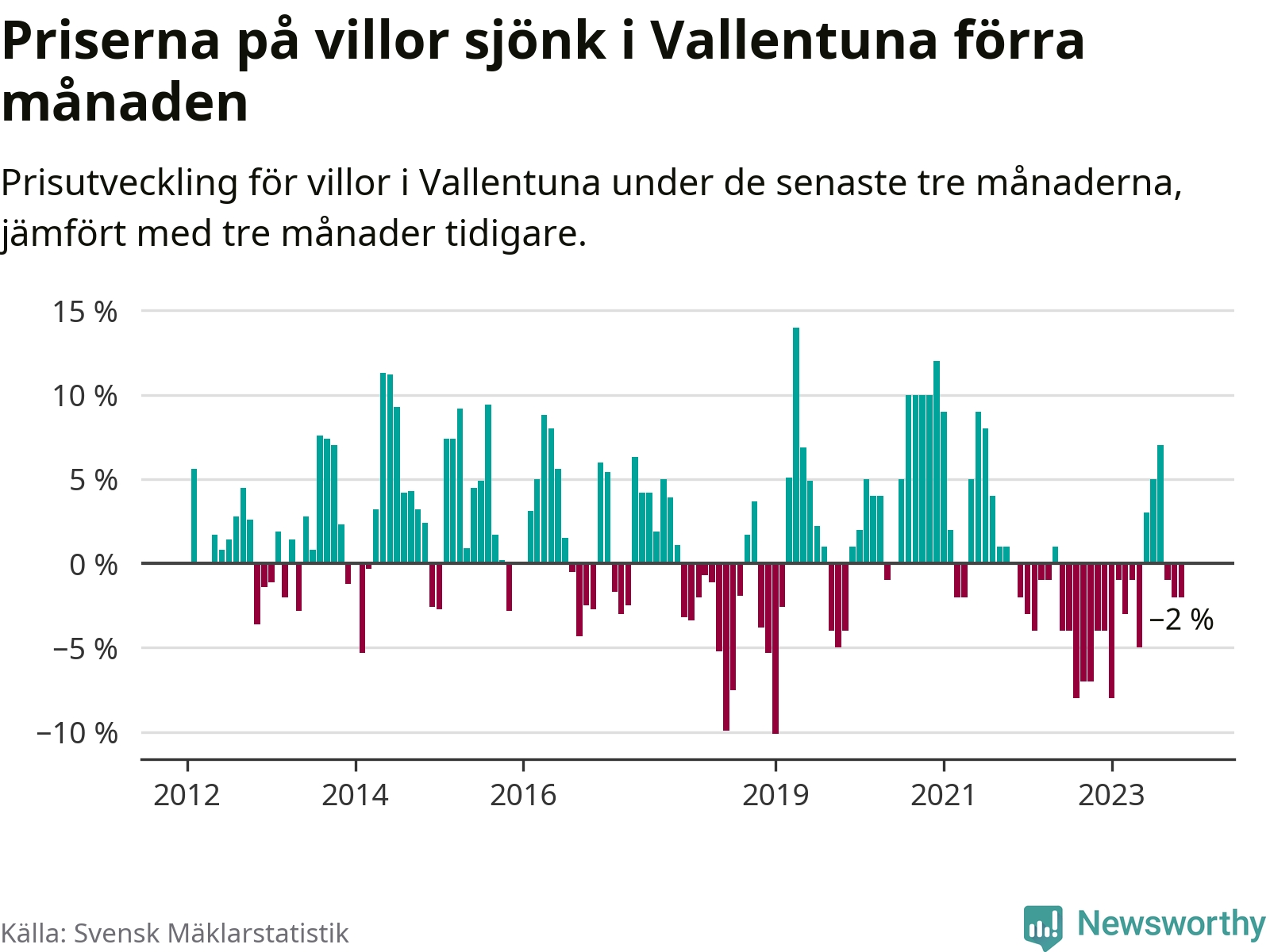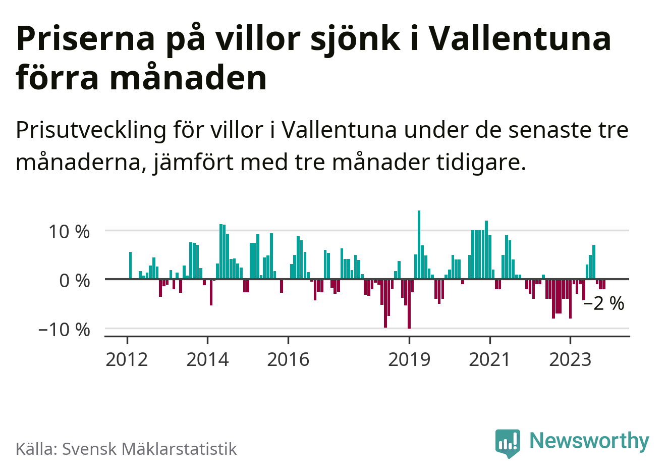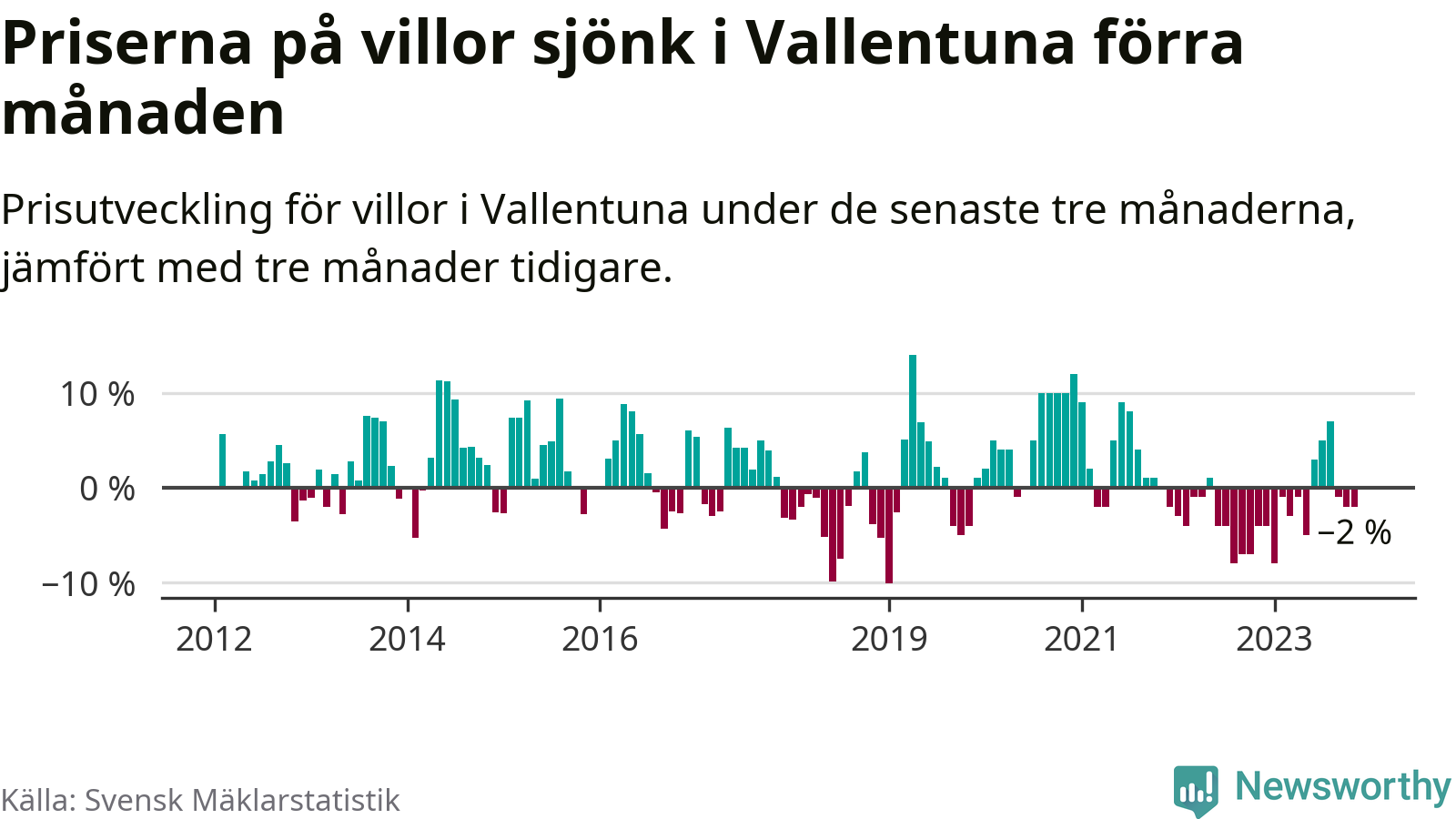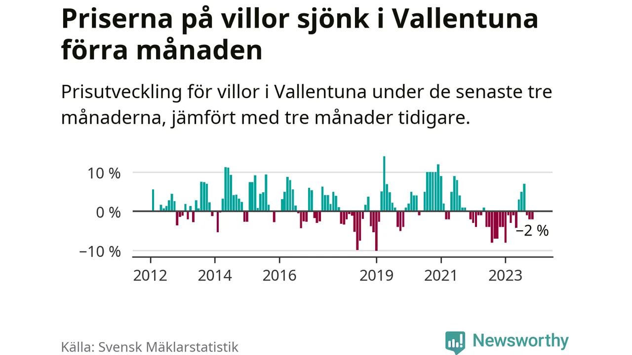 Villapriserna har gått ner i Vallentuna kommun. Medelpriset på försäljningarna under de senaste tre månaderna visar på en nedgång med 2 procent.