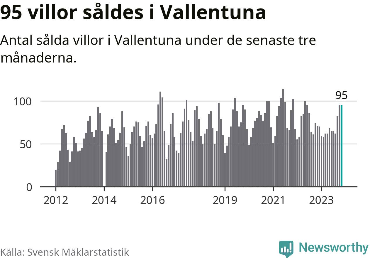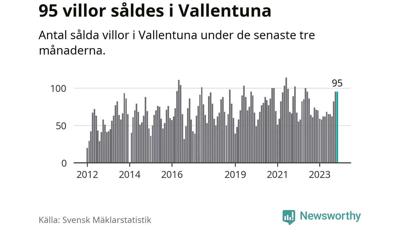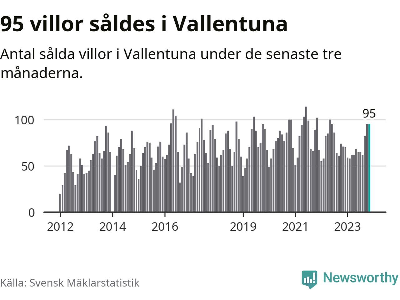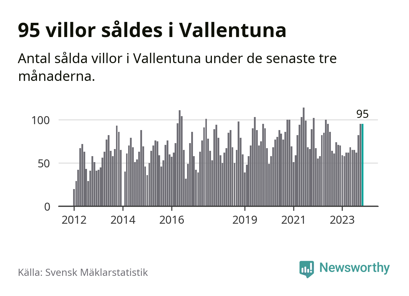 Sammanlagt såldes 95 villor i Vallentuna kommun mellan september och november till ett genomsnittligt pris på 4,9 miljoner kronor. I fjol gjordes 71 affärer vid den här tiden på året.