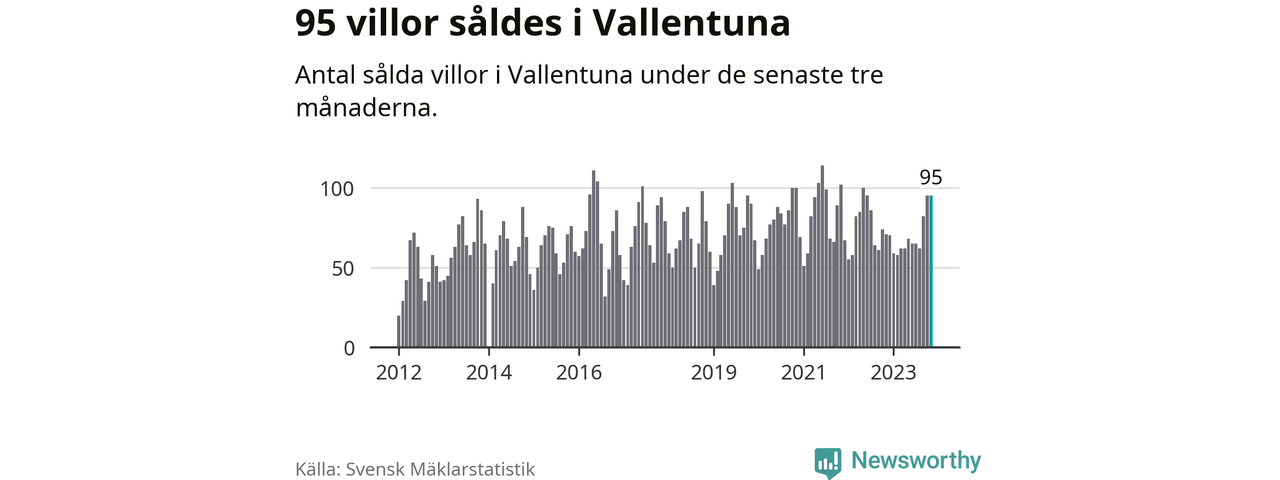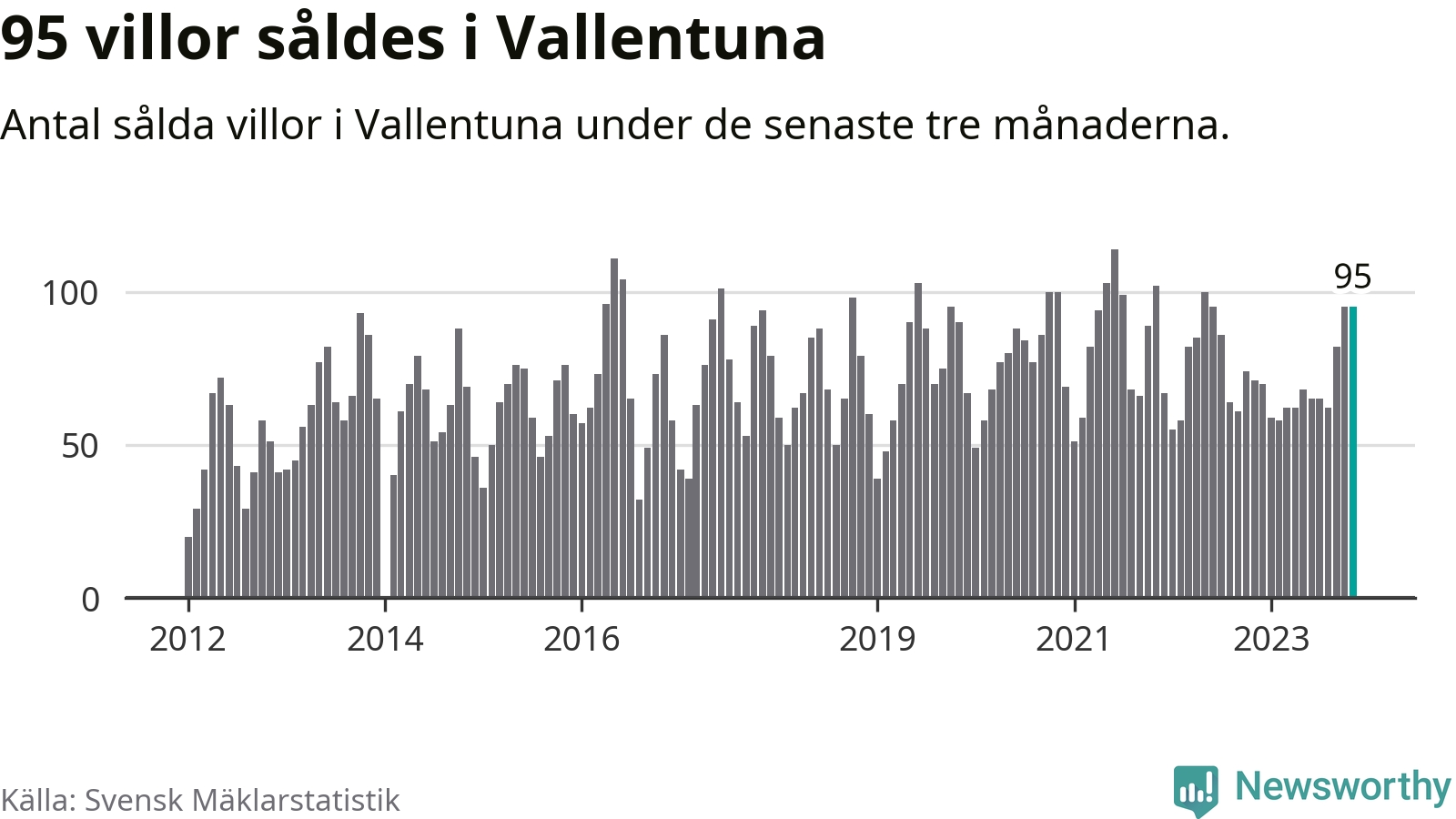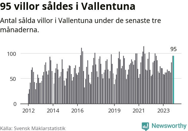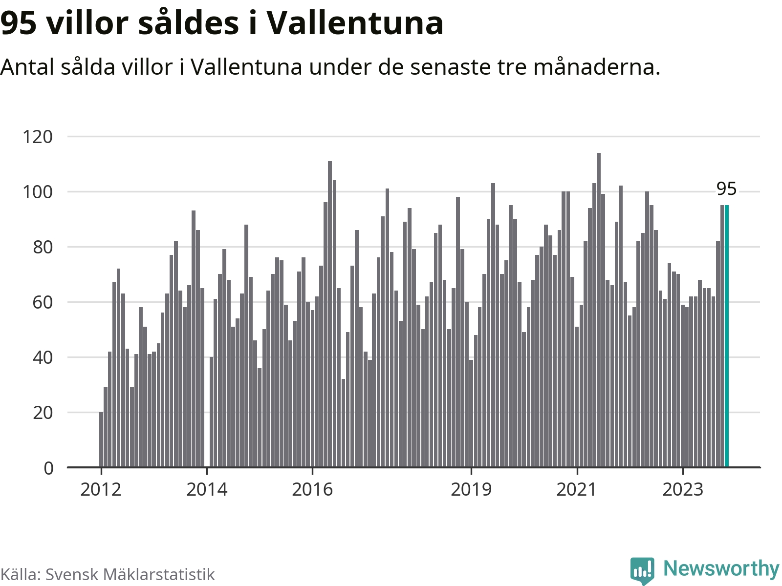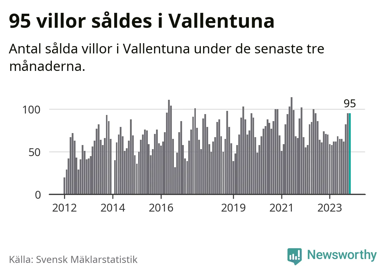 Sammanlagt såldes 95 villor i Vallentuna kommun mellan september och november till ett genomsnittligt pris på 4,9 miljoner kronor. I fjol gjordes 71 affärer vid den här tiden på året.