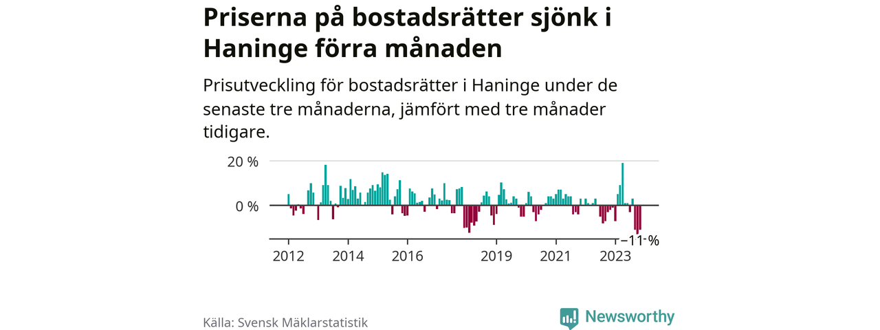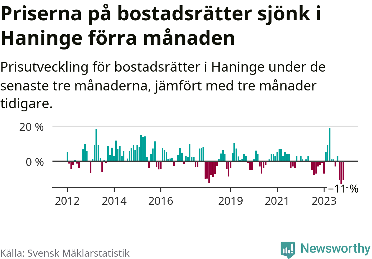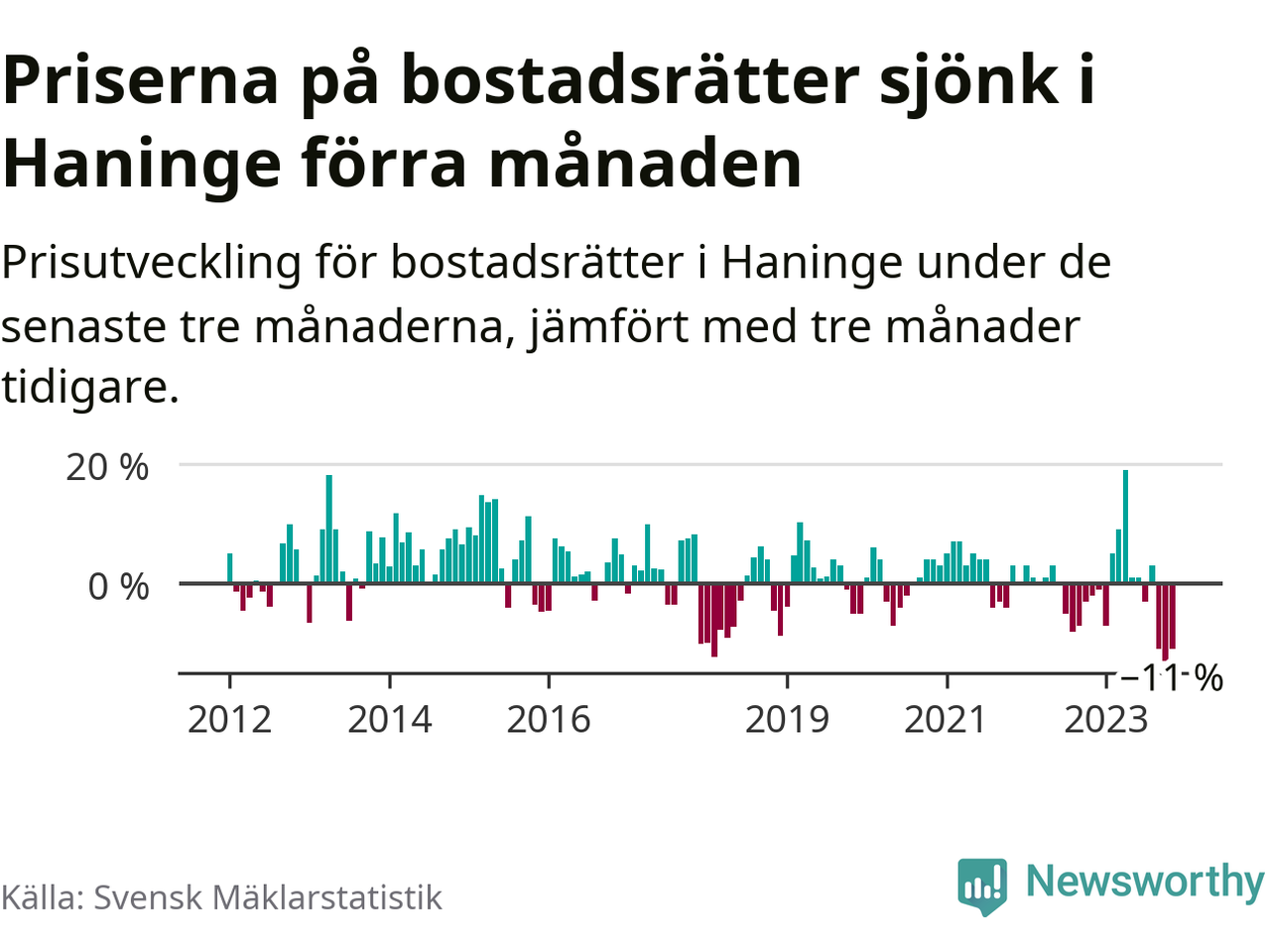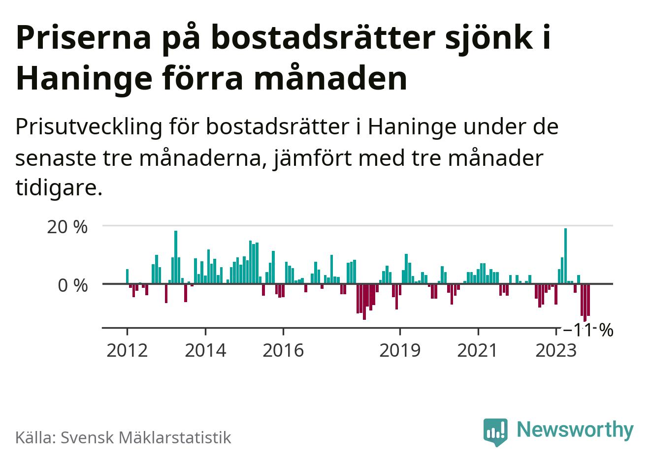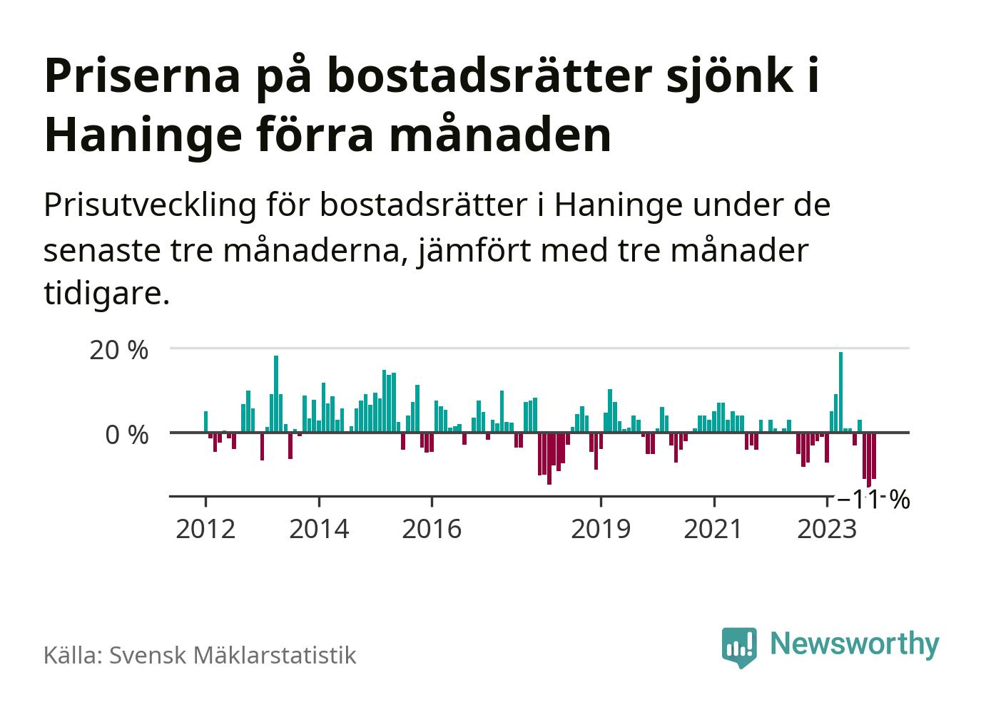 Priserna på bostadsrätter sjönk mellan september och november med 11 procent i Haninge kommun. Det är en betydande nedgång jämfört med det gångna året då priserna i snitt sjunkit med 1 procent.