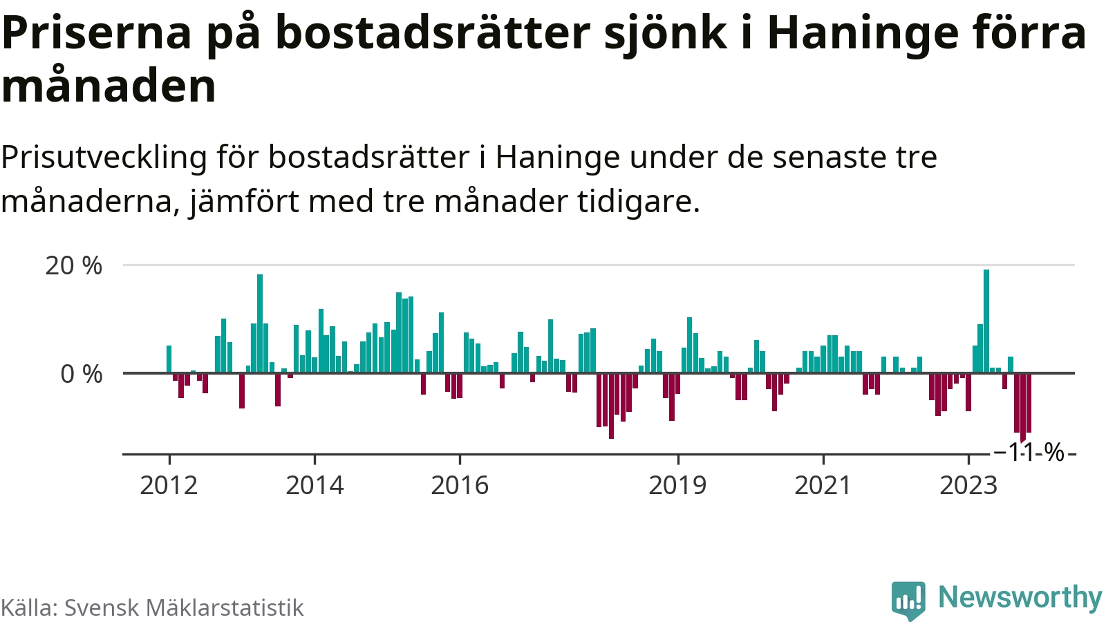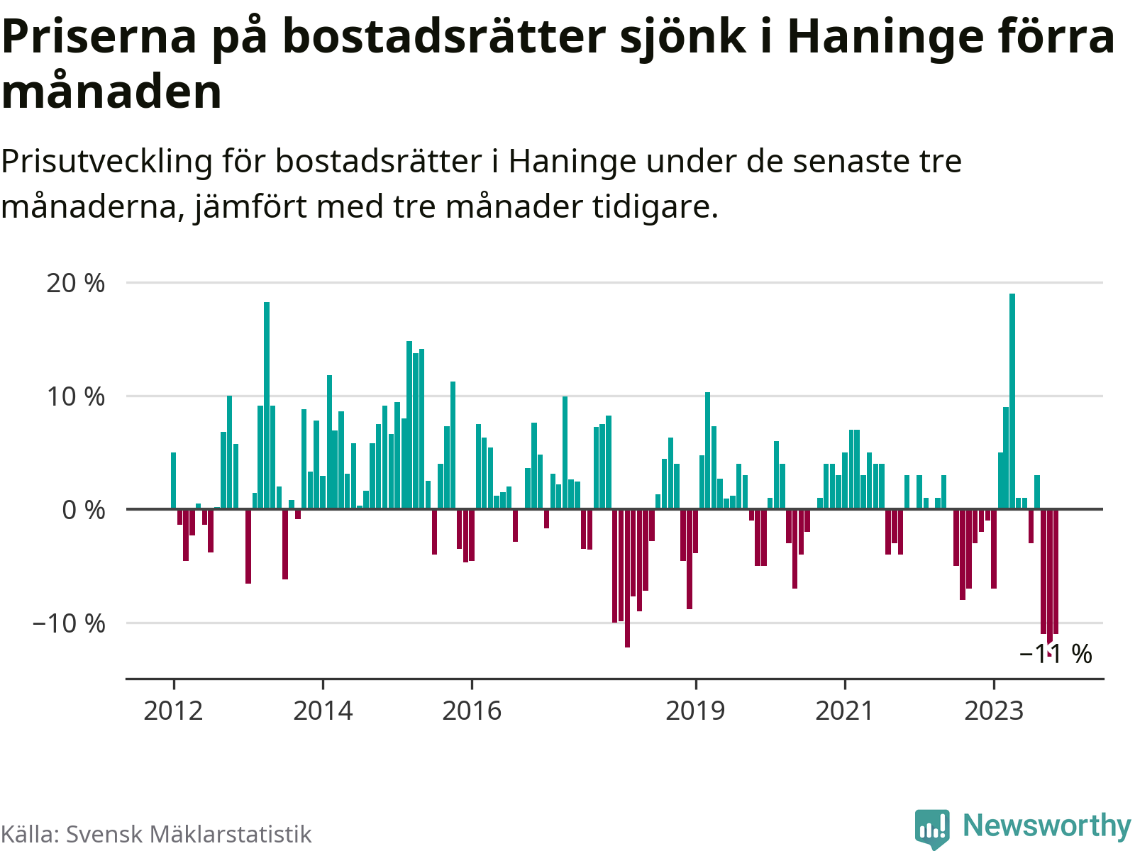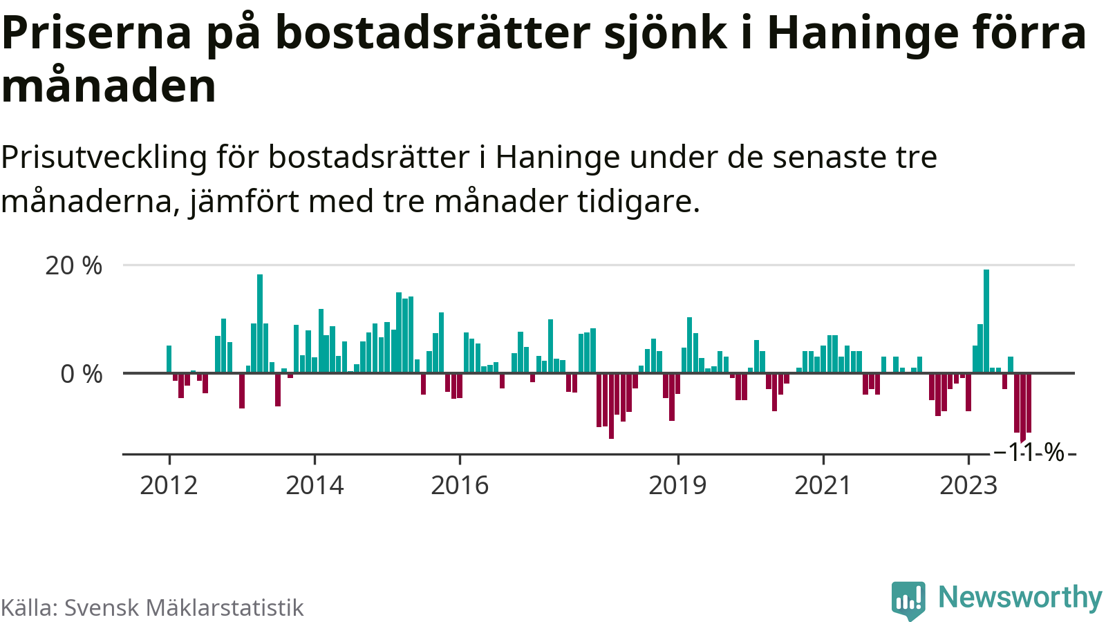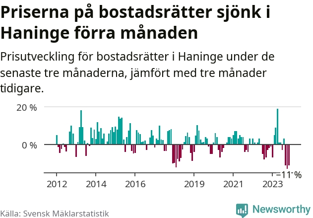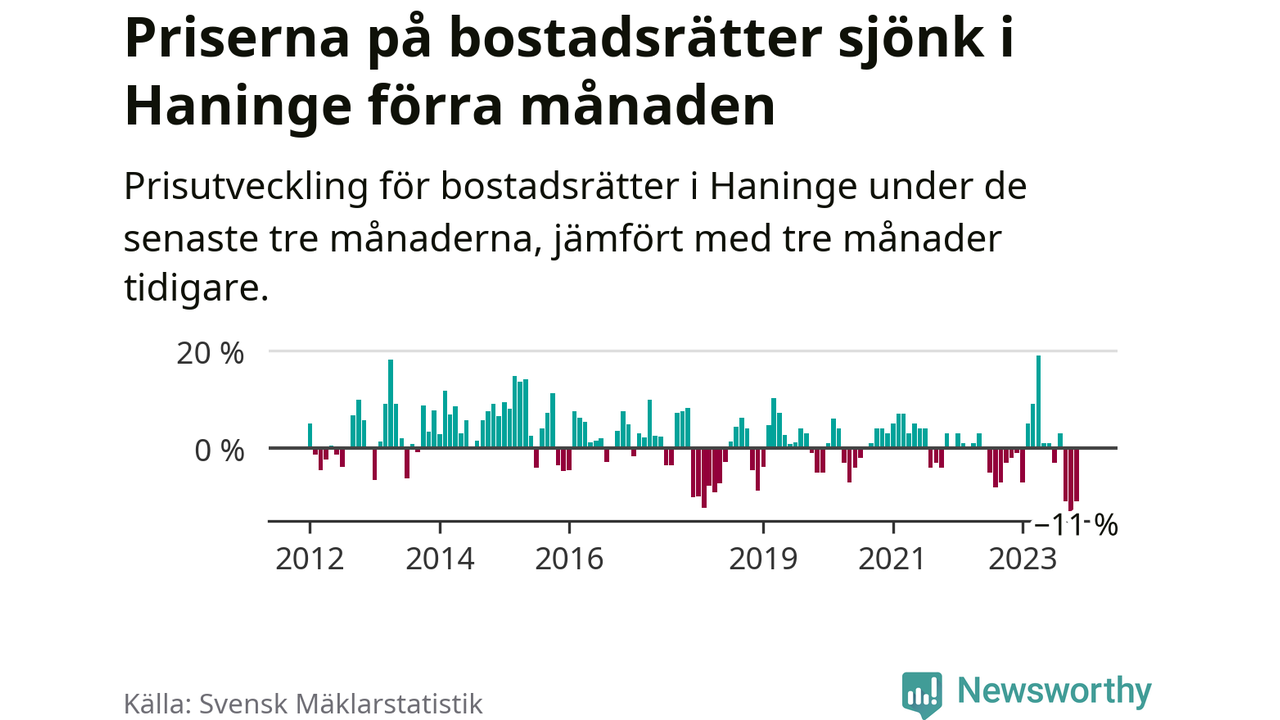 Priserna på bostadsrätter sjönk mellan september och november med 11 procent i Haninge kommun. Det är en betydande nedgång jämfört med det gångna året då priserna i snitt sjunkit med 1 procent.