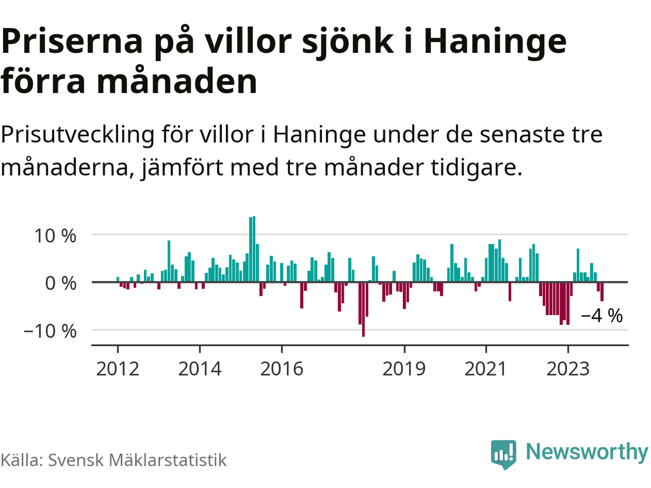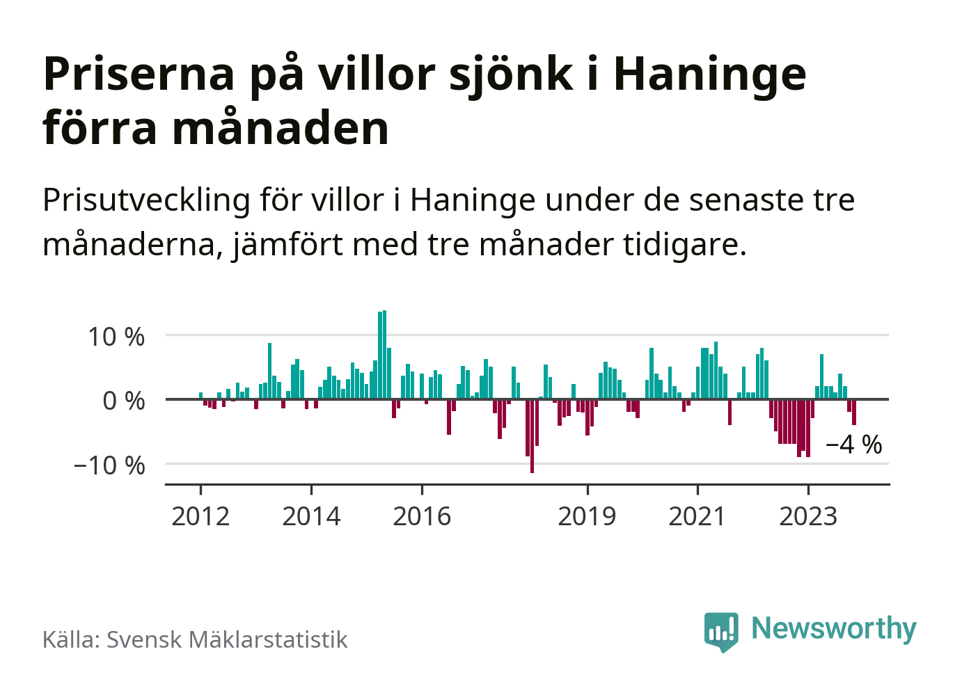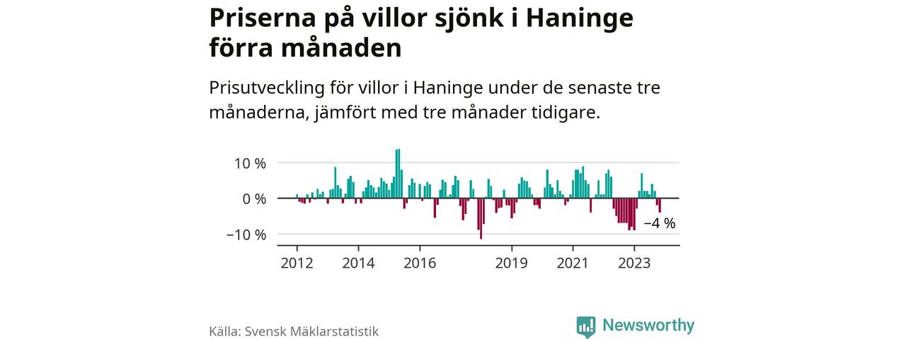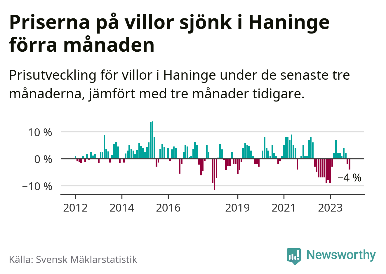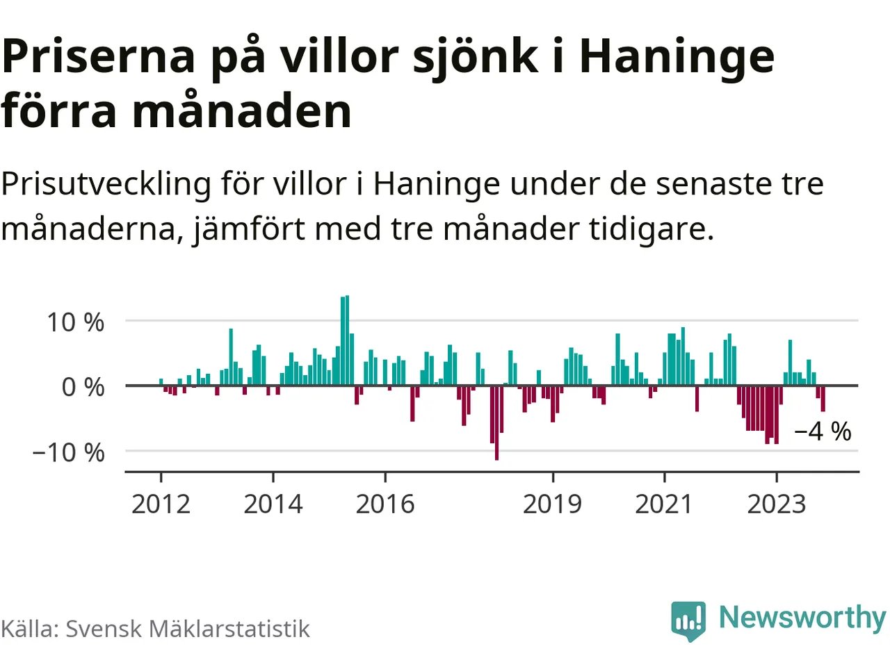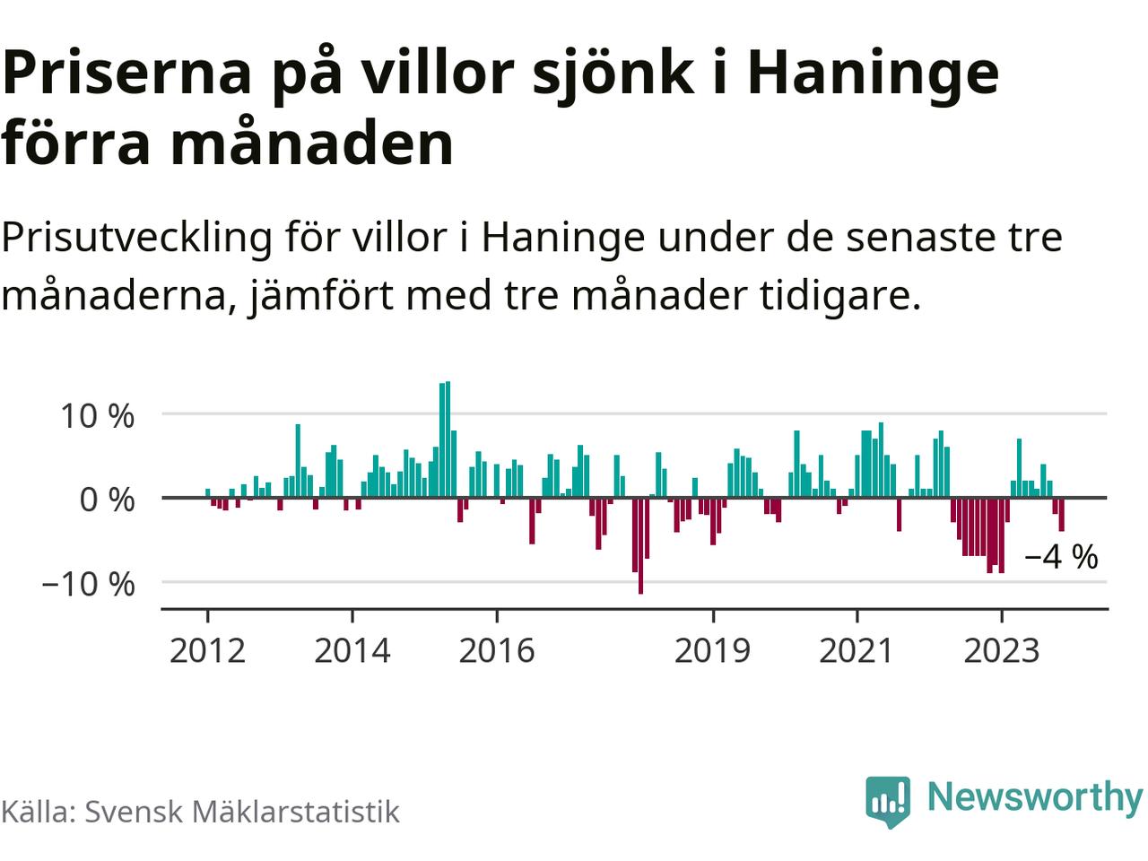Statistiken visar även på en kännbar prisnedgång i Haninge kommun. Medelpriset på försäljningarna av villor i kommunen var 4 procent lägre än för tre månader sedan. Även i hela Stockholms län sjunker villapriserna. I hela länet noterades en prisnedgång på 3 procent.