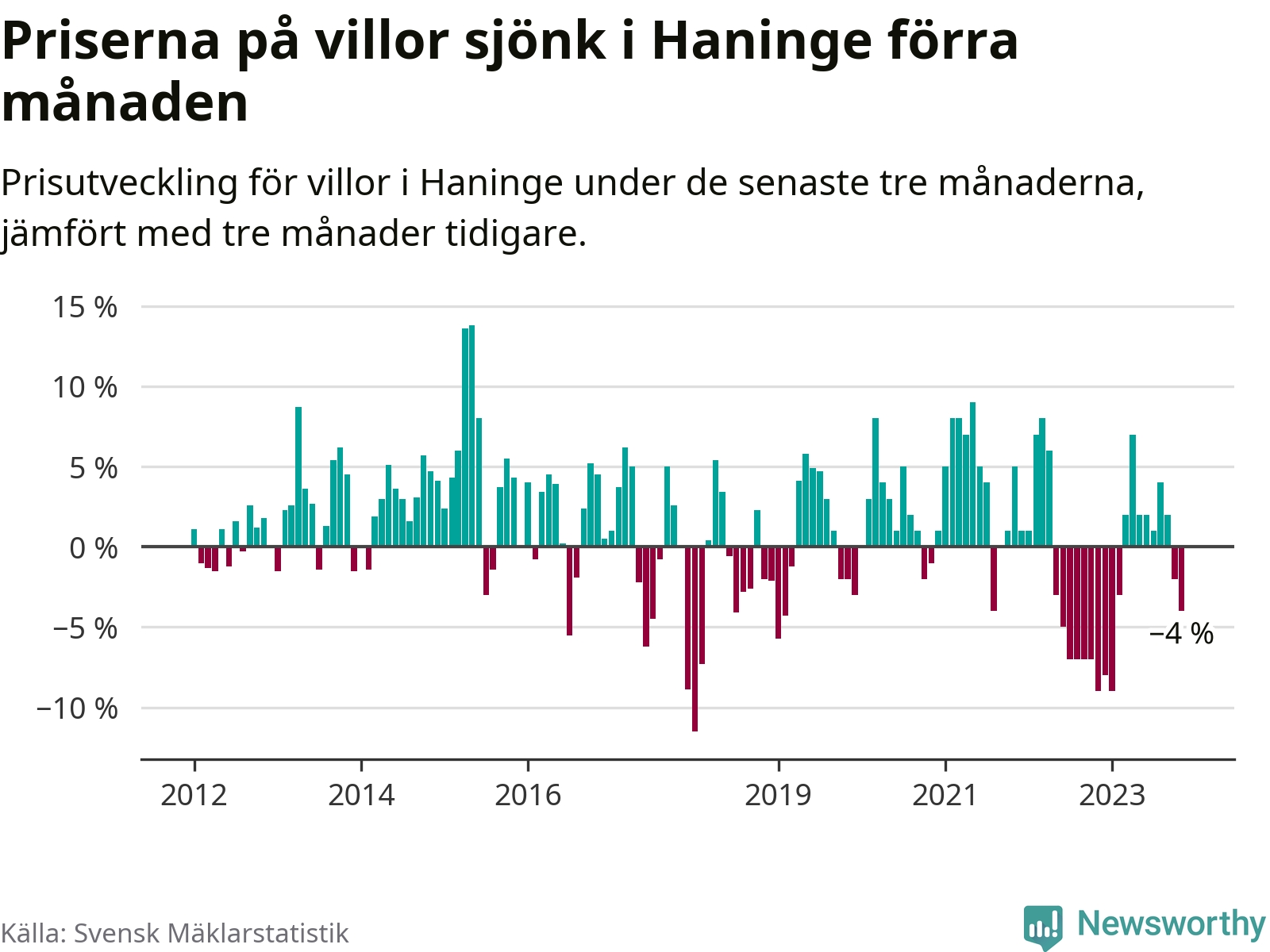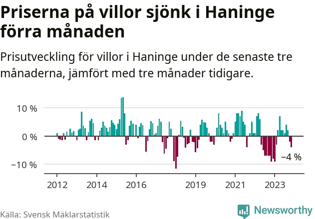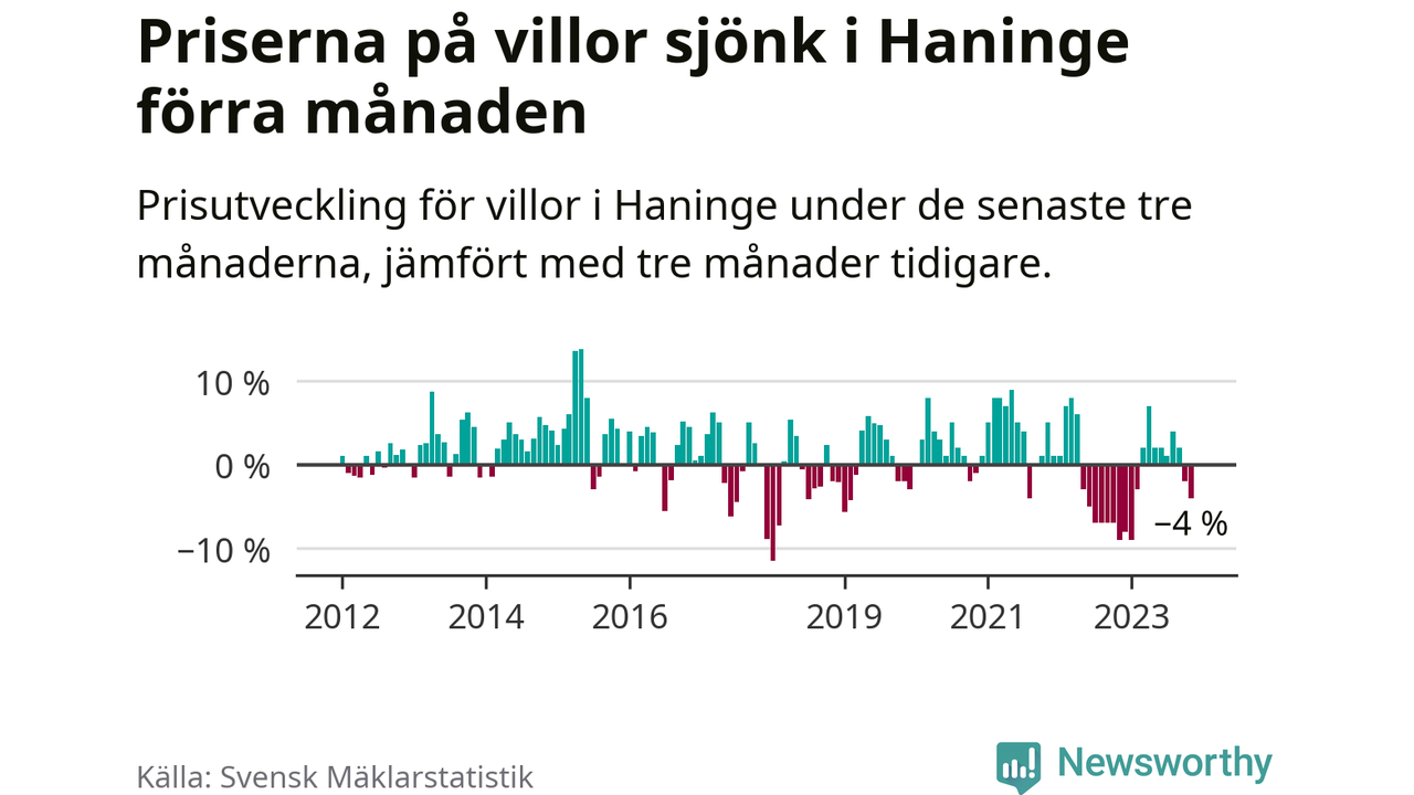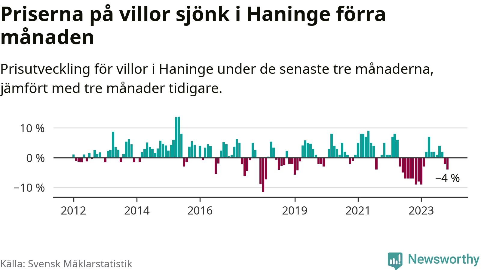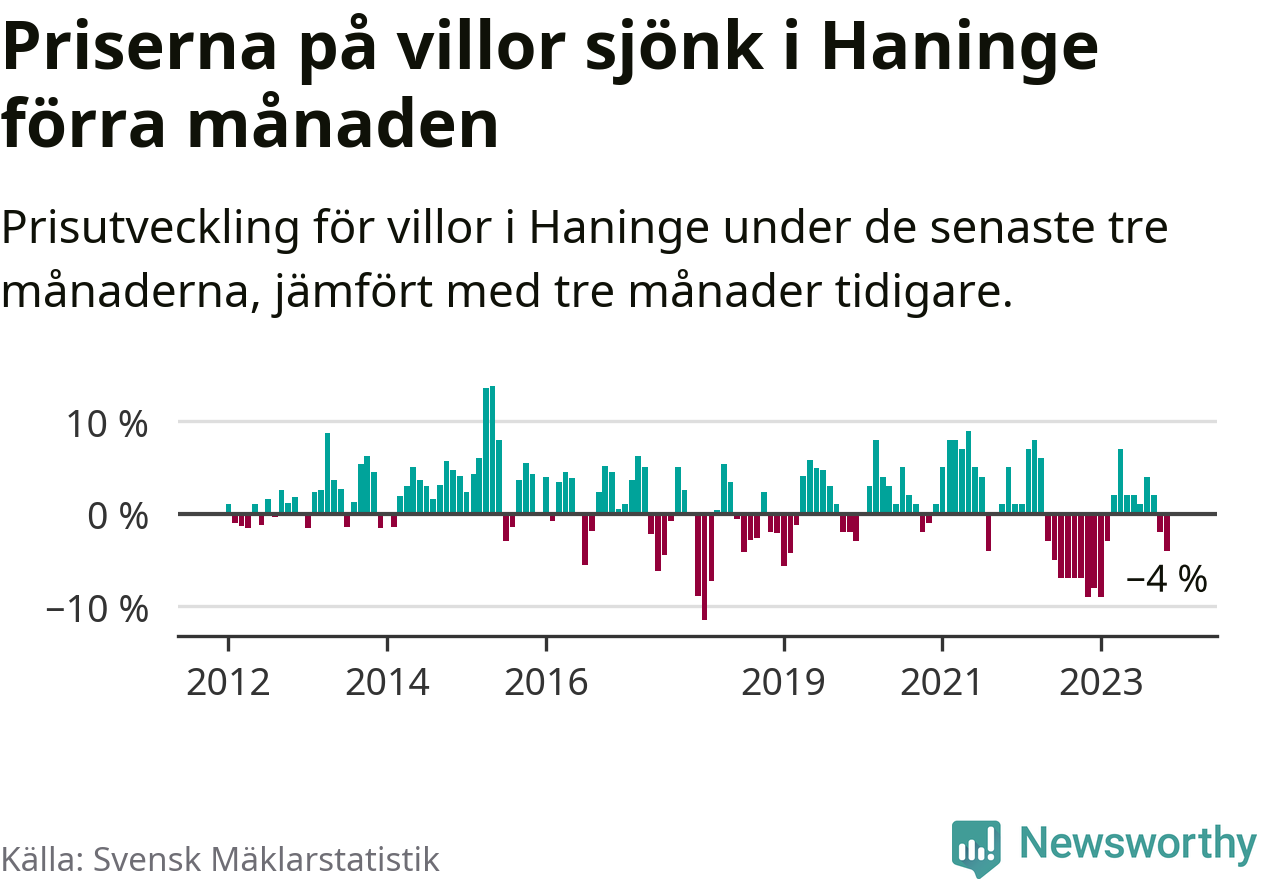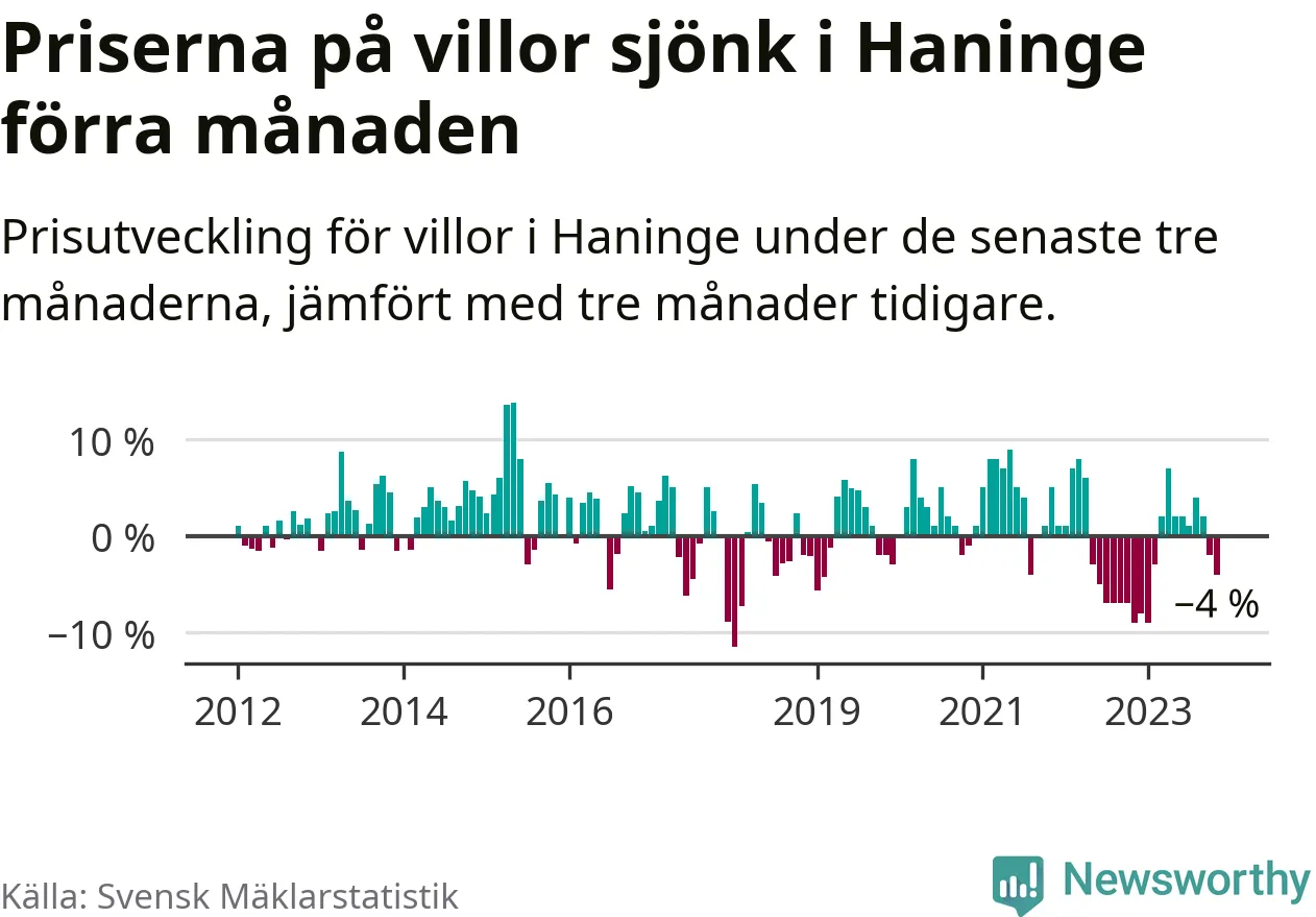 Statistiken visar även på en kännbar prisnedgång i Haninge kommun. Medelpriset på försäljningarna av villor i kommunen var 4 procent lägre än för tre månader sedan. Även i hela Stockholms län sjunker villapriserna. I hela länet noterades en prisnedgång på 3 procent.