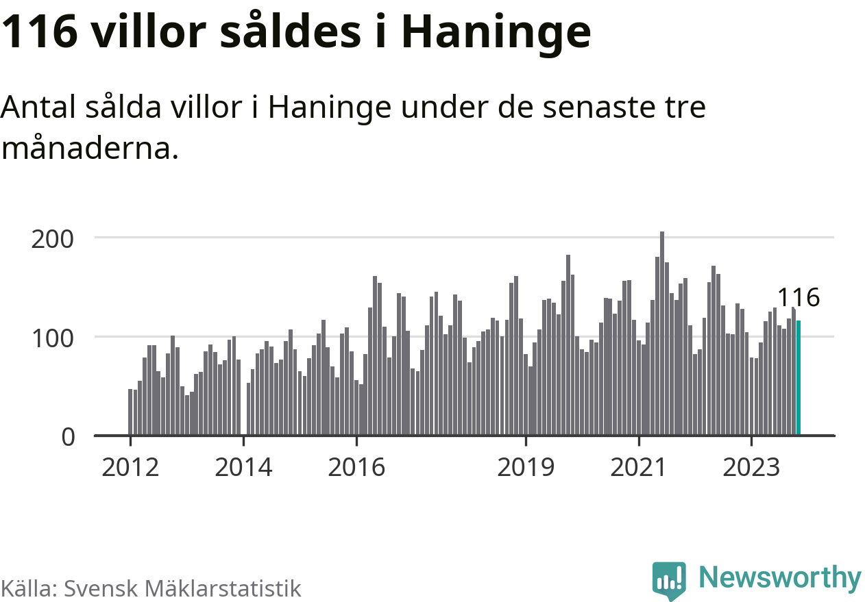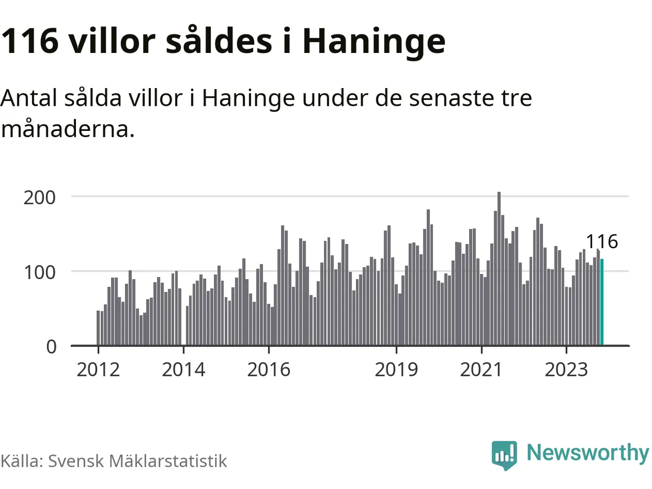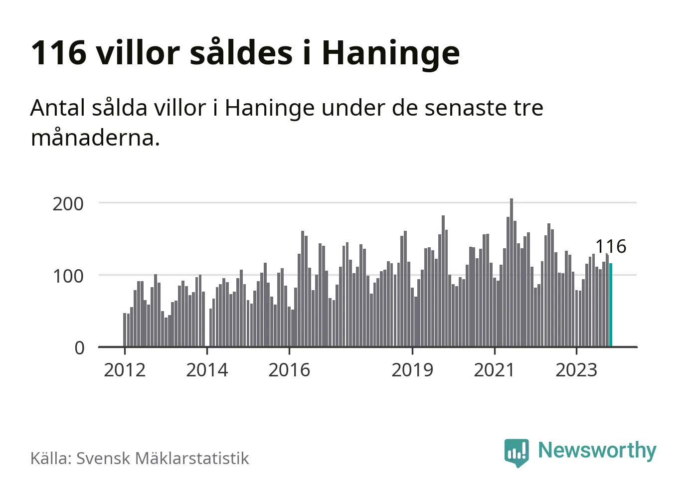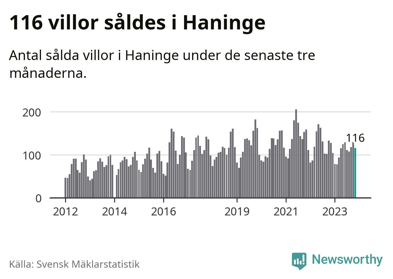 Mellan september och november såldes 116 villor i Haninge kommun. Det är relativt få sett till aktiviteten på bostadsmarknaden i kommunen under de senaste tolv månaderna, samt det historiska snittet för den här tiden på året.
