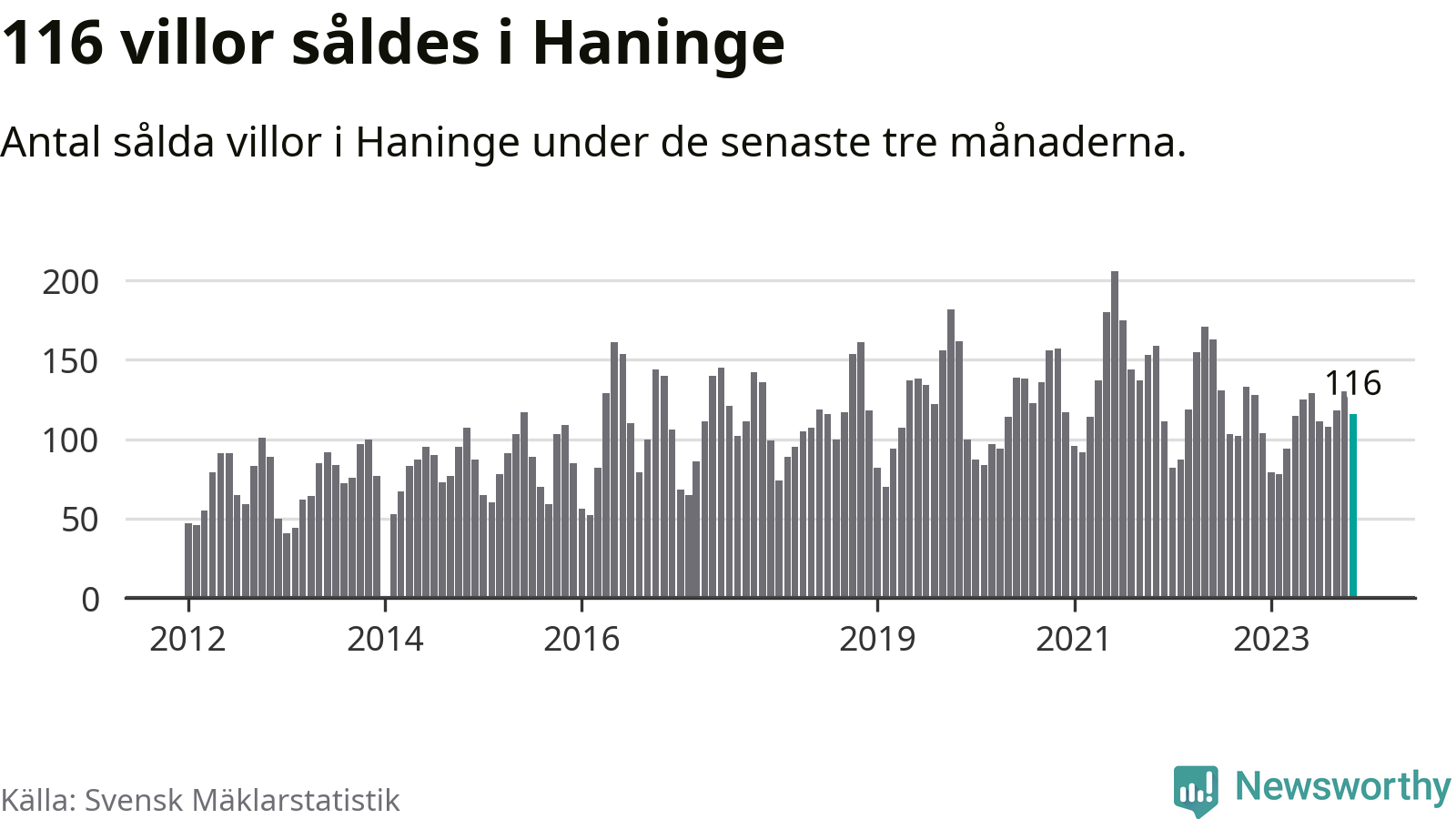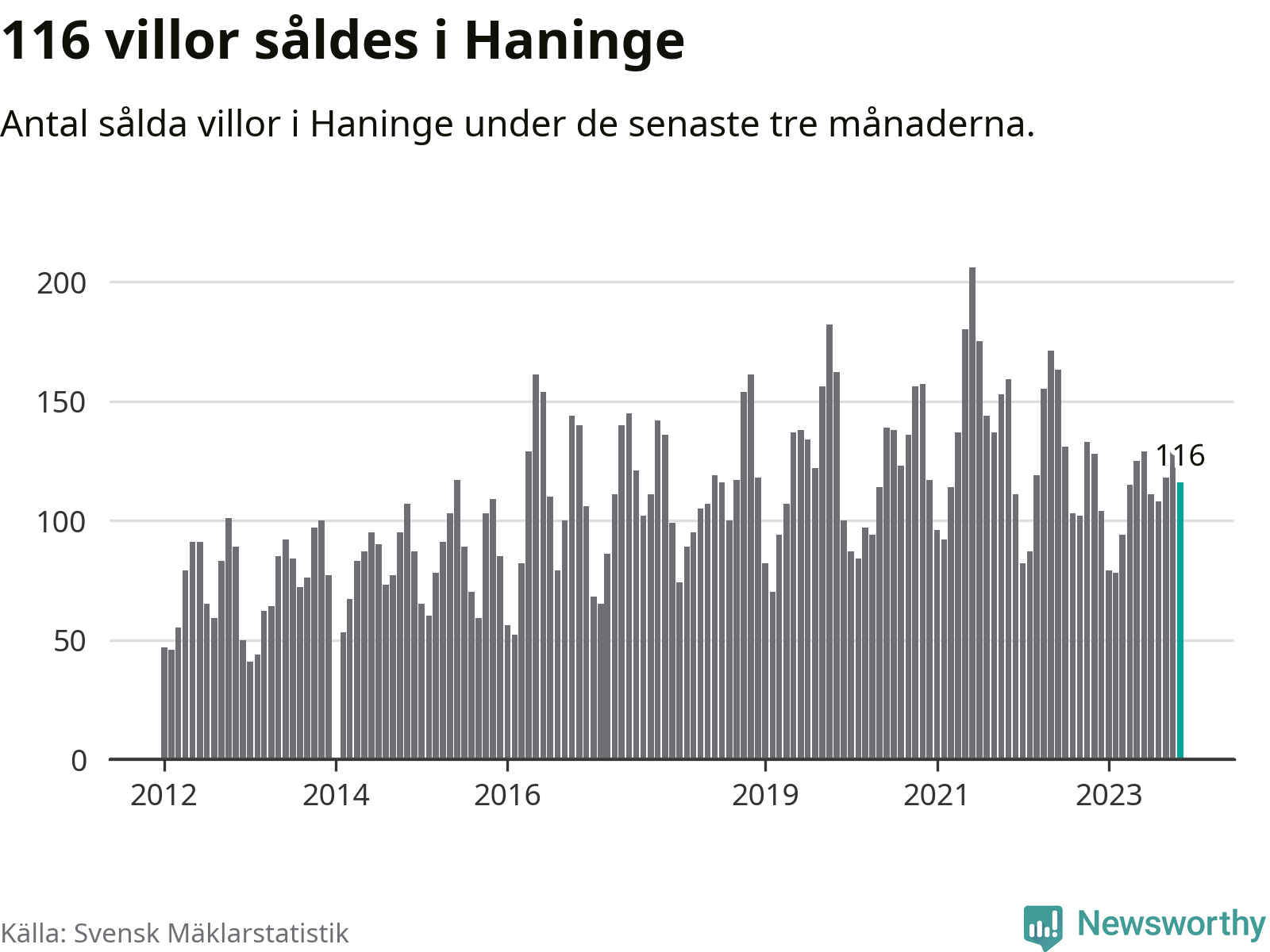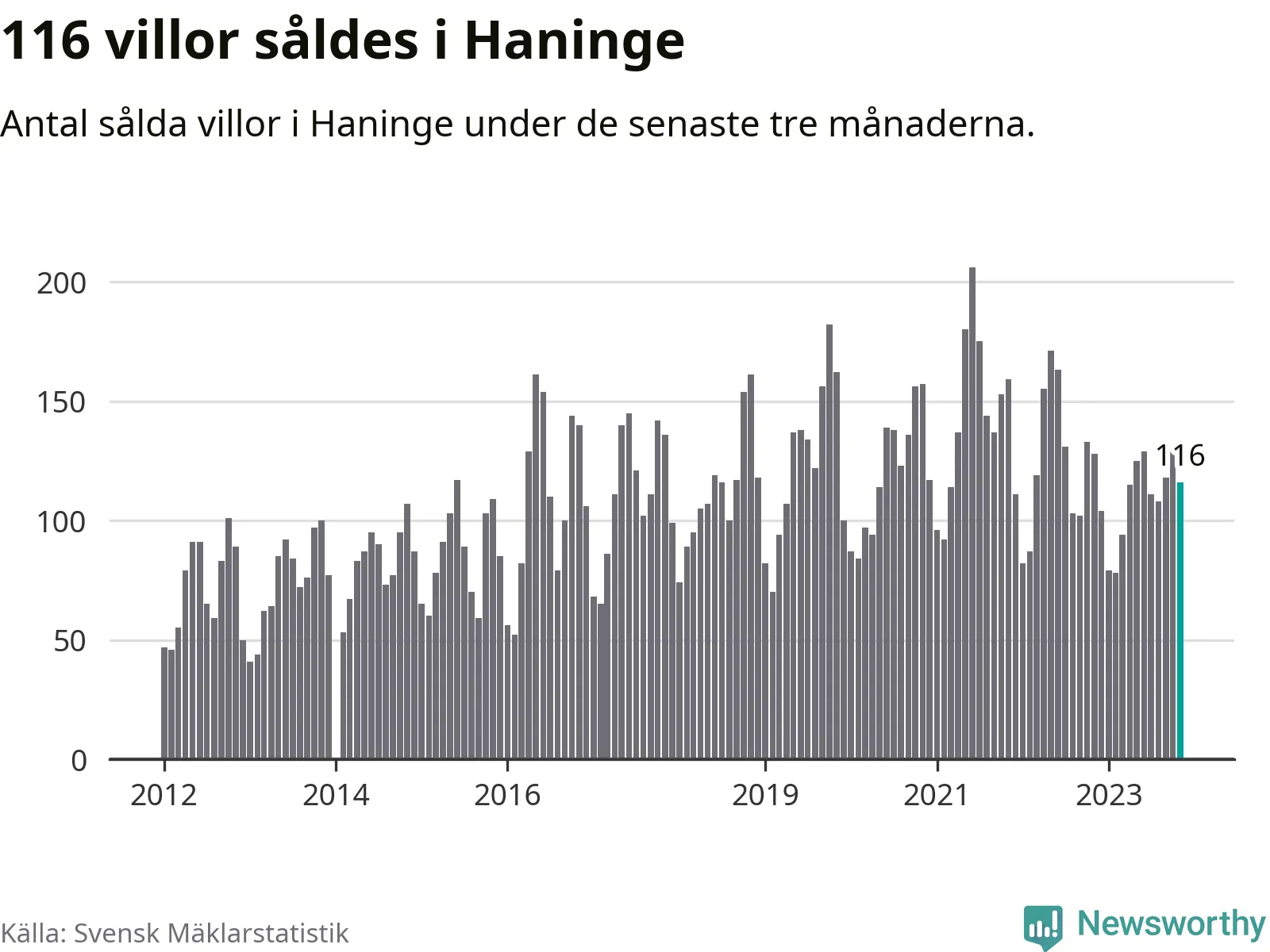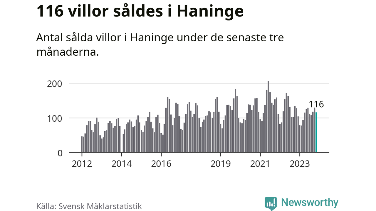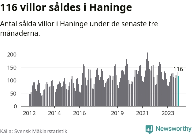 Mellan september och november såldes 116 villor i Haninge kommun. Det är relativt få sett till aktiviteten på bostadsmarknaden i kommunen under de senaste tolv månaderna, samt det historiska snittet för den här tiden på året.