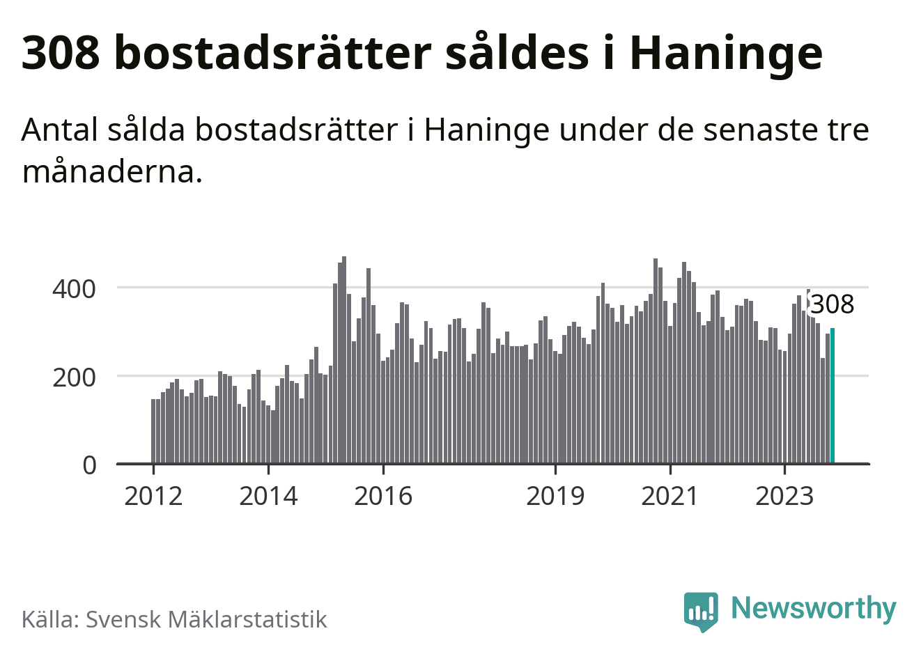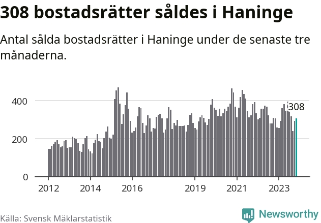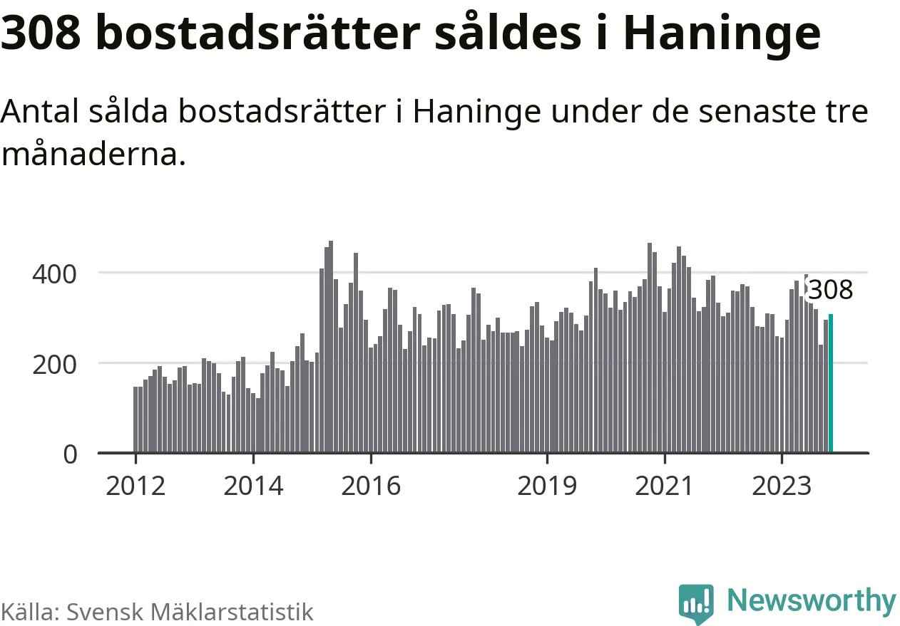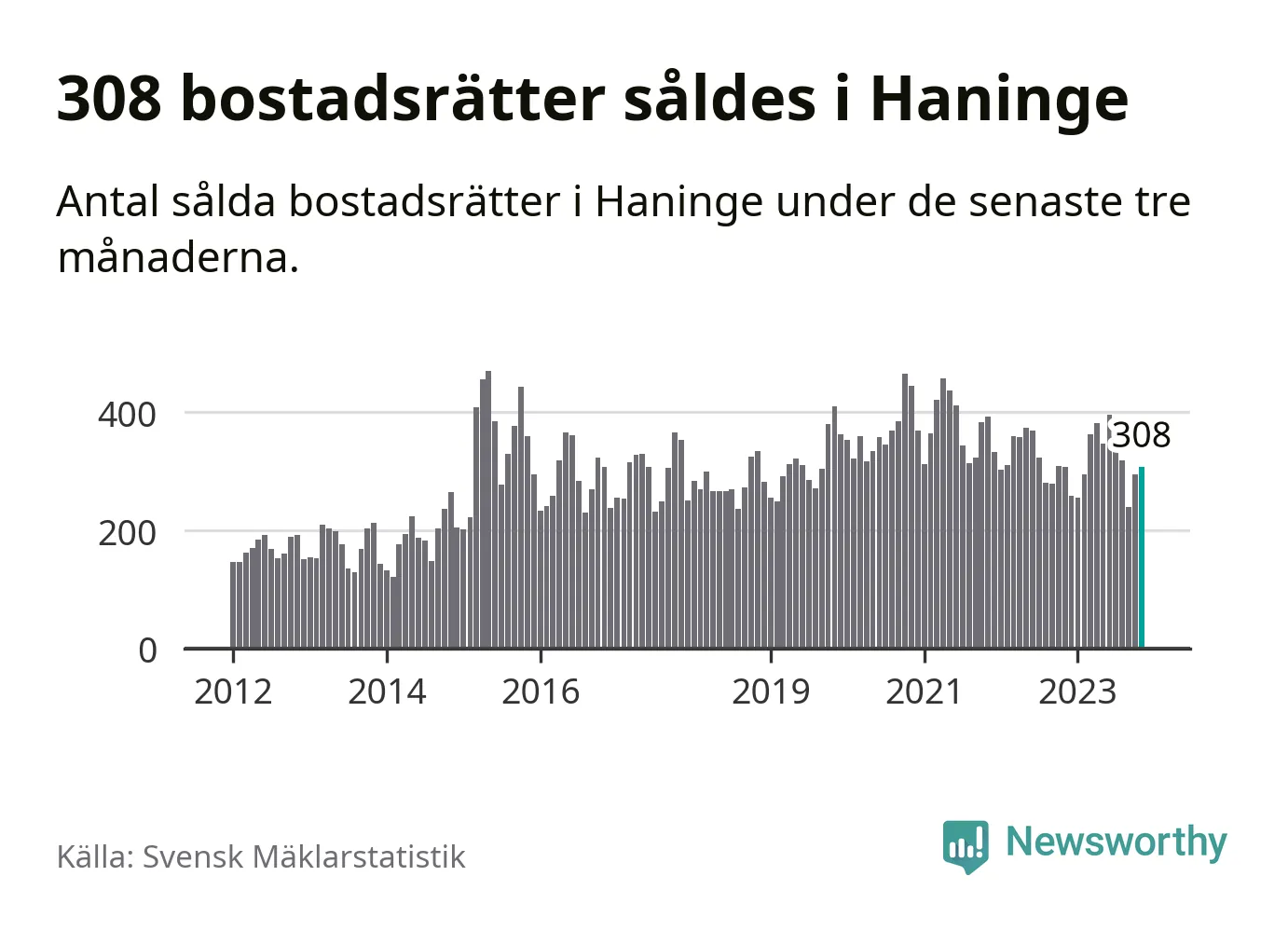Sammanlagt såldes 308 bostadsrätter i Haninge kommun mellan september och november till ett genomsnittligt pris på 2,2 miljoner kronor. I fjol gjordes 308 affärer vid den här tiden på året.