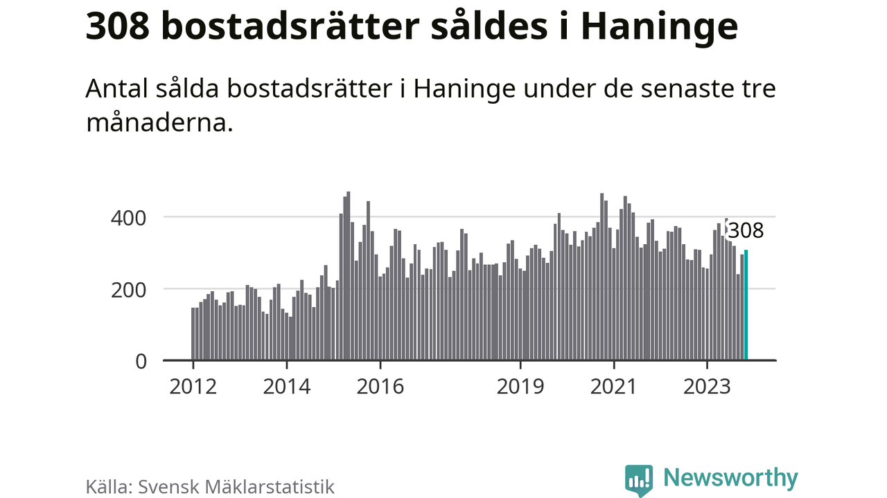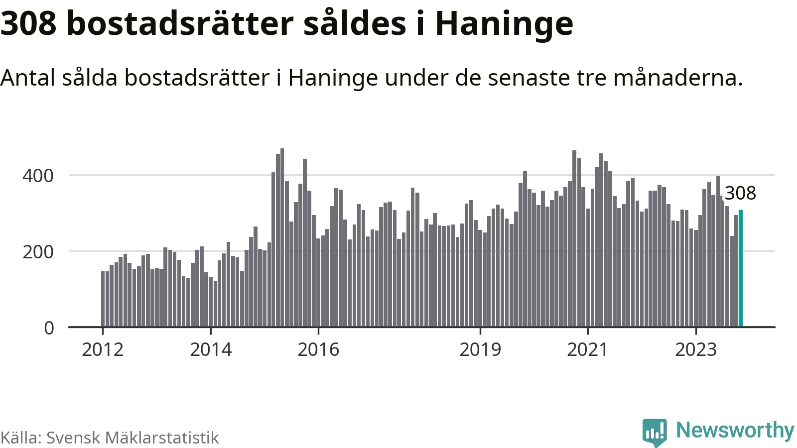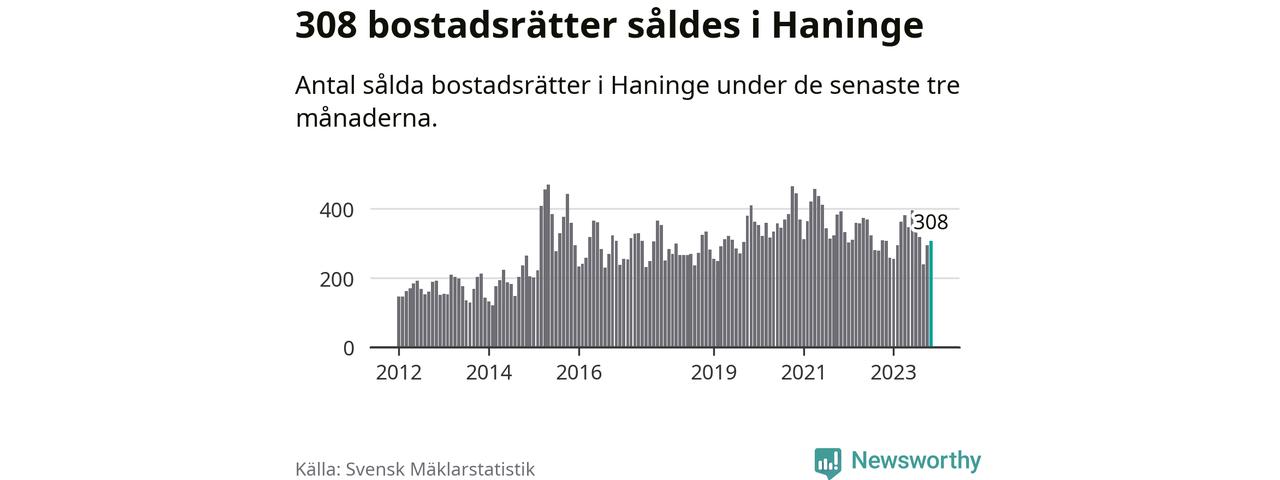 Sammanlagt såldes 308 bostadsrätter i Haninge kommun mellan september och november till ett genomsnittligt pris på 2,2 miljoner kronor. I fjol gjordes 308 affärer vid den här tiden på året.