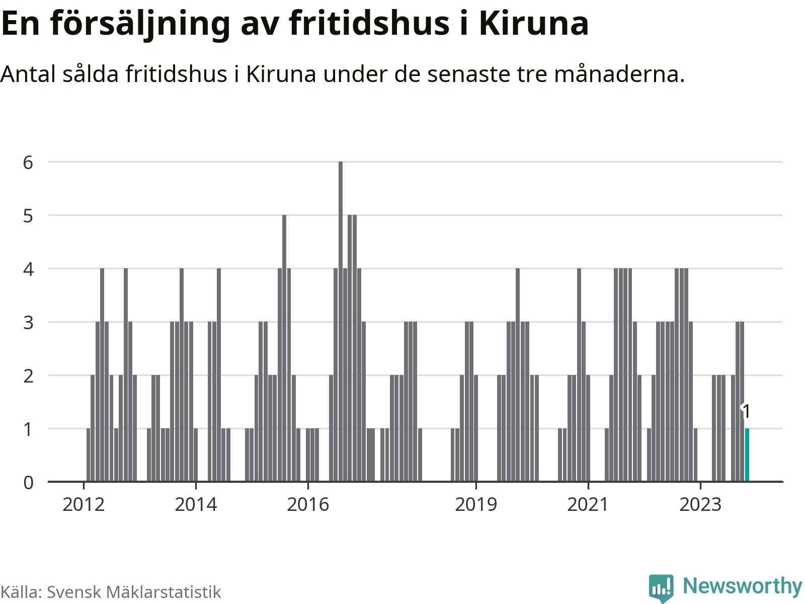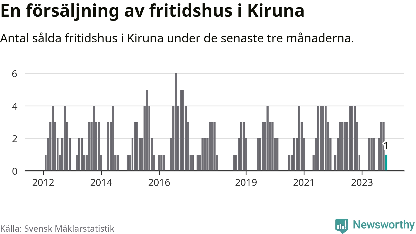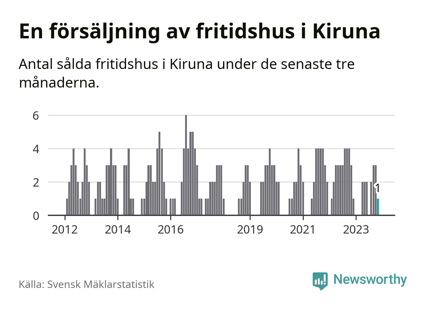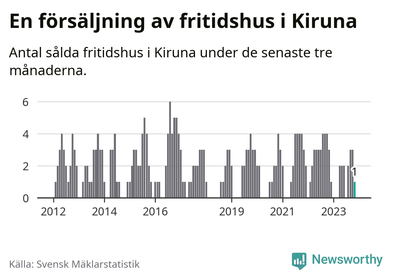 Mellan september och november gjordes sammanlagt en affär med fritidshus i Kiruna kommun. Det kan jämföras med tre vid motsvarande tid i fjol.