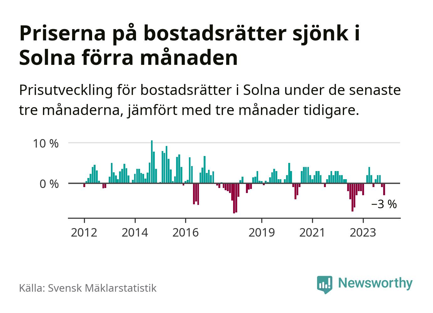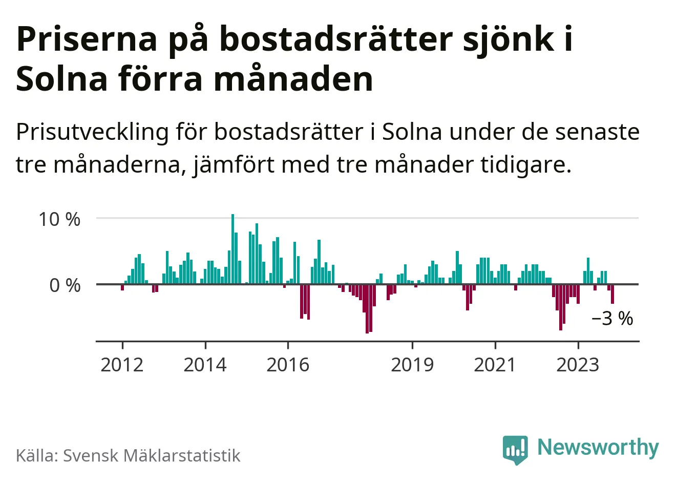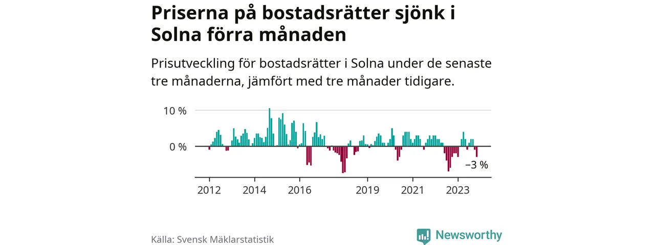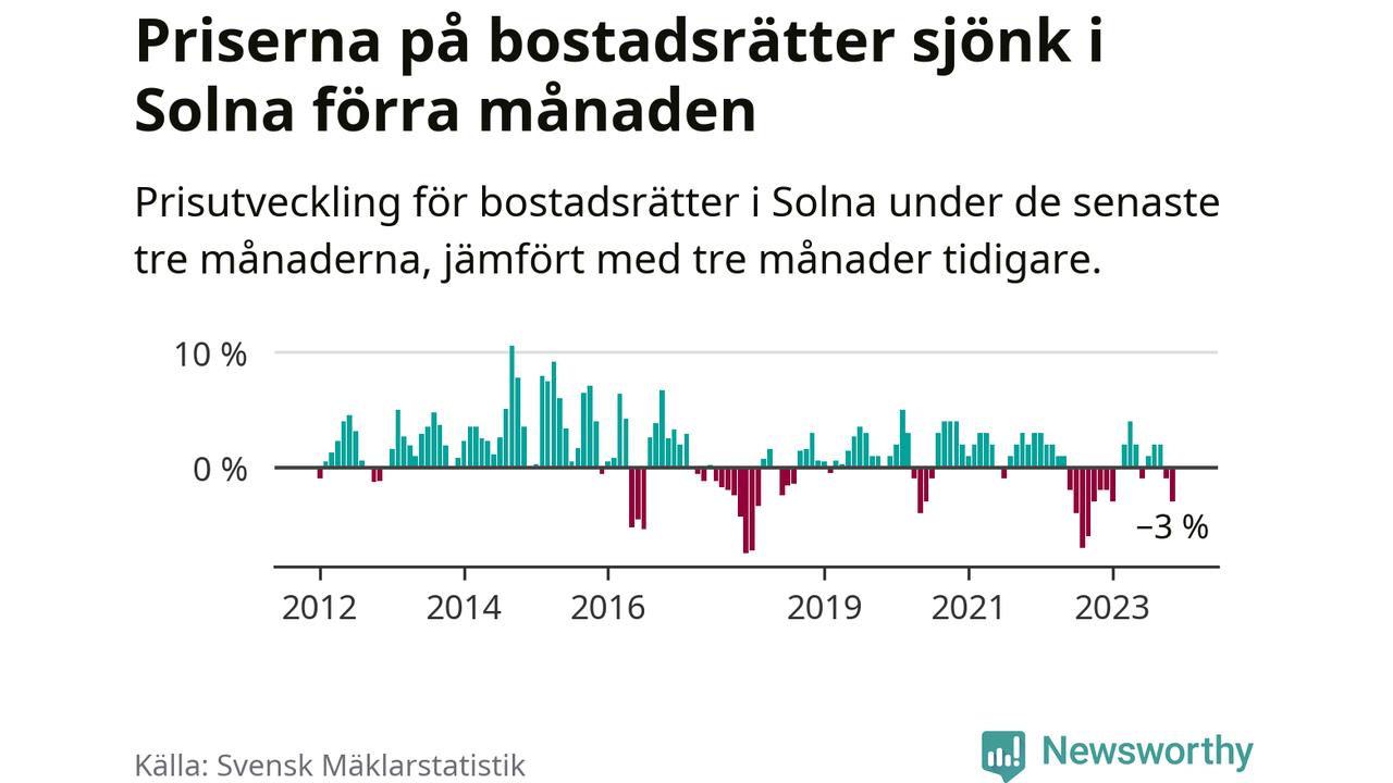 Priserna på bostadsrätter har gått ner i Solna kommun. Medelpriset på försäljningarna under de senaste tre månaderna visar på en nedgång med 3 procent.