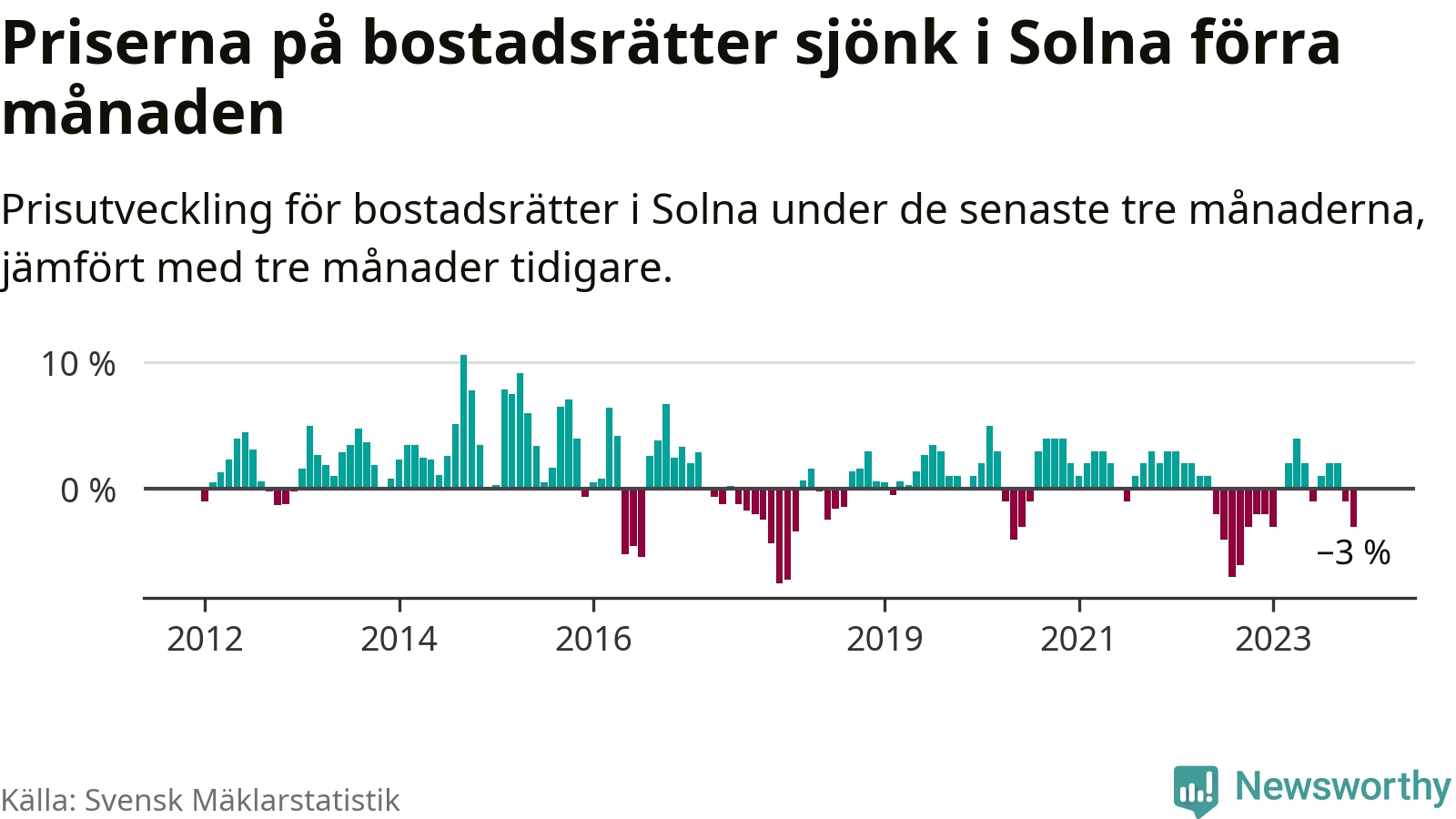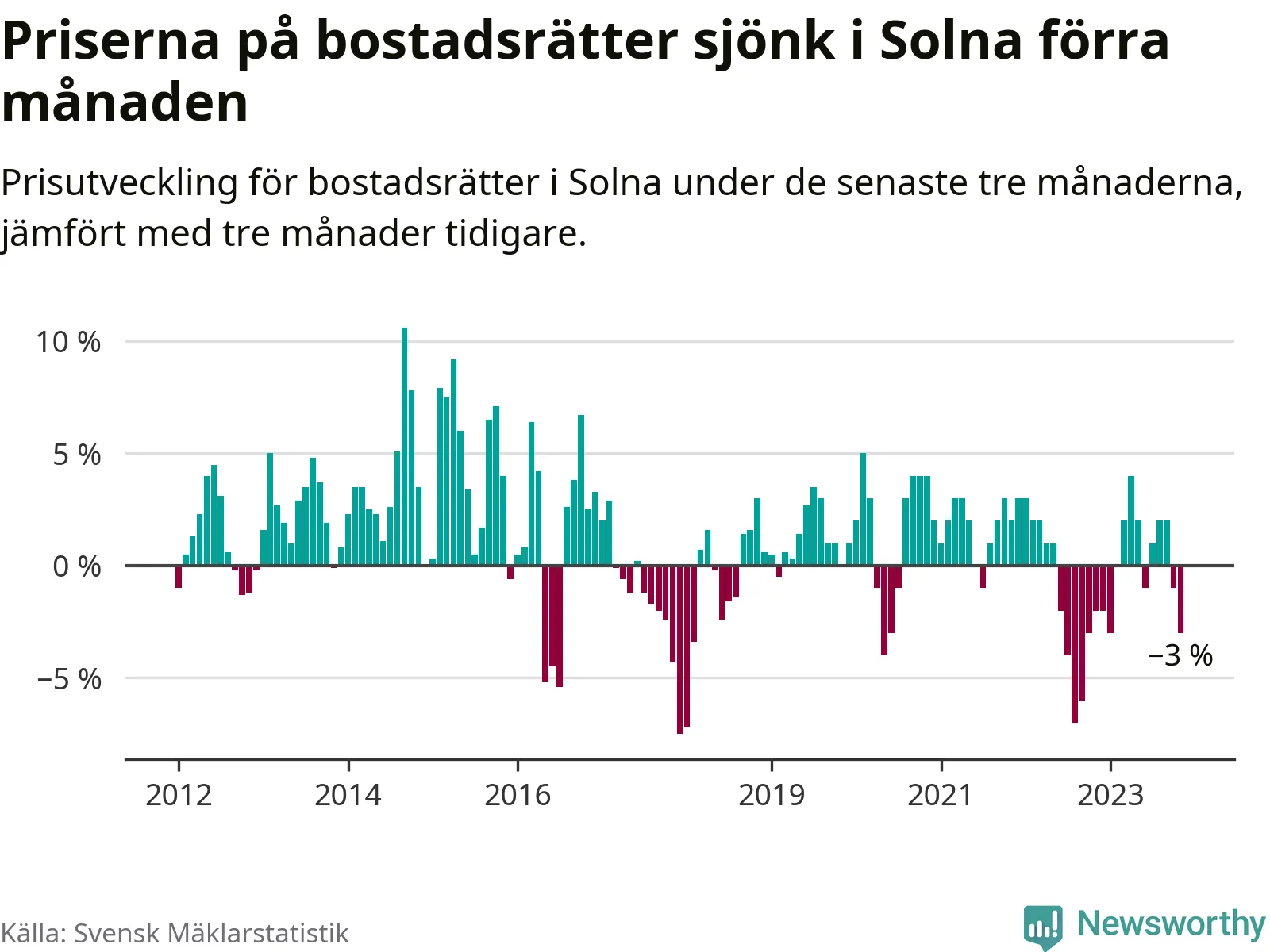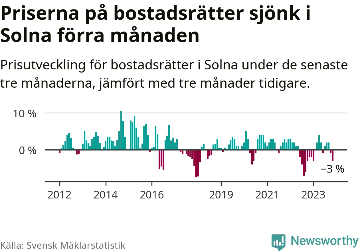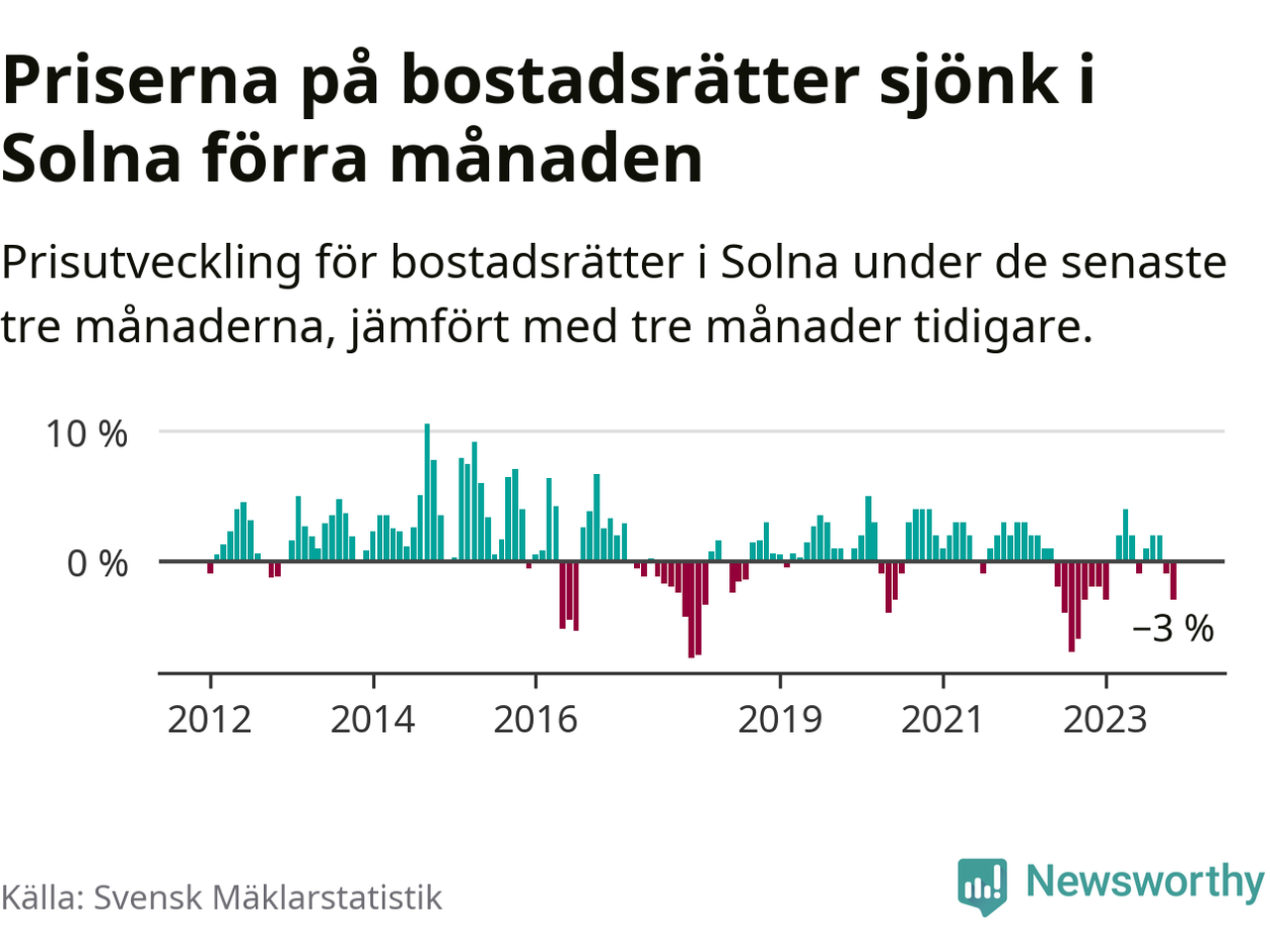 Priserna på bostadsrätter har gått ner i Solna kommun. Medelpriset på försäljningarna under de senaste tre månaderna visar på en nedgång med 3 procent.