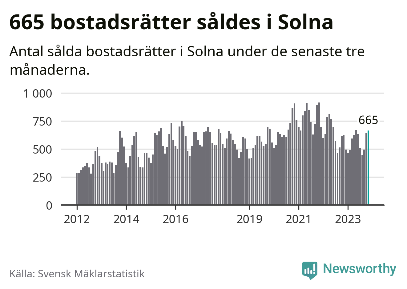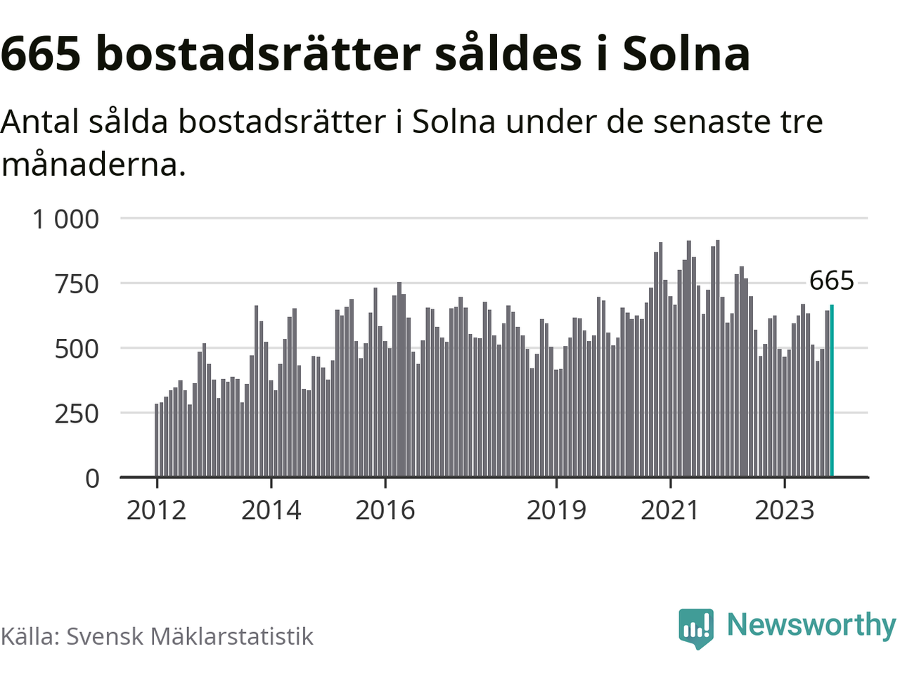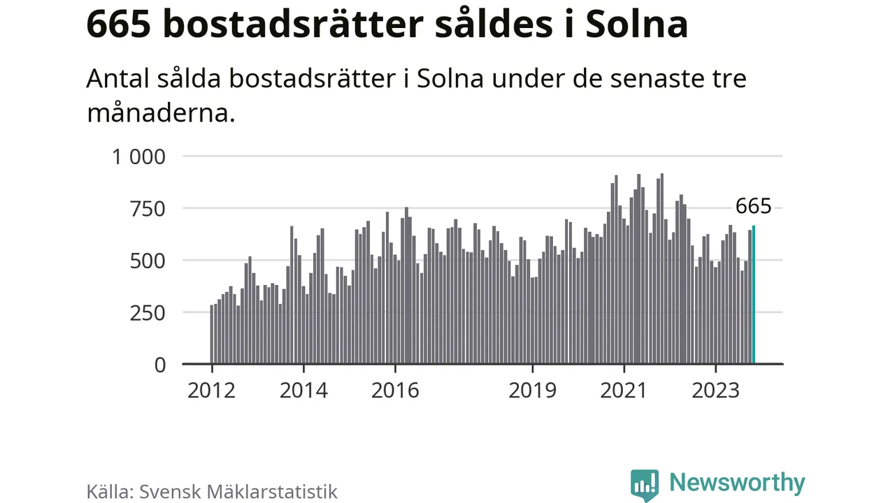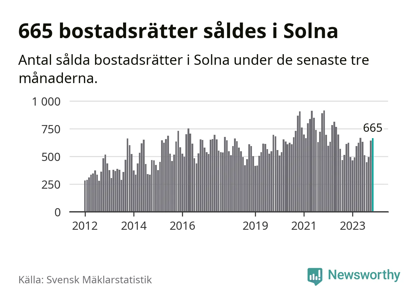 Sammanlagt såldes 665 bostadsrätter i Solna kommun mellan september och november till ett genomsnittligt pris på 3,9 miljoner kronor. I fjol gjordes 624 affärer vid den här tiden på året.