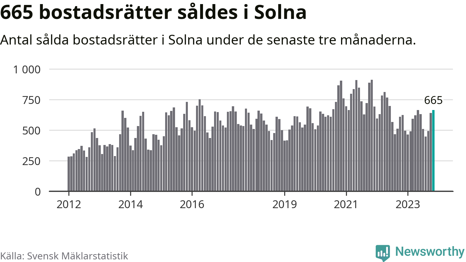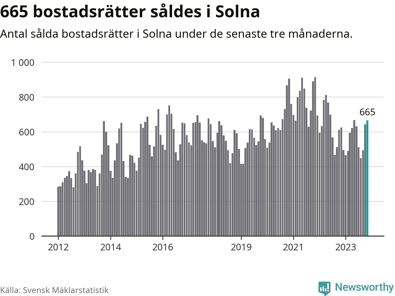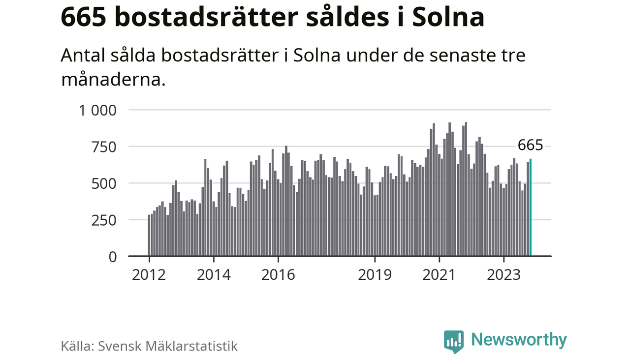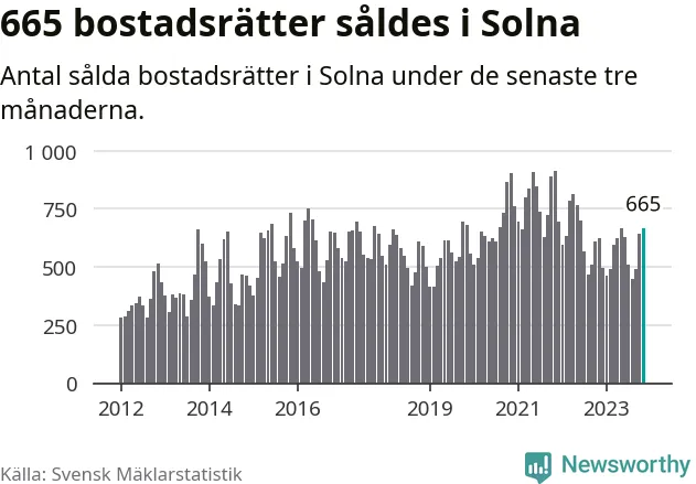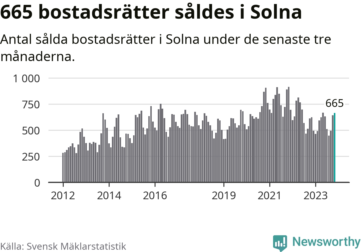 Sammanlagt såldes 665 bostadsrätter i Solna kommun mellan september och november till ett genomsnittligt pris på 3,9 miljoner kronor. I fjol gjordes 624 affärer vid den här tiden på året.