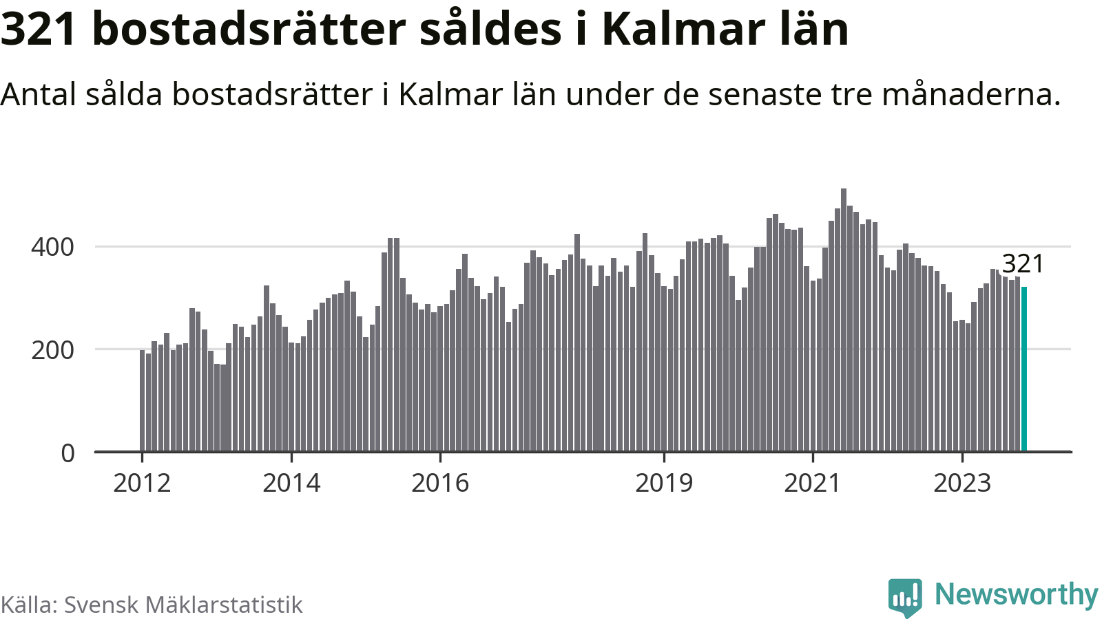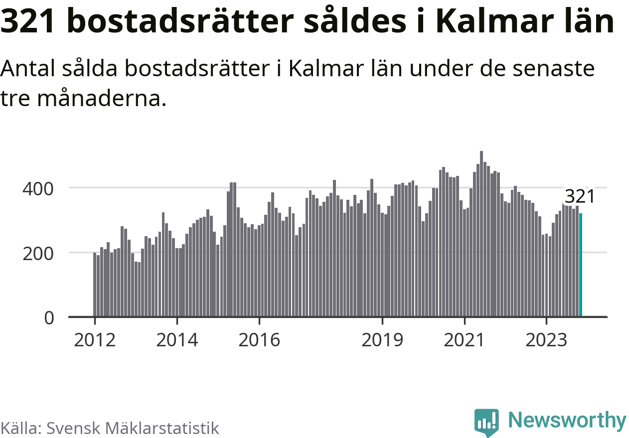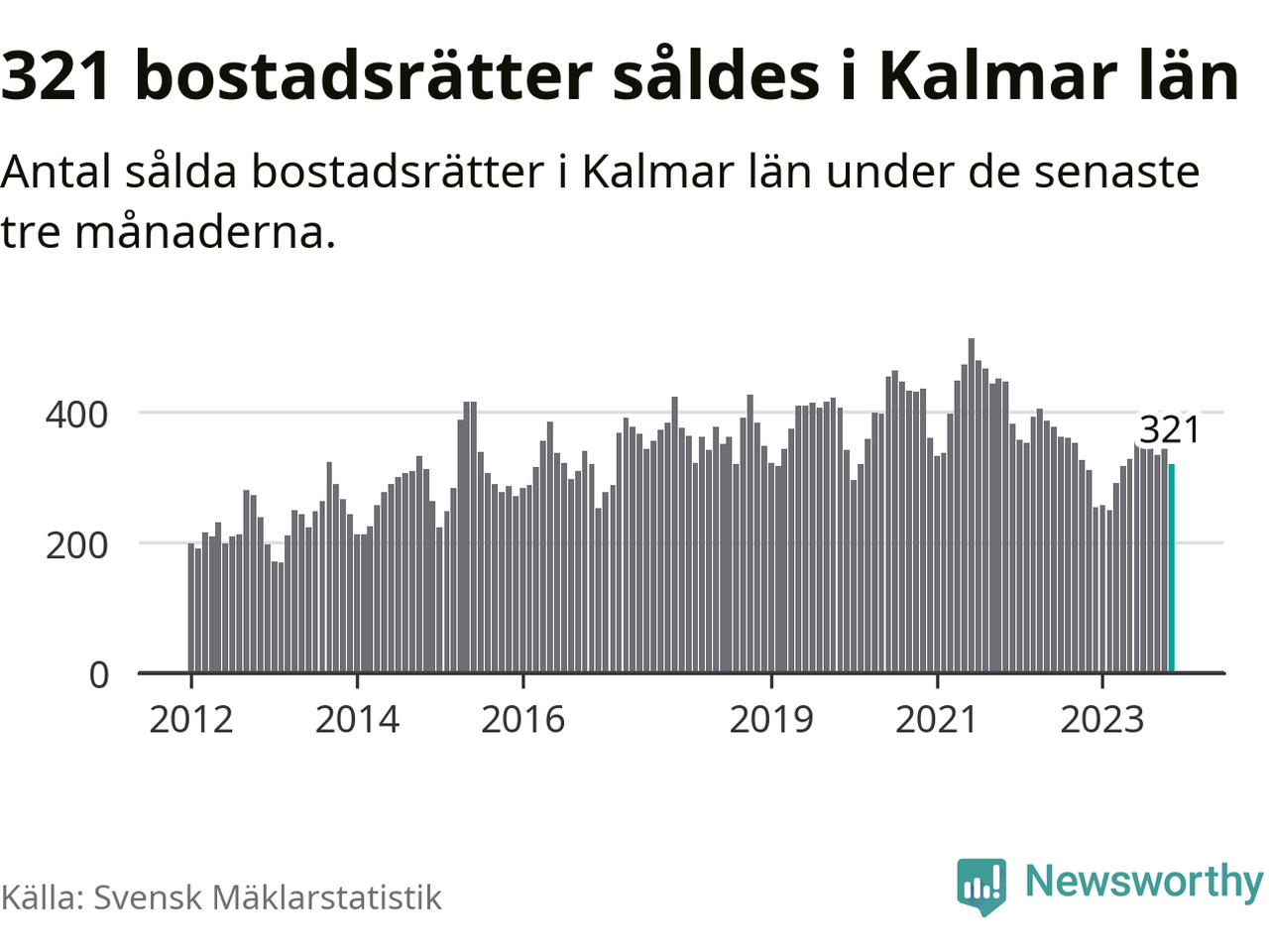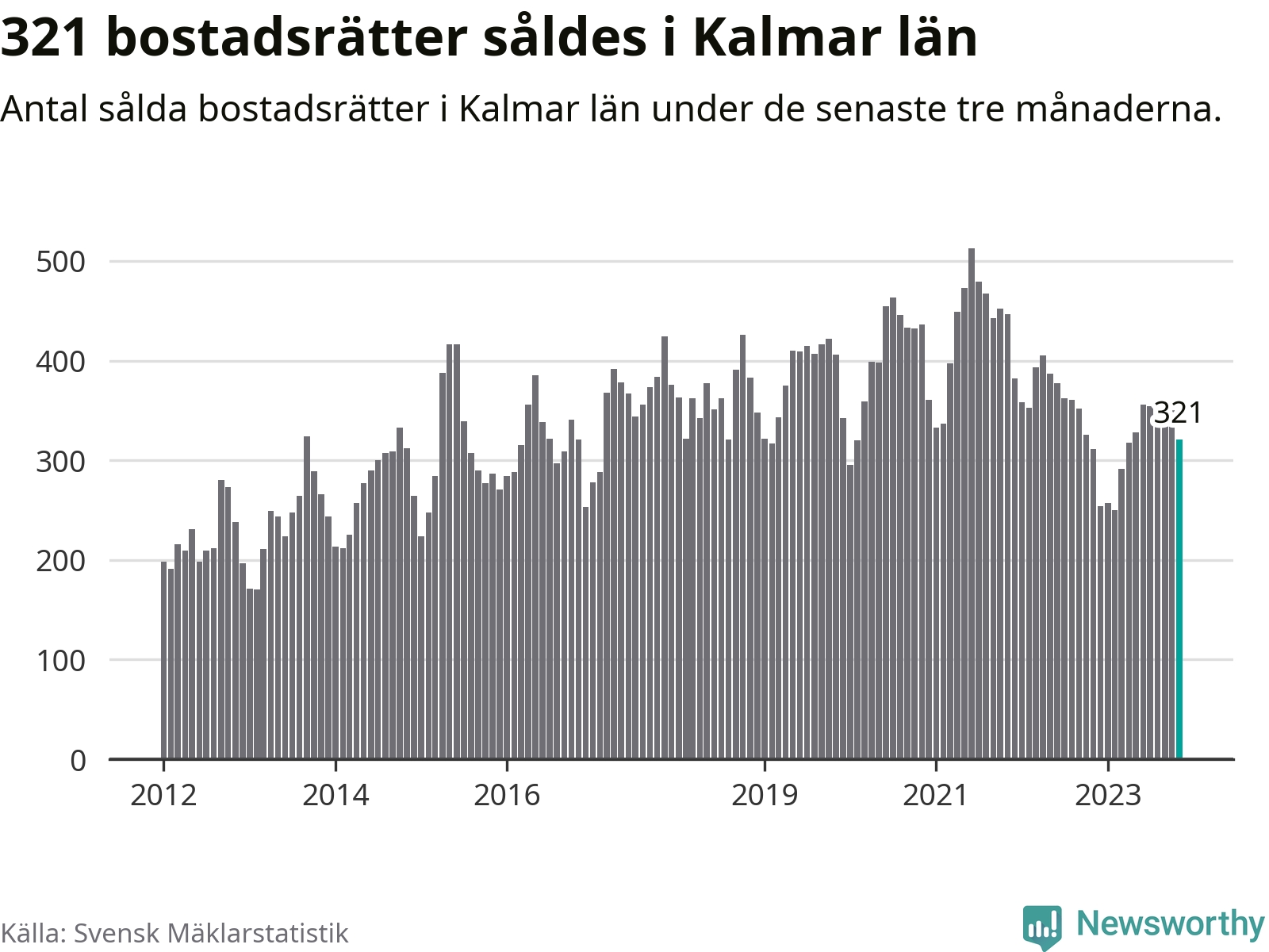 Sammanlagt såldes 321 bostadsrätter i Kalmar län mellan september och november till ett genomsnittligt pris på 1,5 miljoner kronor. I fjol gjordes 311 affärer vid den här tiden på året.