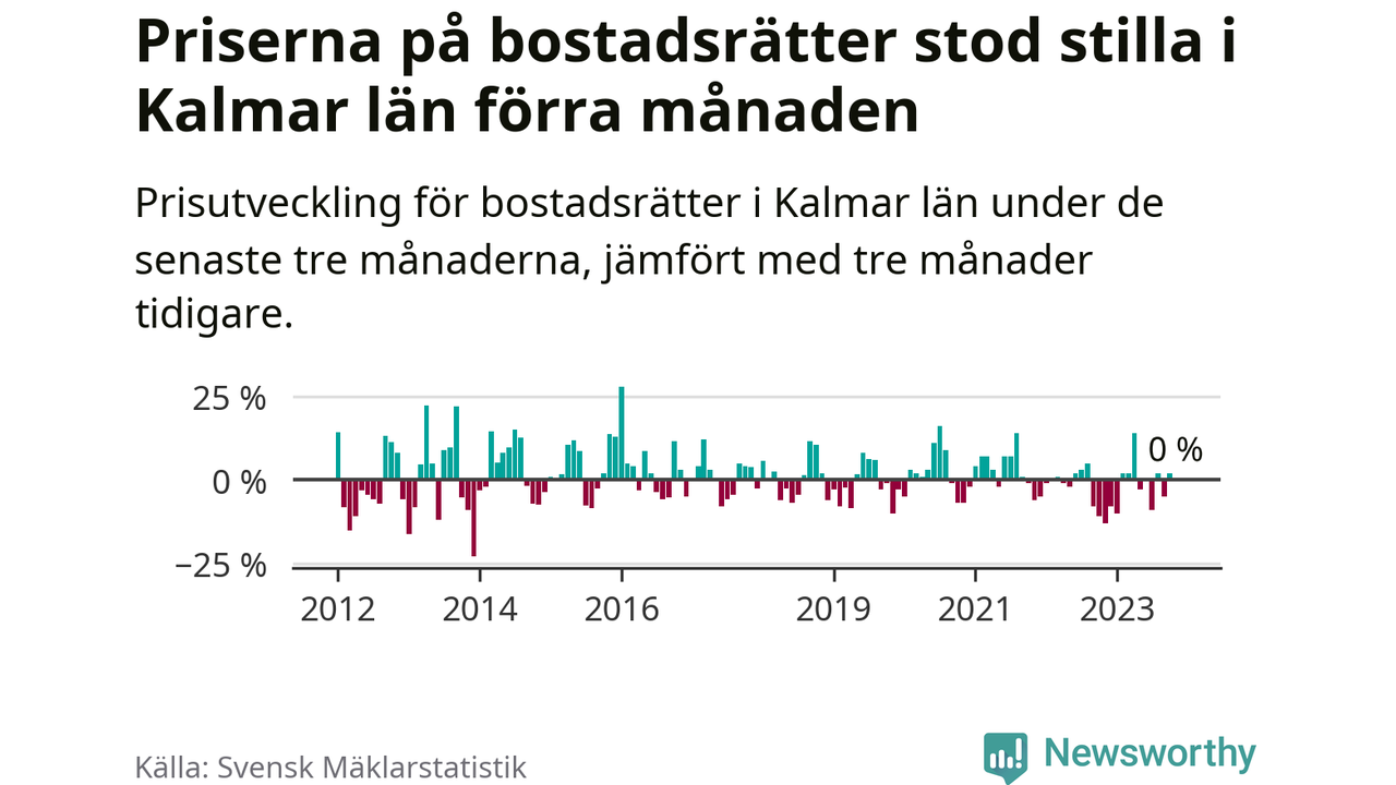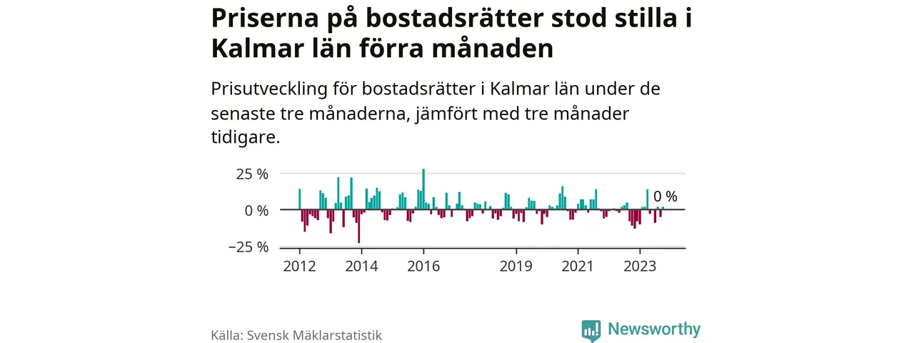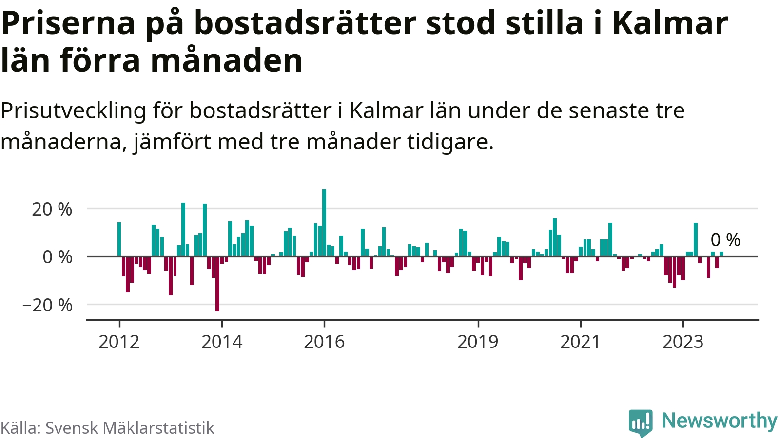 Priserna på bostadsrätter står i stort sett stilla i Kalmar län. Medelpriset på de på försäljningarna under de senaste tre månaderna låg på samma nivå som för tre månader sedan.