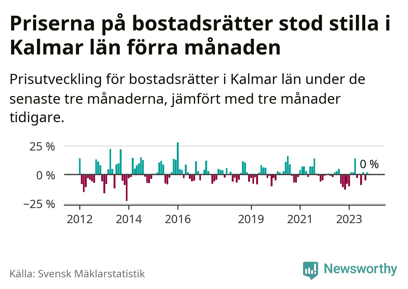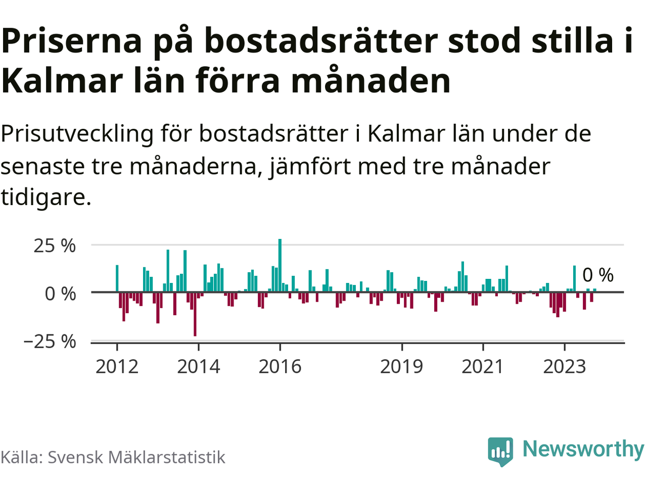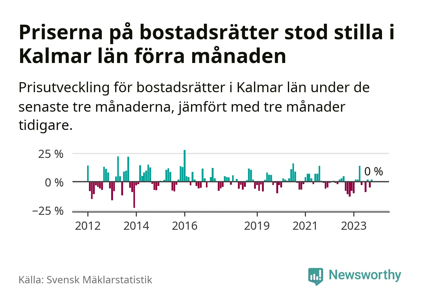 Bland kommunerna i Kalmar län stiger priserna på bostadsrätter i två av tre kommuner (där det redovisats uppgifter om prisutveckling). Störst var ökningen i Oskarshamn där priserna steg med 10 procent. I Västervik däremot sjönk priserna med 9 procent. Notera att det på grund av få försäljningar saknas uppgifter om prisförändringar för bostadsrätter i nio av länets tolv kommuner.