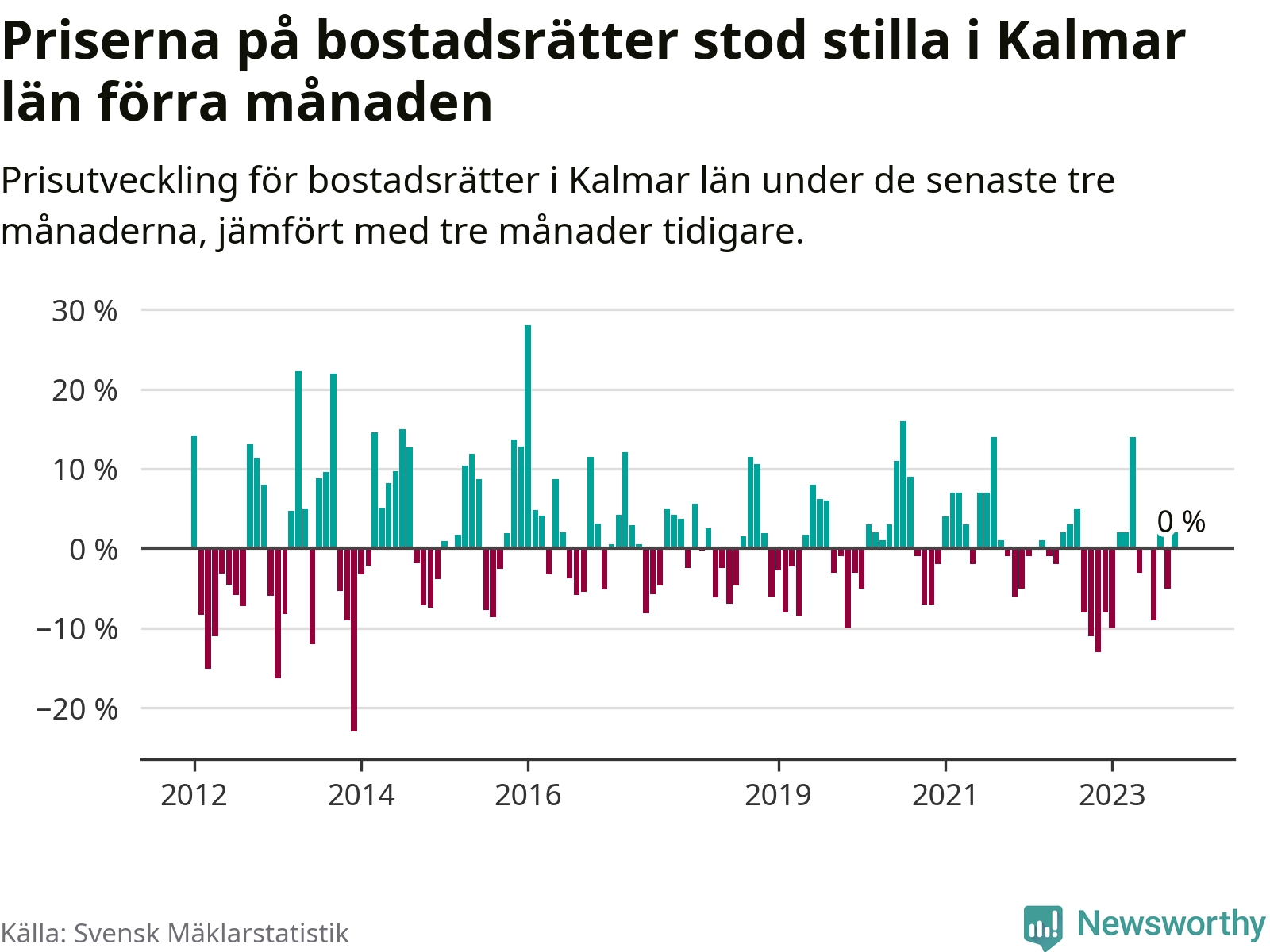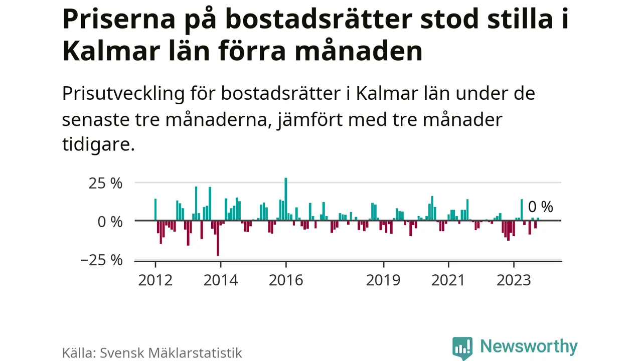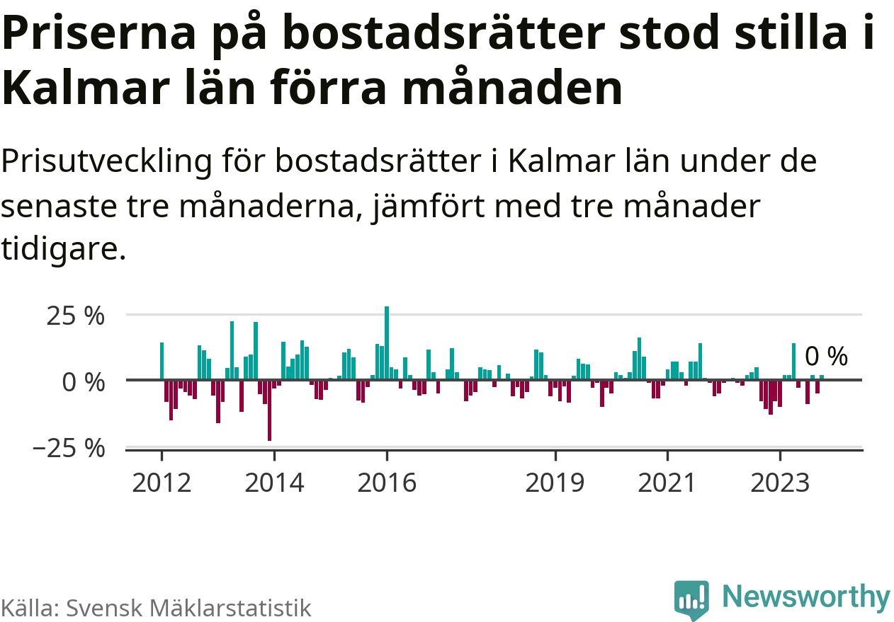 Bland kommunerna i Kalmar län stiger priserna på bostadsrätter i två av tre kommuner (där det redovisats uppgifter om prisutveckling). Störst var ökningen i Oskarshamn där priserna steg med 10 procent. I Västervik däremot sjönk priserna med 9 procent. Notera att det på grund av få försäljningar saknas uppgifter om prisförändringar för bostadsrätter i nio av länets tolv kommuner.