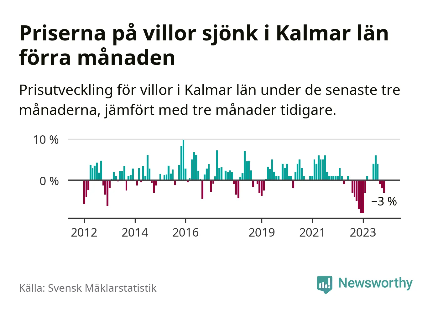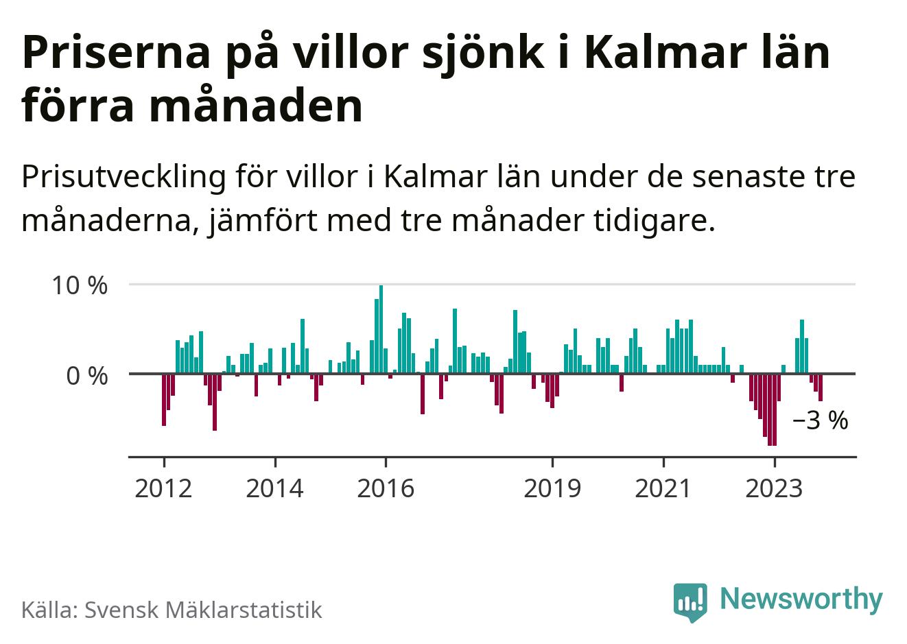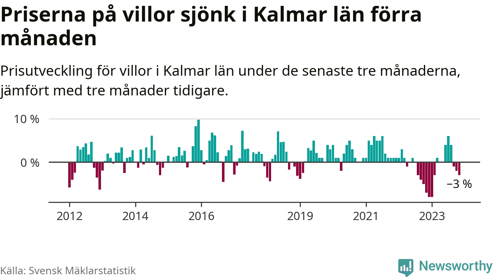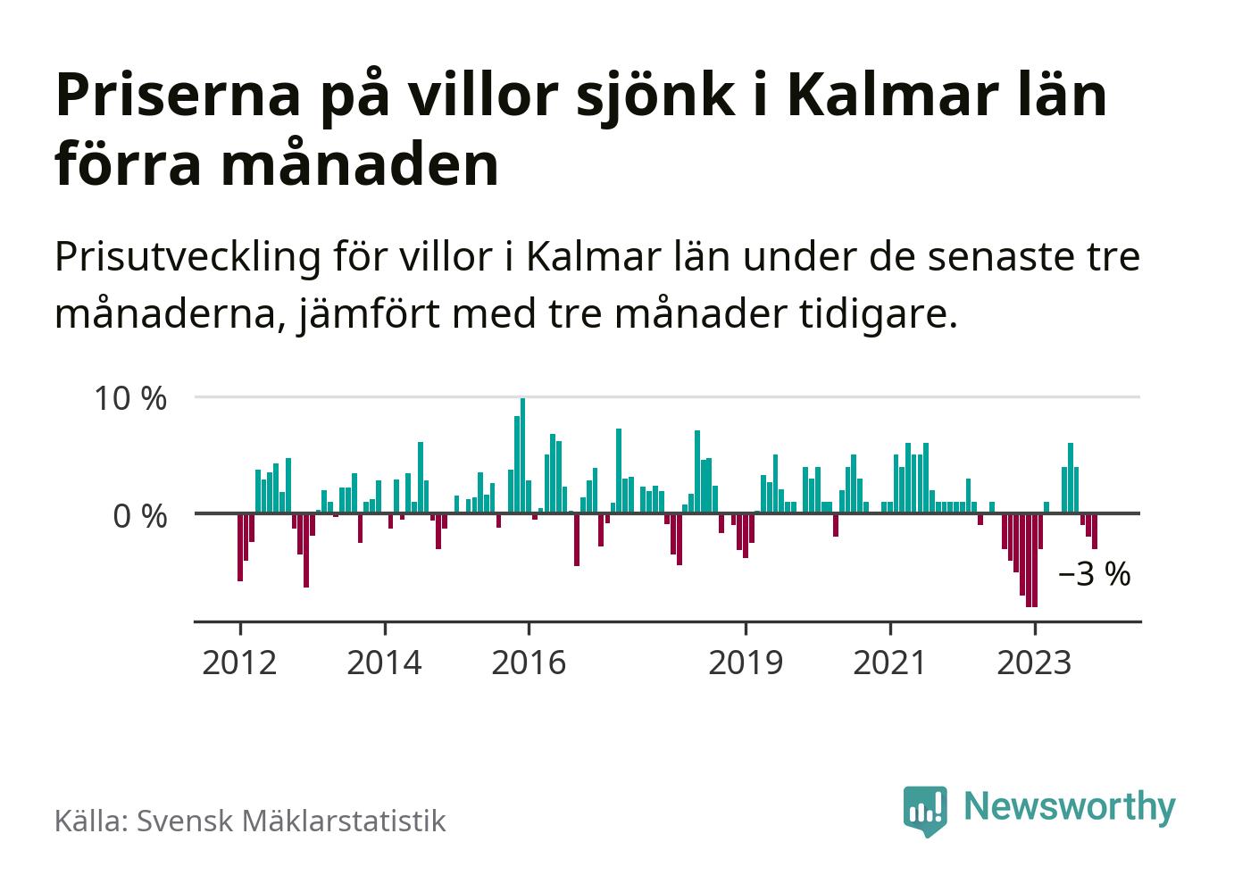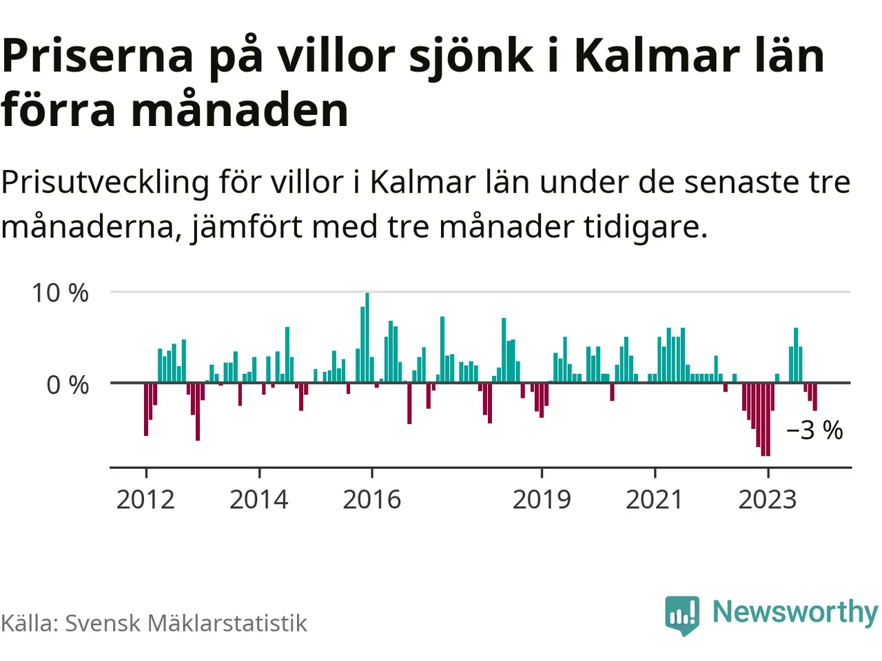 Villapriserna har gått ner i Kalmar län. Medelpriset på försäljningarna under de senaste tre månaderna visar på en nedgång med 3 procent.