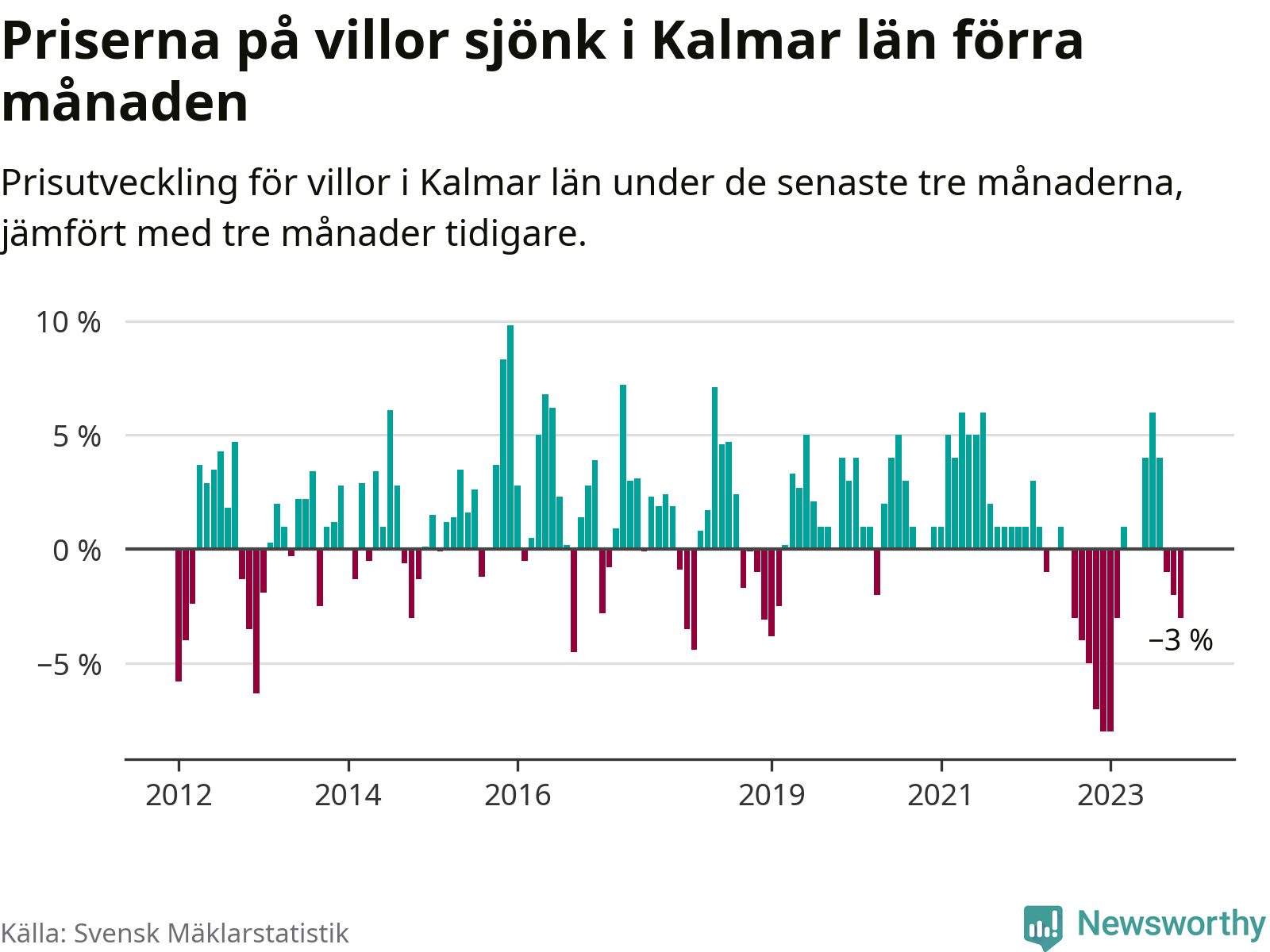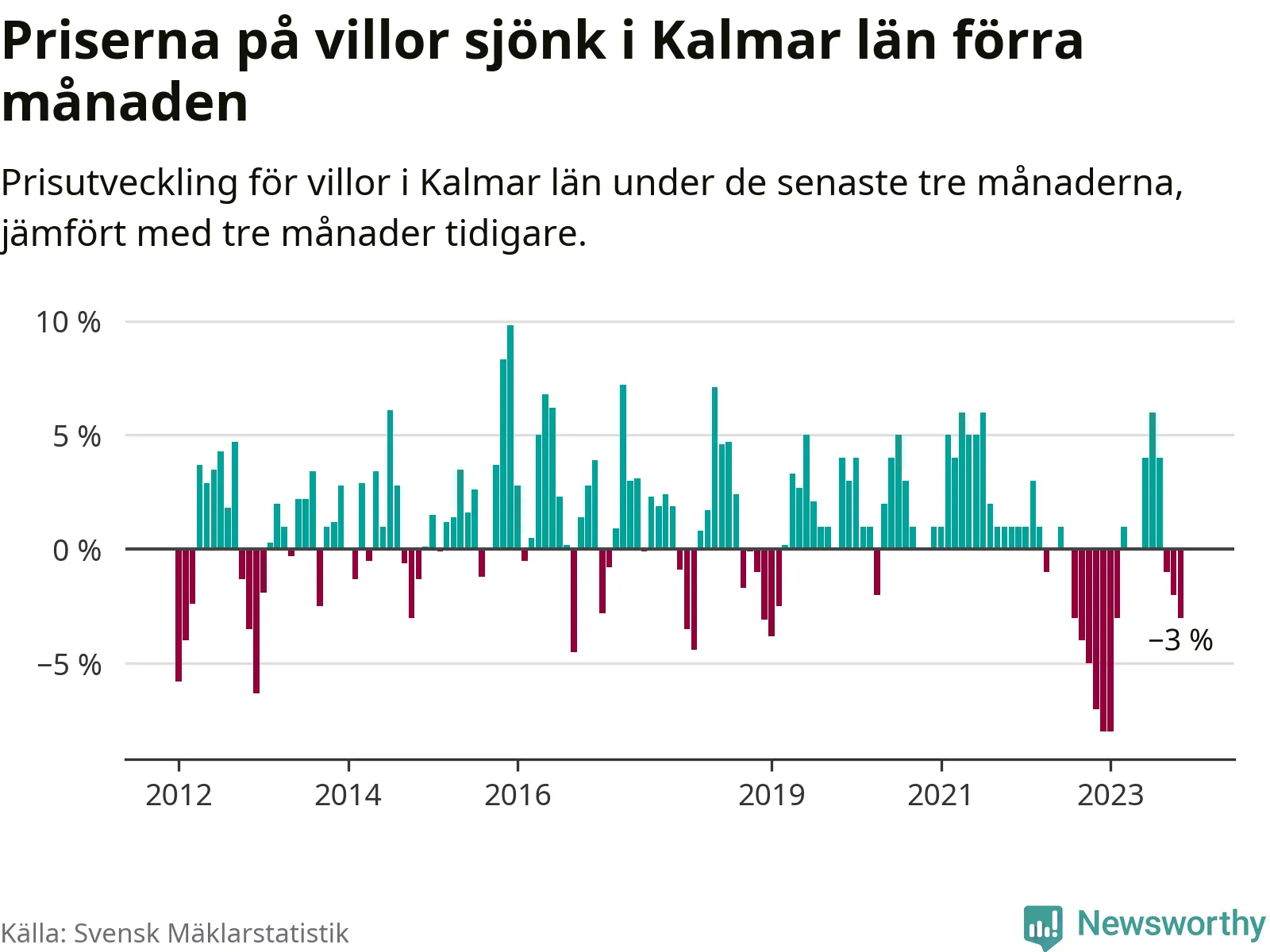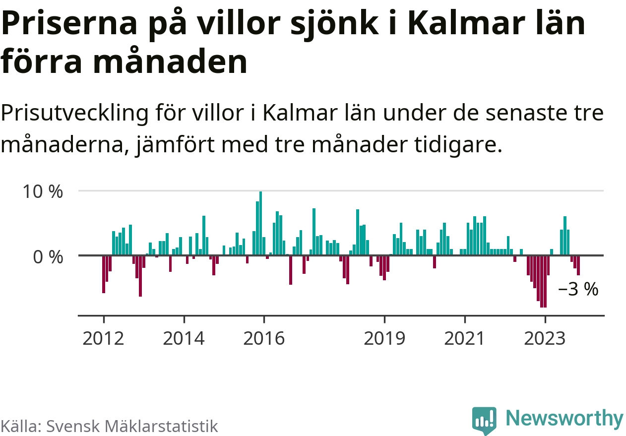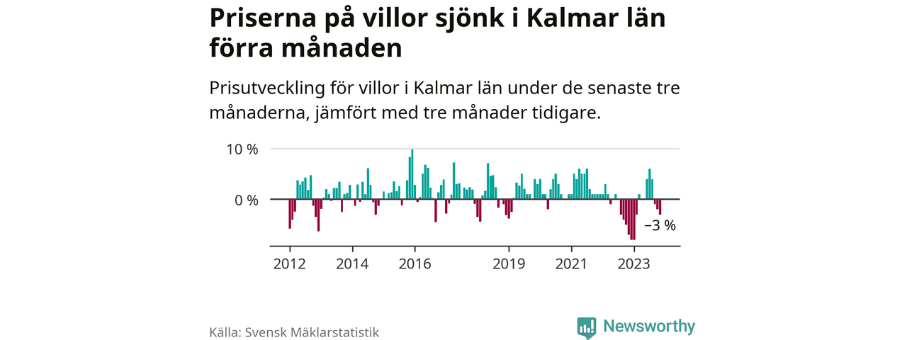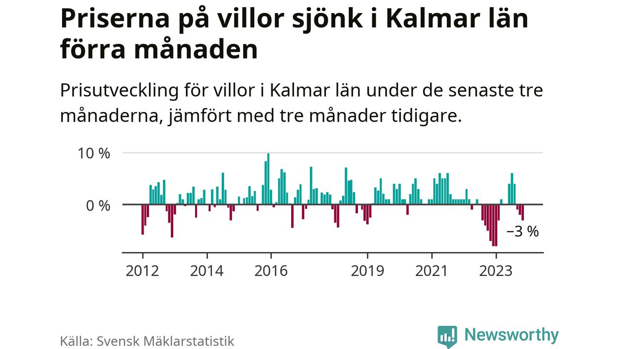 Villapriserna har gått ner i Kalmar län. Medelpriset på försäljningarna under de senaste tre månaderna visar på en nedgång med 3 procent.
