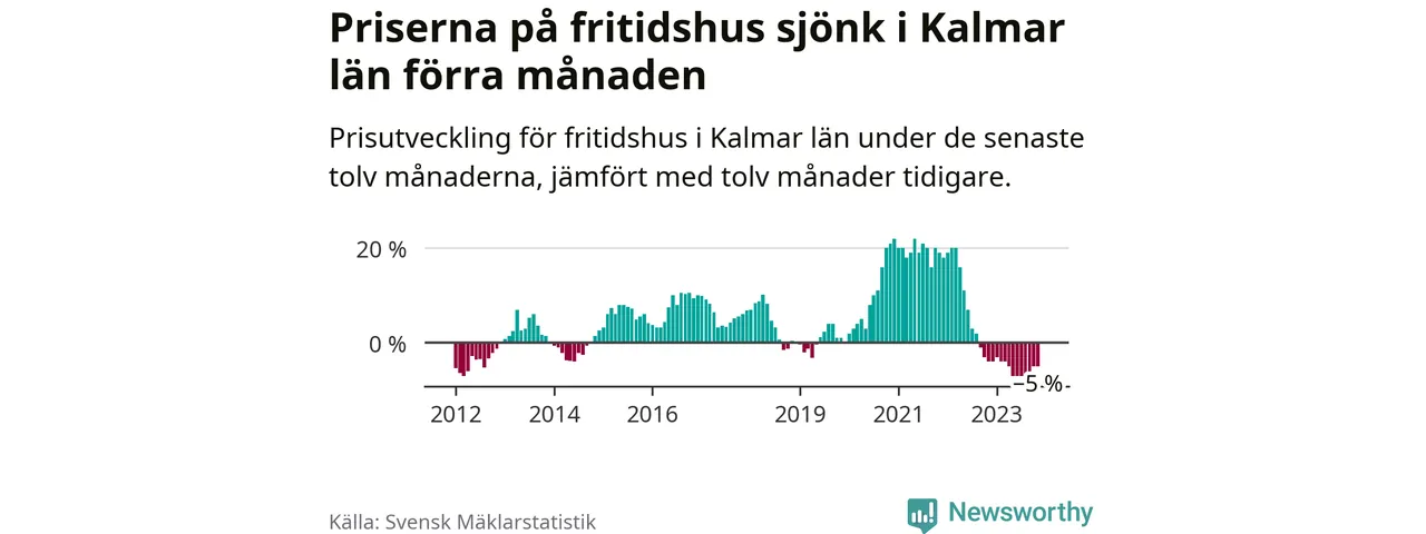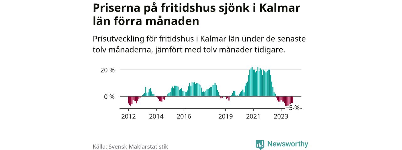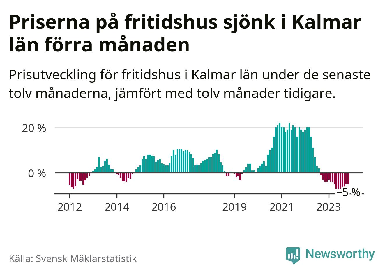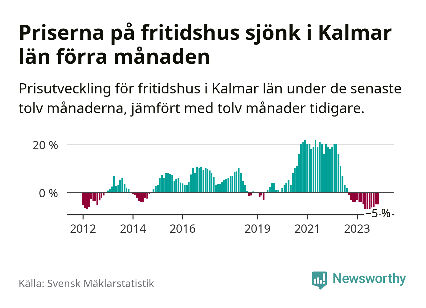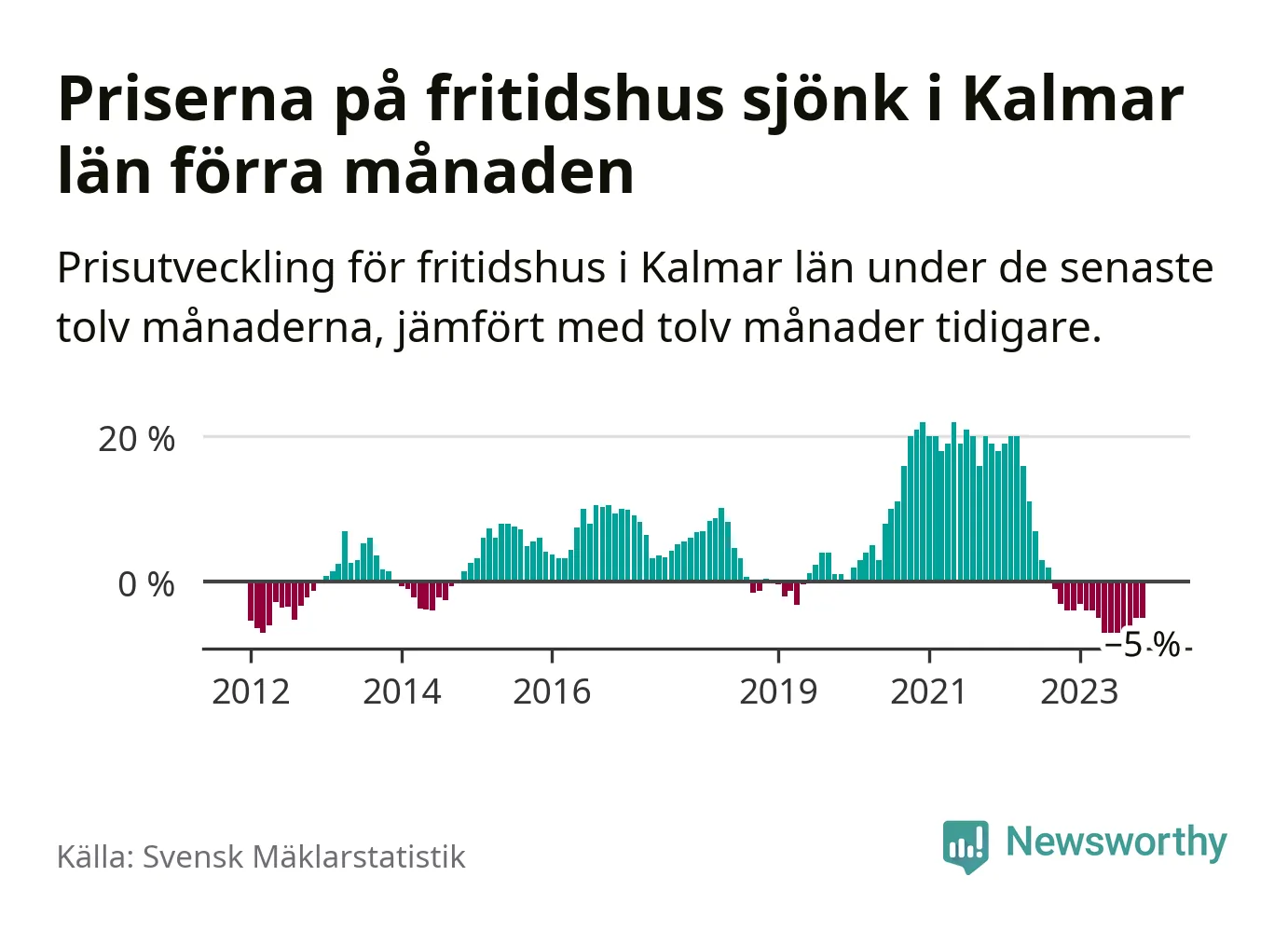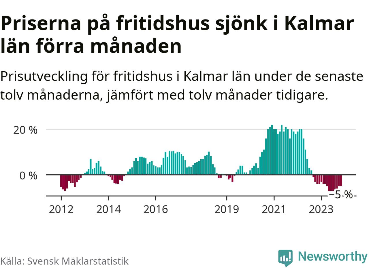 På grund av få försäljningar saknas uppgifter om prisförändringar för fritidshus i nio av länets tolv kommuner. Bland de tre vi har uppgifter om sjunker priserna i samtliga.I Kalmar län som helhet går priserna på fritidshus ner med 5 procent. Även i hela Sverige sjunker priserna på fritidshus. I hela riket noterades en prisnedgång på 6 procent.
