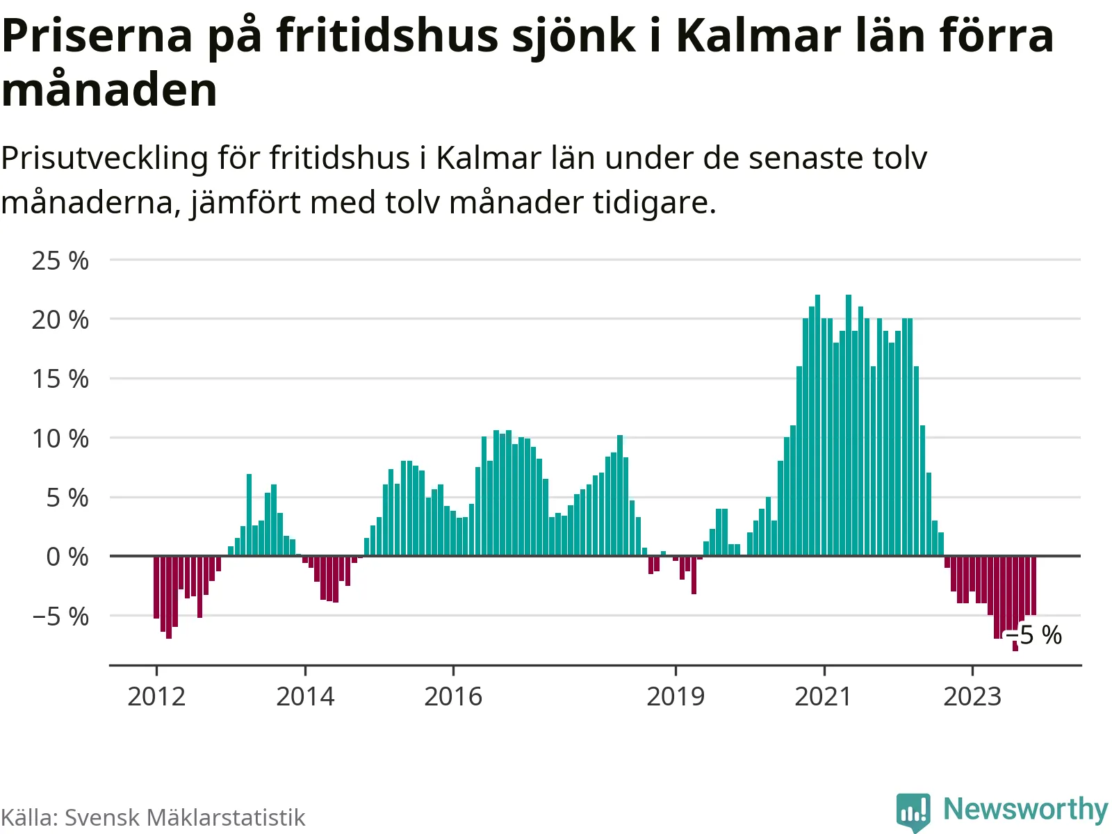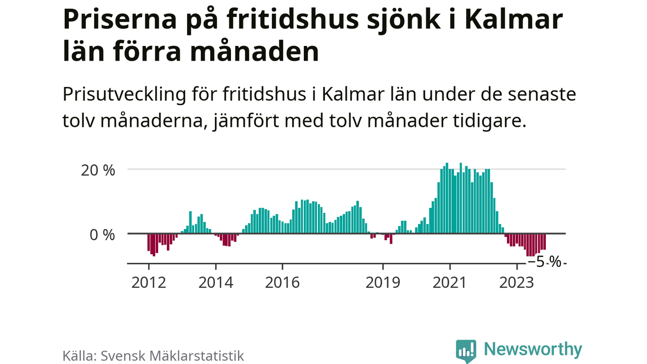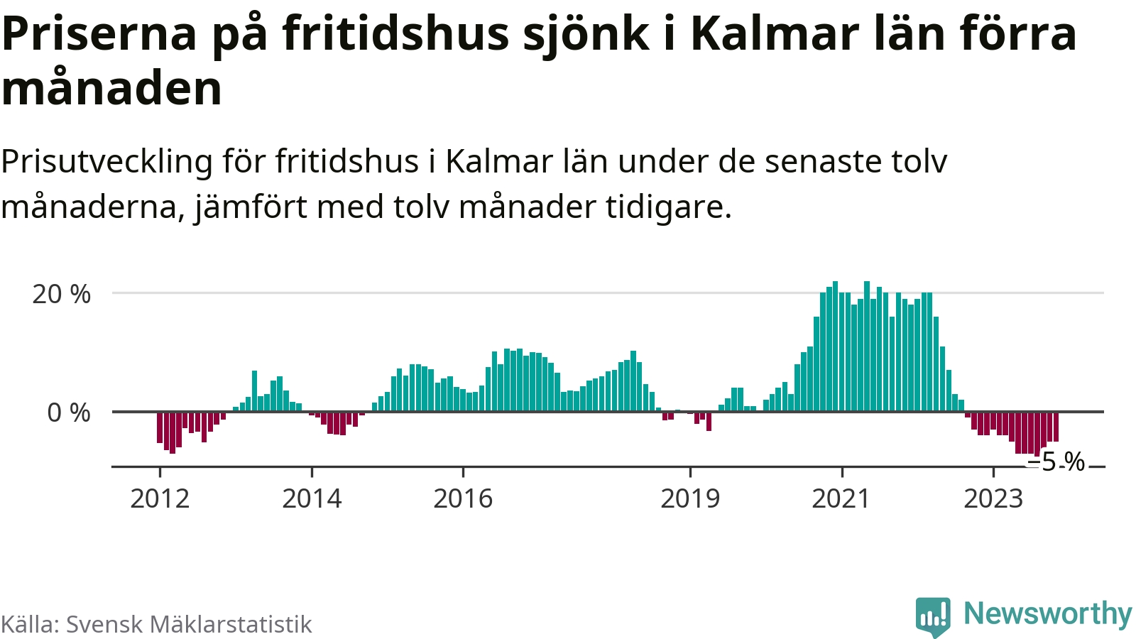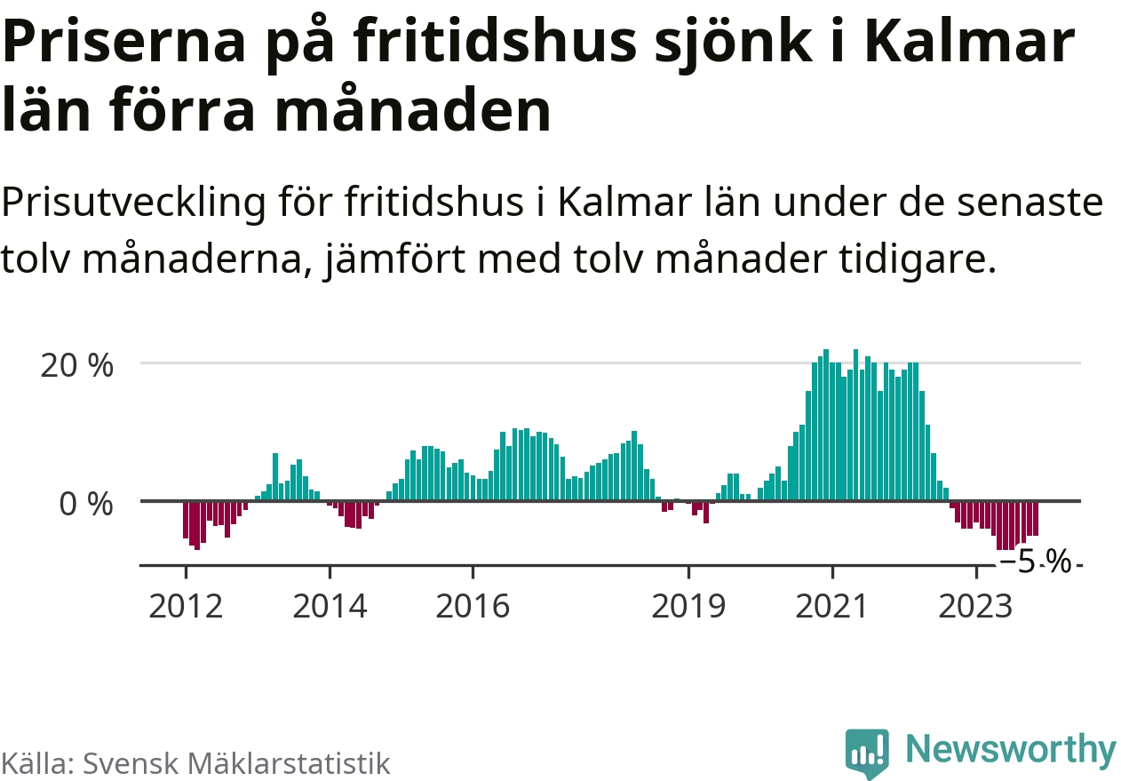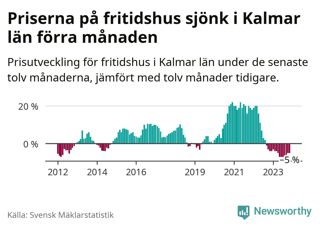 På grund av få försäljningar saknas uppgifter om prisförändringar för fritidshus i nio av länets tolv kommuner. Bland de tre vi har uppgifter om sjunker priserna i samtliga.I Kalmar län som helhet går priserna på fritidshus ner med 5 procent. Även i hela Sverige sjunker priserna på fritidshus. I hela riket noterades en prisnedgång på 6 procent.