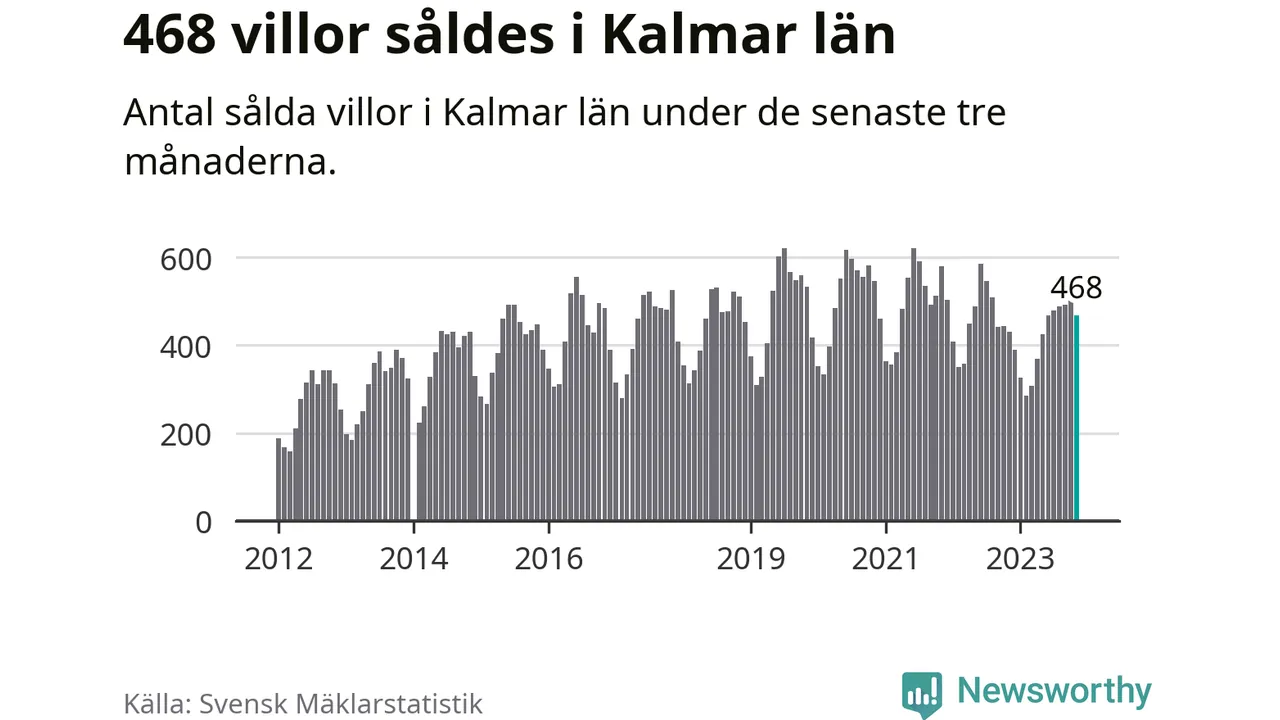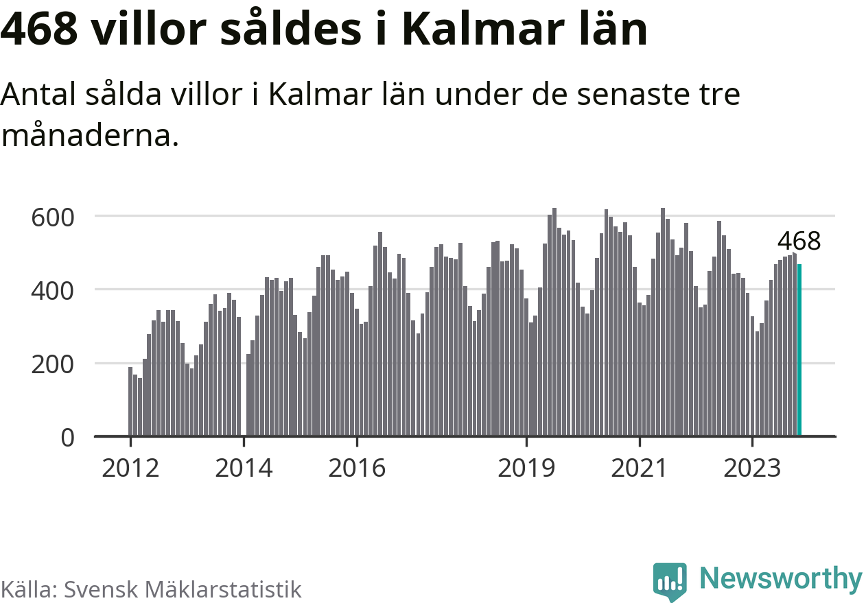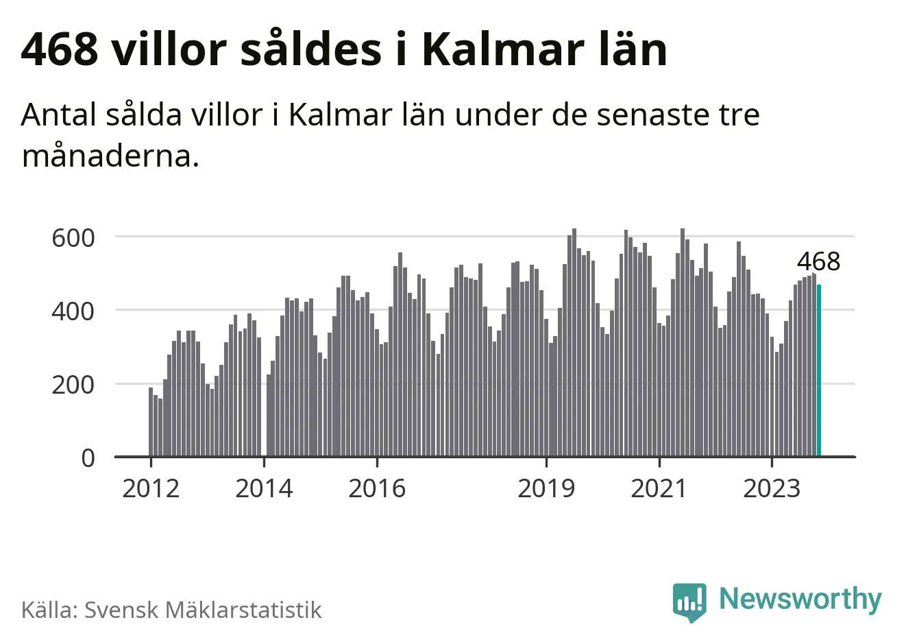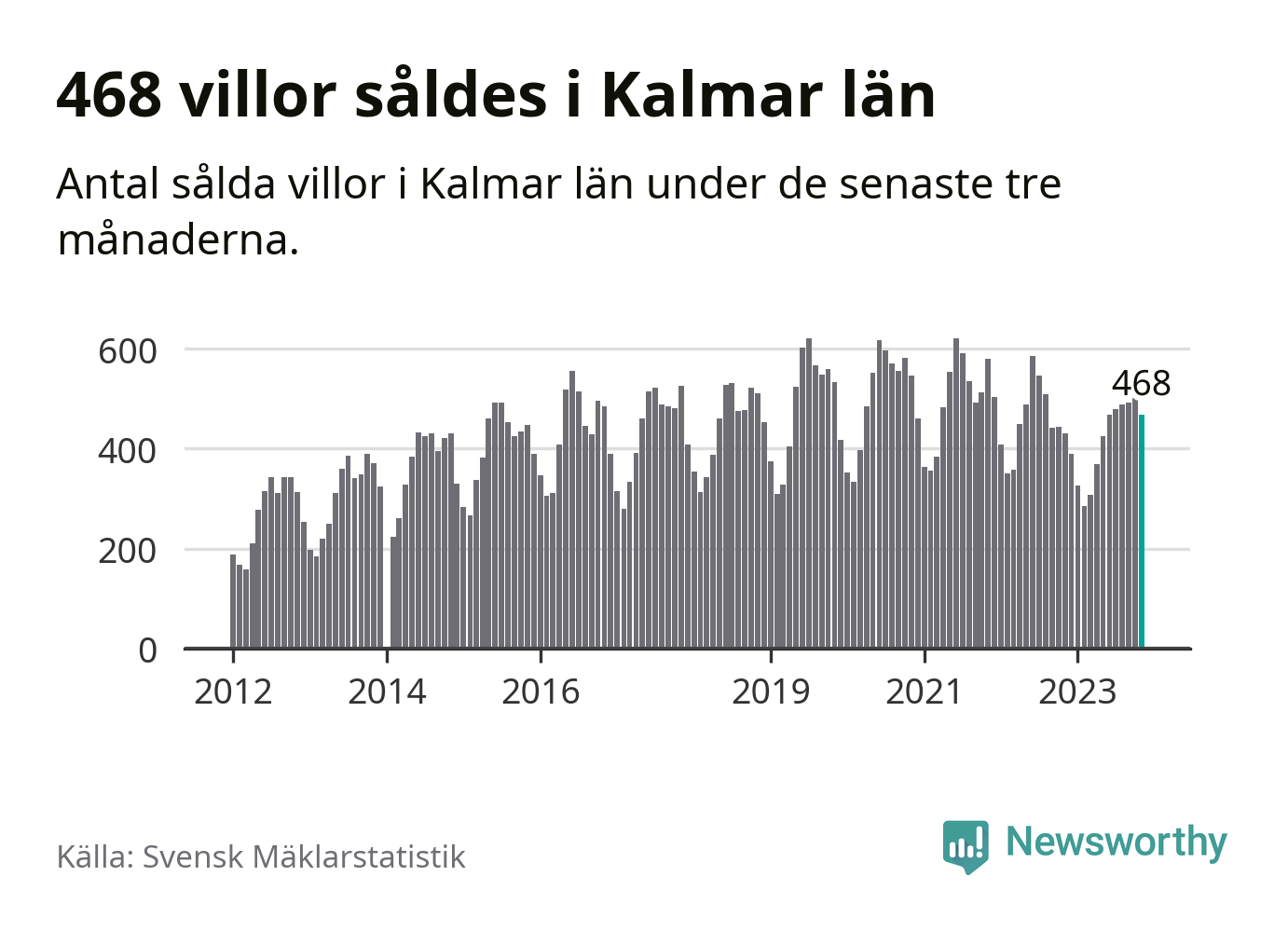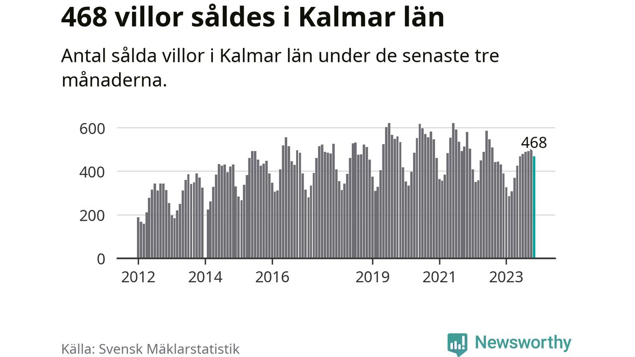 Sammanlagt såldes 468 villor i Kalmar län mellan september och november till ett genomsnittligt pris på 2,1 miljoner kronor. I fjol gjordes 430 affärer vid den här tiden på året.