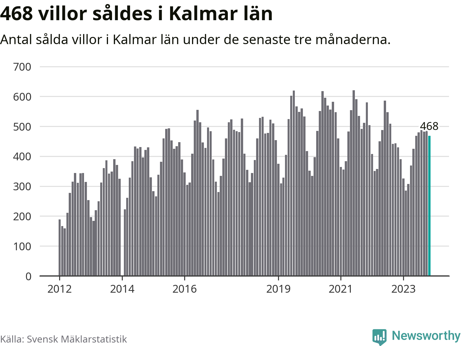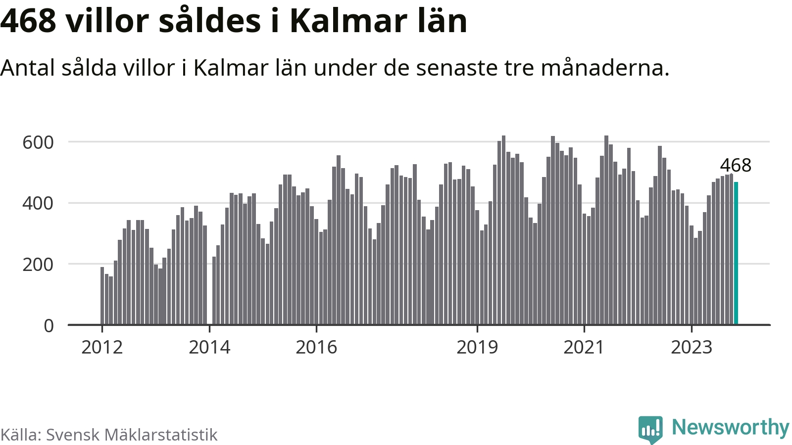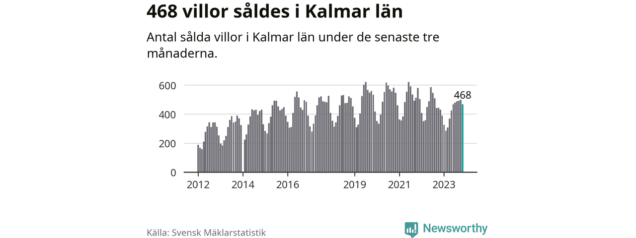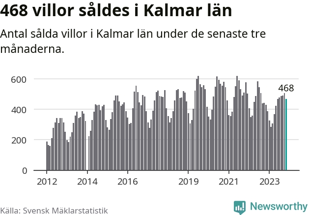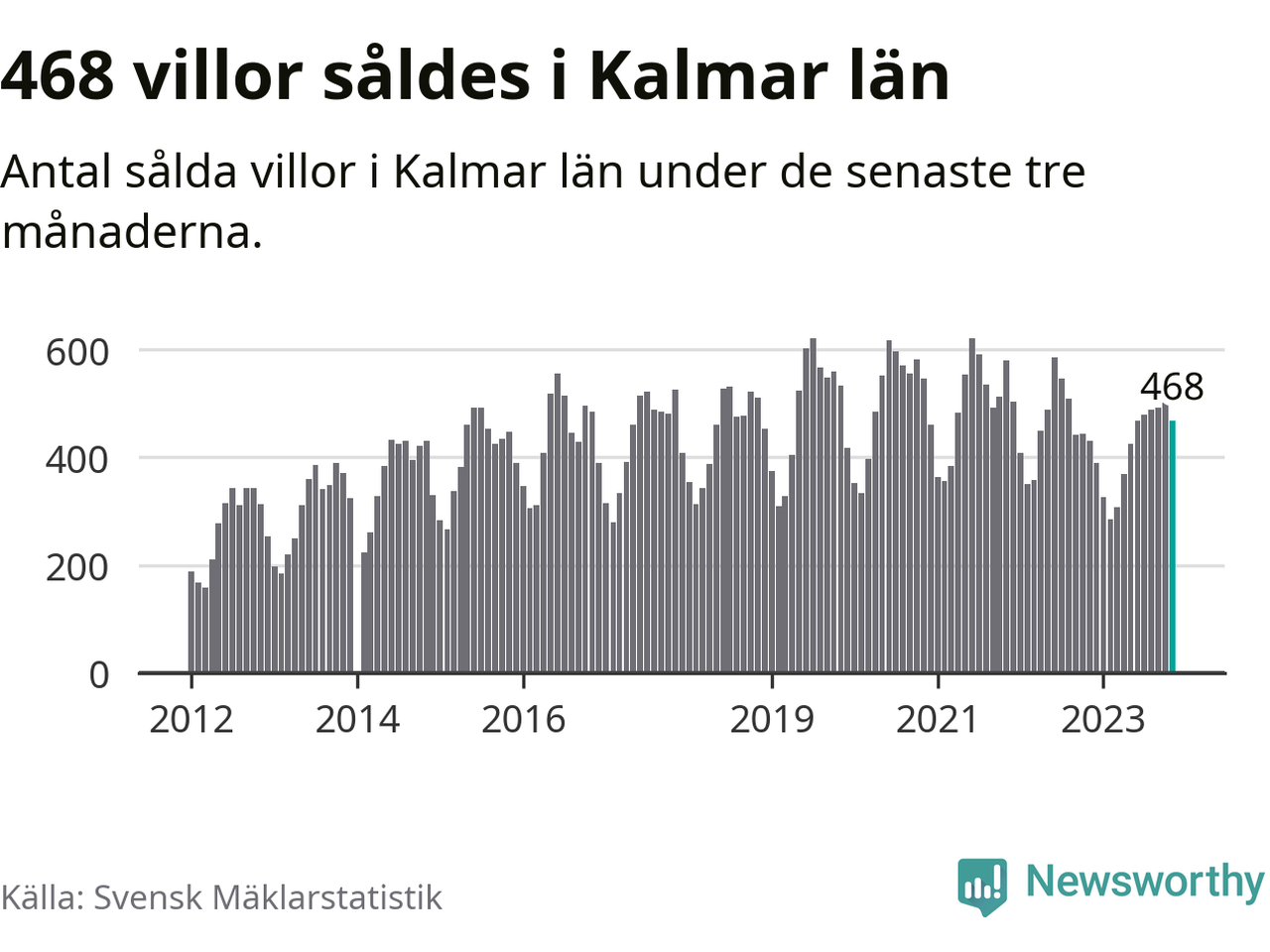 Sammanlagt såldes 468 villor i Kalmar län mellan september och november till ett genomsnittligt pris på 2,1 miljoner kronor. I fjol gjordes 430 affärer vid den här tiden på året.
