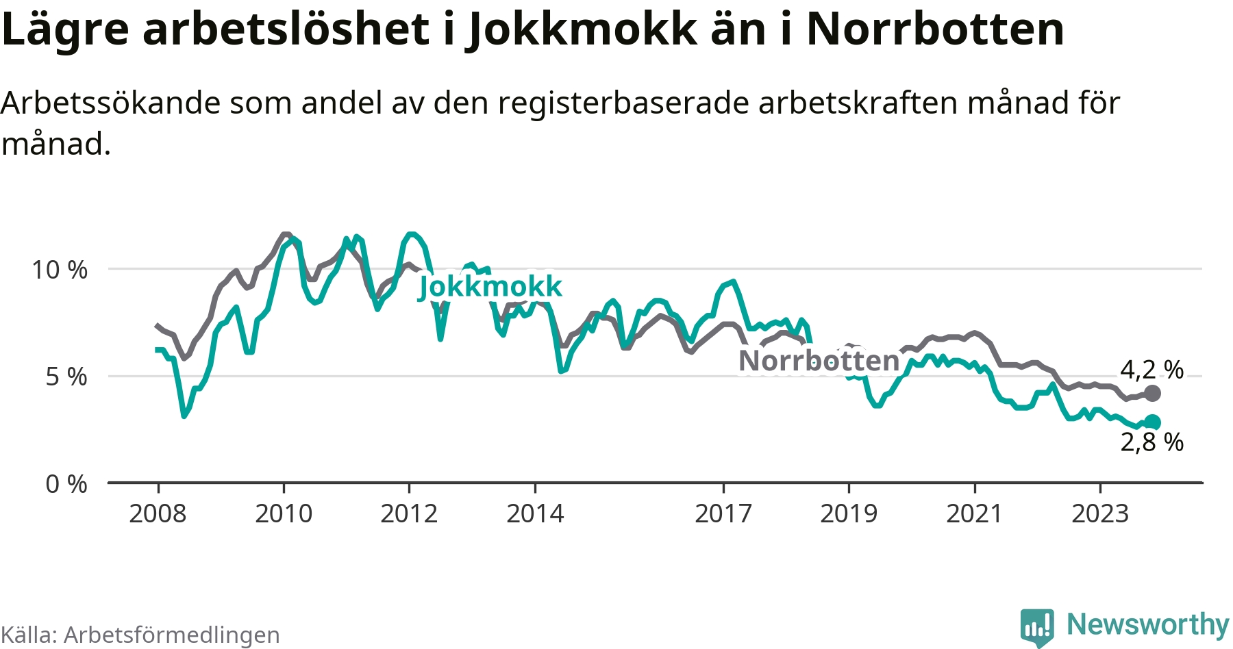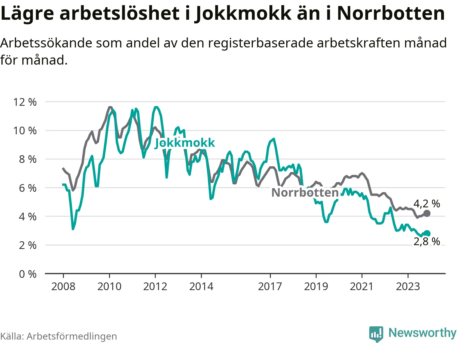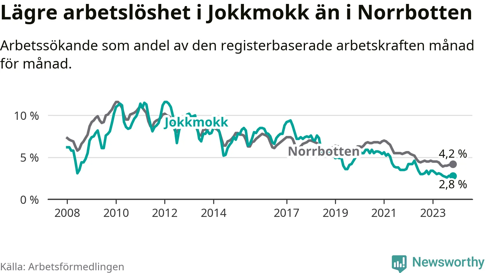 Under november månad rapporterade Jokkmokks kommun en total arbetslöshet på 2,8 procent. Det är en minskning jämfört med samma tidpunkt i fjol (−0,2 procentenheter). Även i Norrbottens län sjunker arbetslösheten .