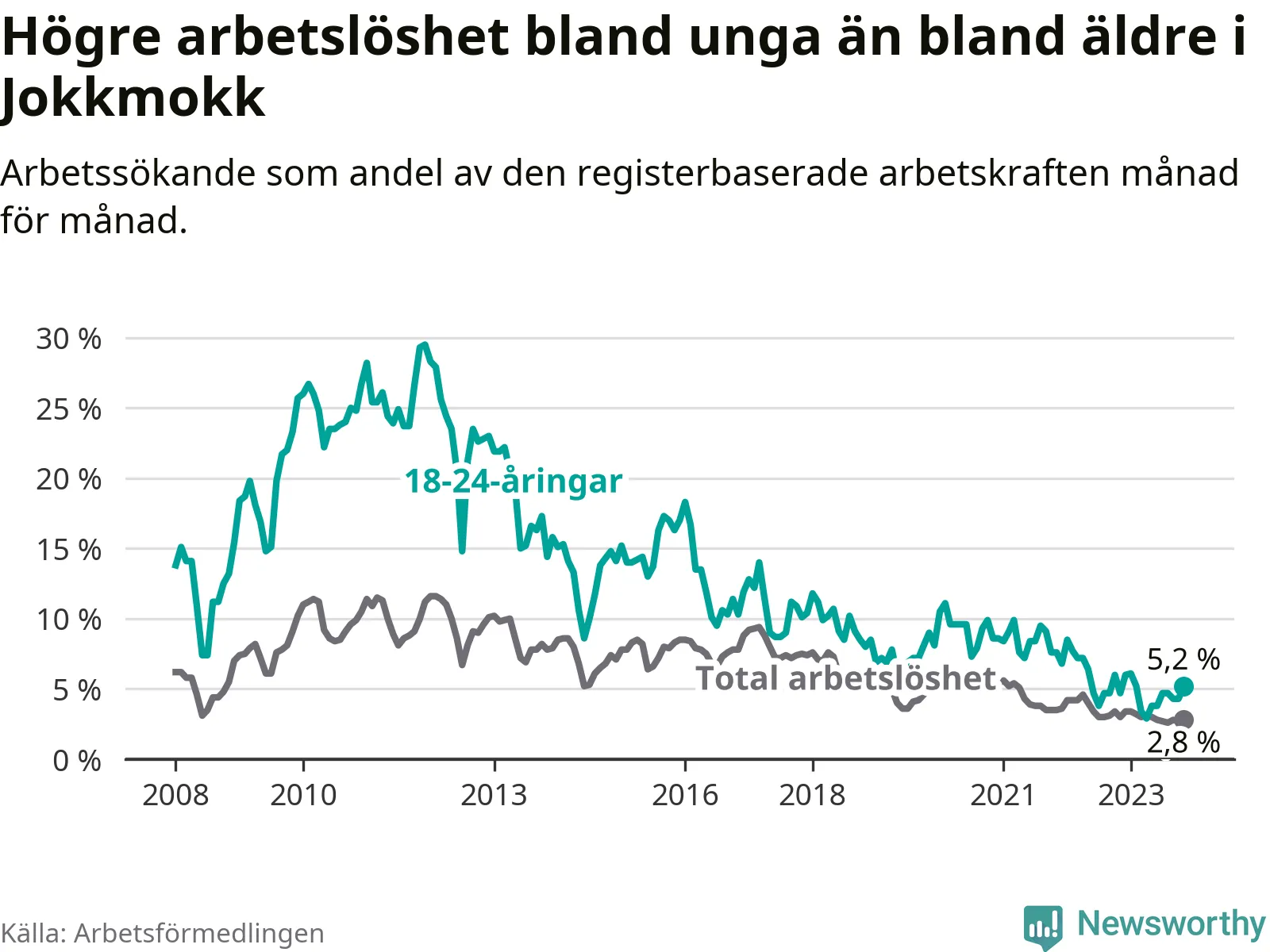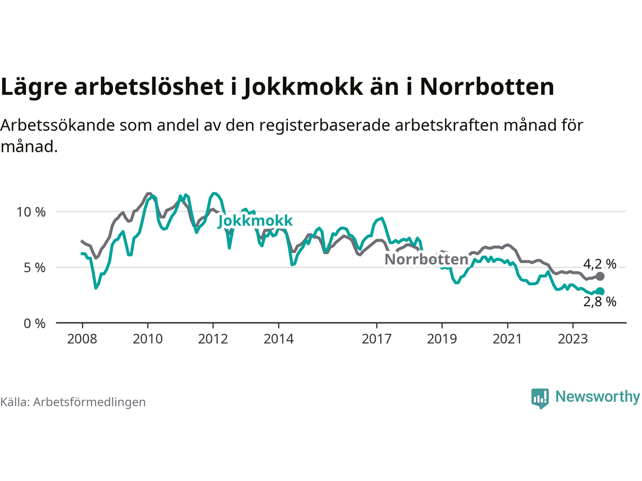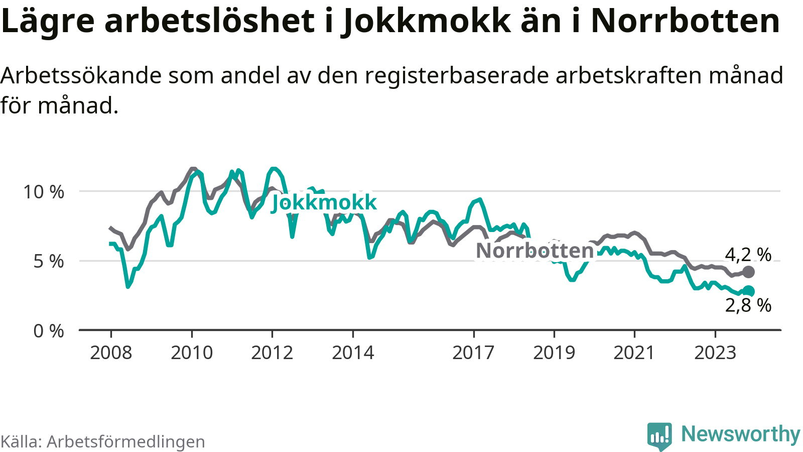 Under november månad rapporterade Jokkmokks kommun en total arbetslöshet på 2,8 procent. Det är en minskning jämfört med samma tidpunkt i fjol (−0,2 procentenheter). Även i Norrbottens län sjunker arbetslösheten .