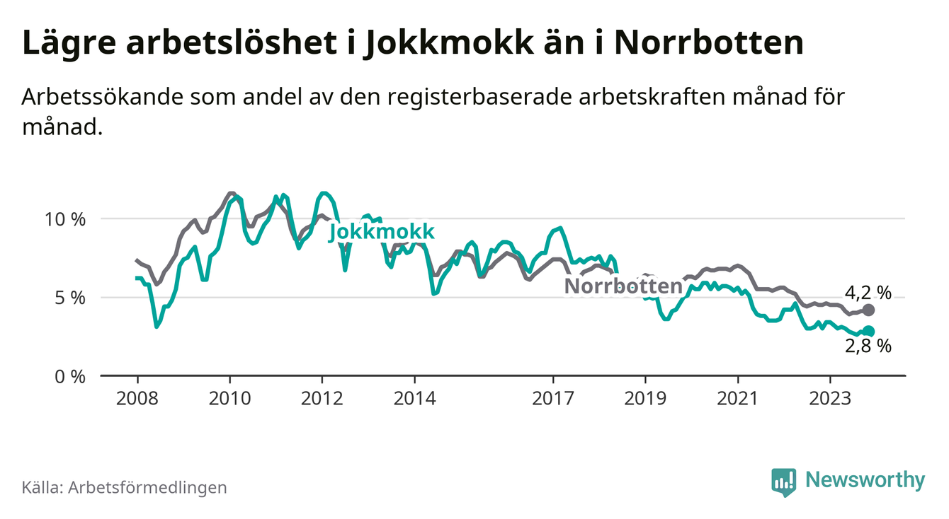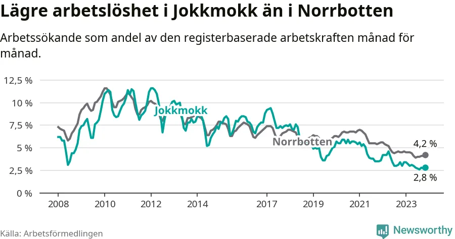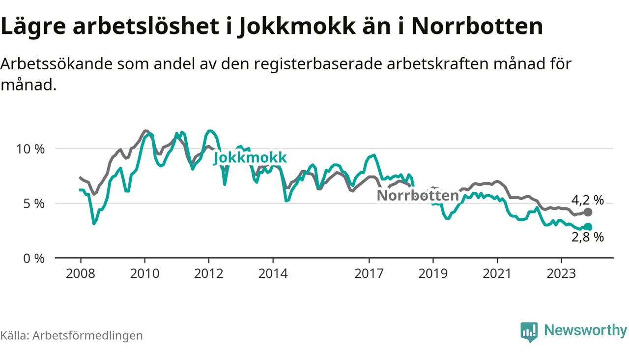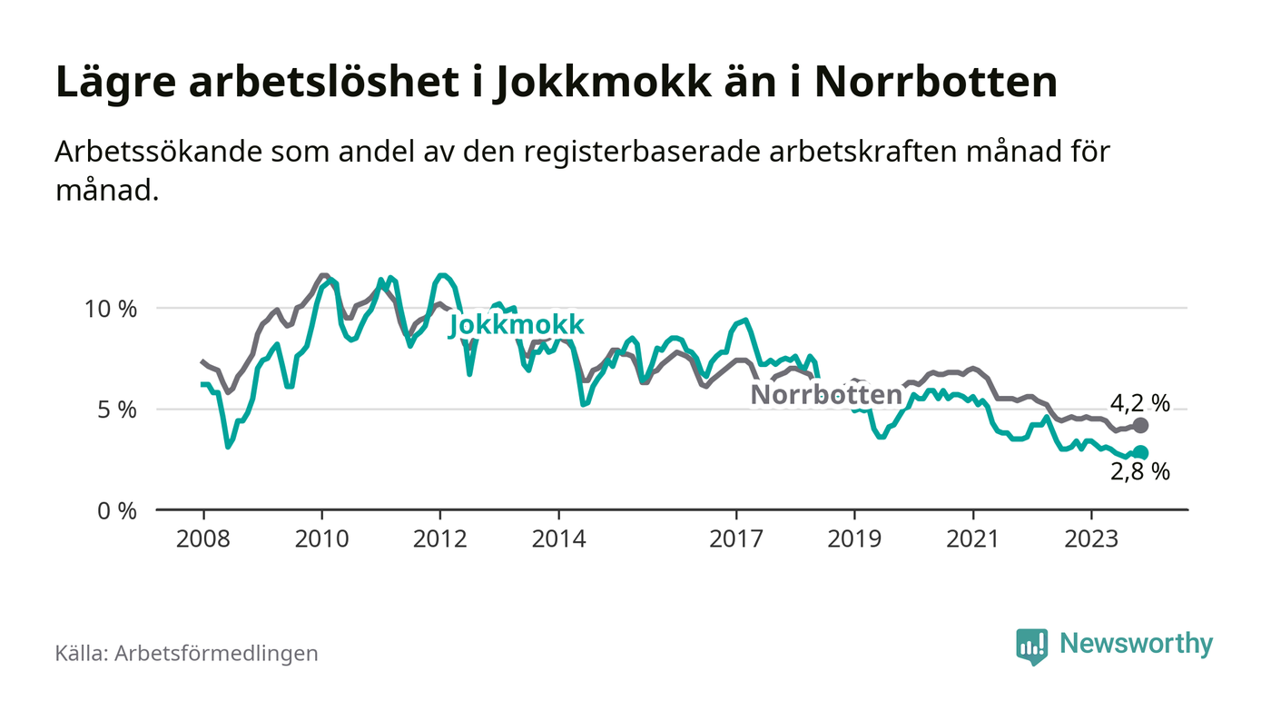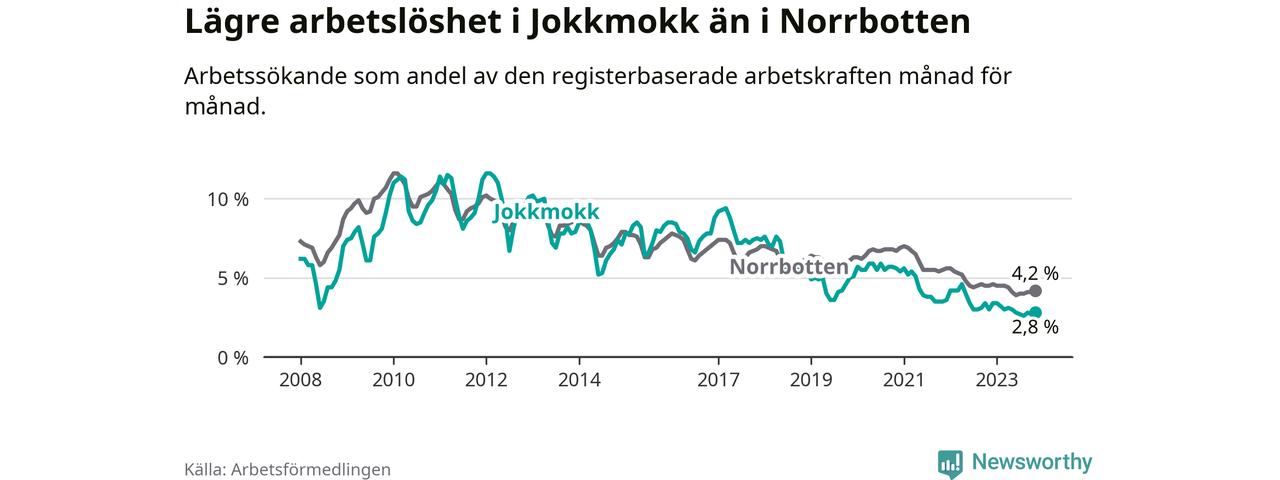 Det är 35:e månaden i följd som arbetslösheten i Jokkmokk är lägre än den var under samma tidpunkt året innan. Sedan december 2020 har arbetslösheten gått ner från 5,4 till 2,8 procent.