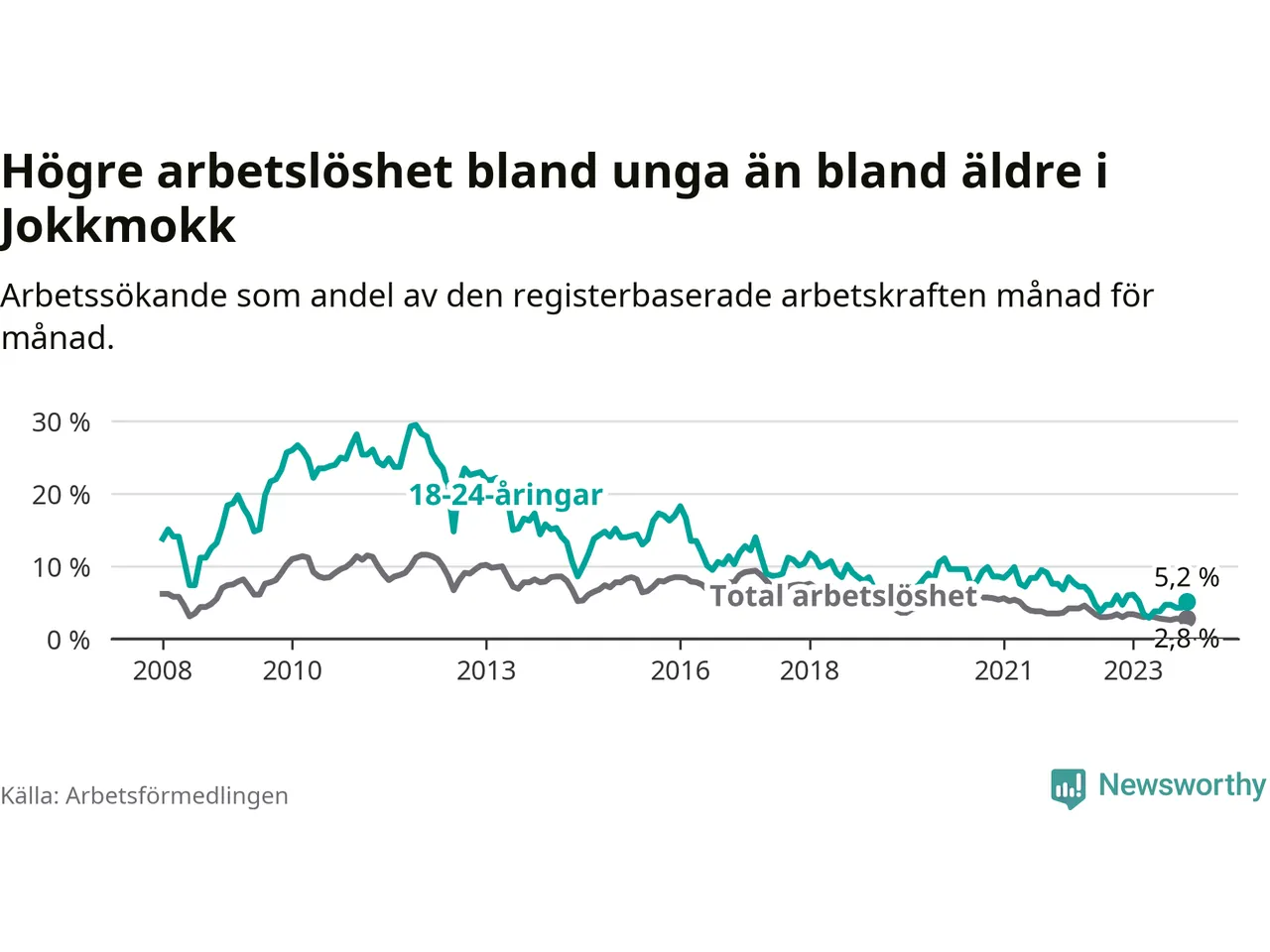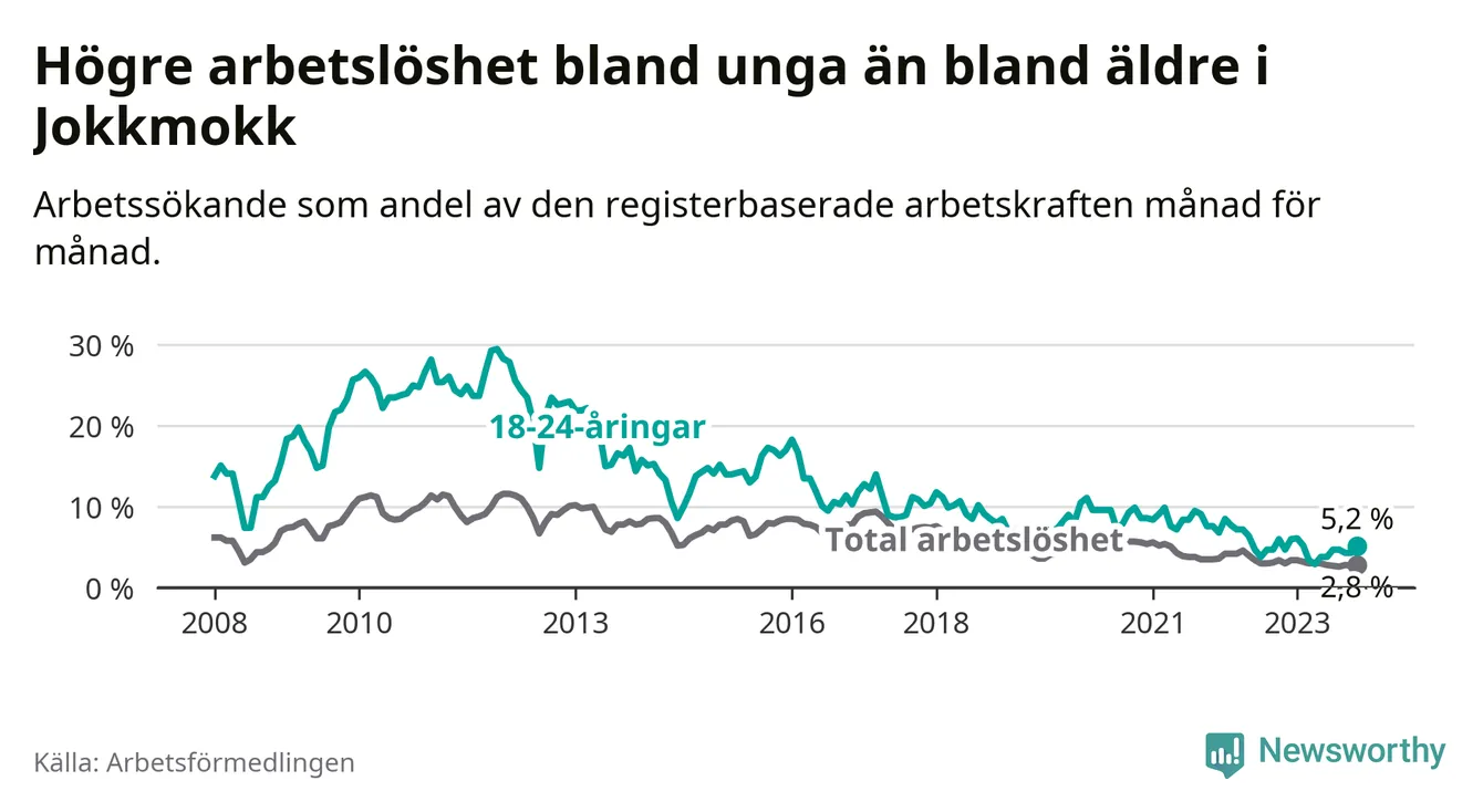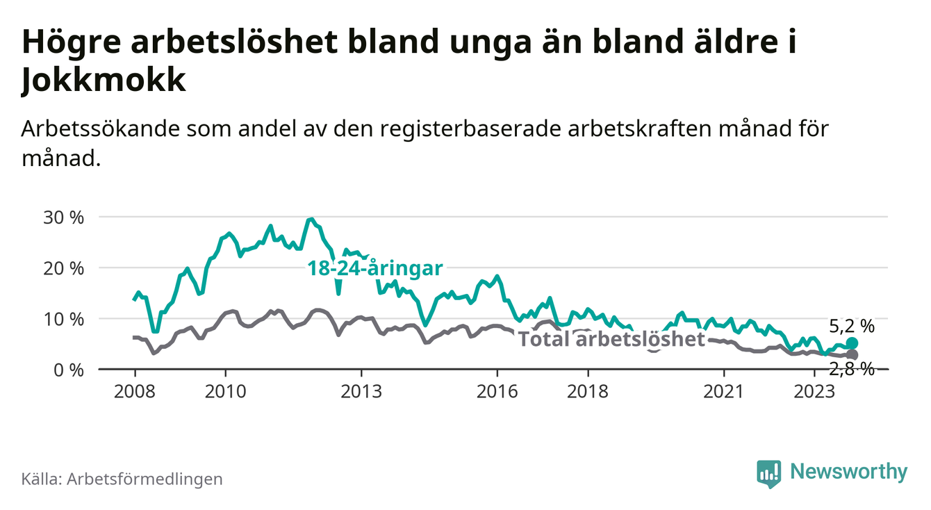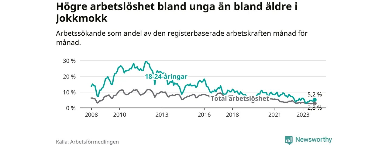 Det är 35:e månaden i följd som arbetslösheten i Jokkmokk är lägre än den var under samma tidpunkt året innan. Sedan december 2020 har arbetslösheten gått ner från 5,4 till 2,8 procent.