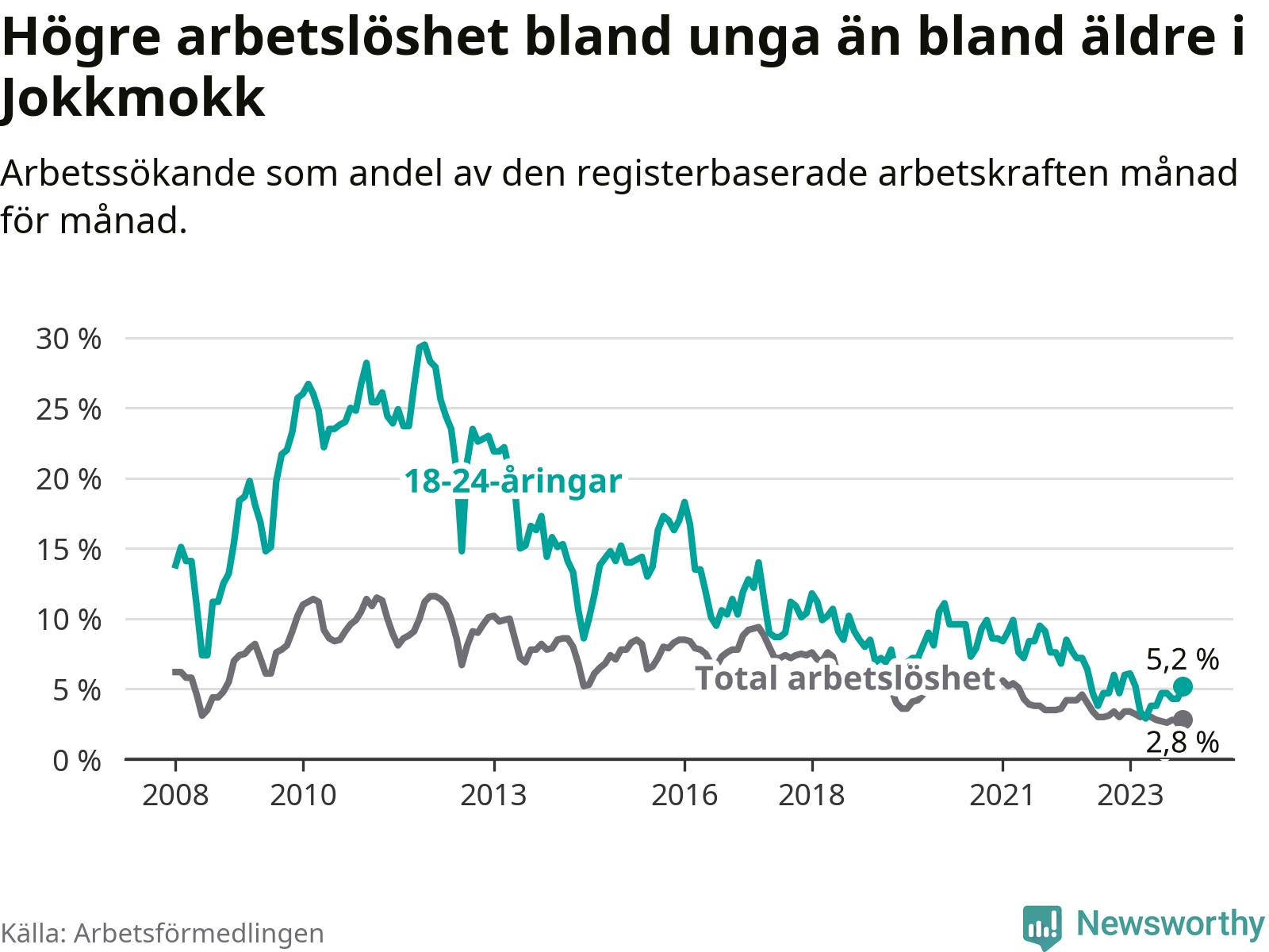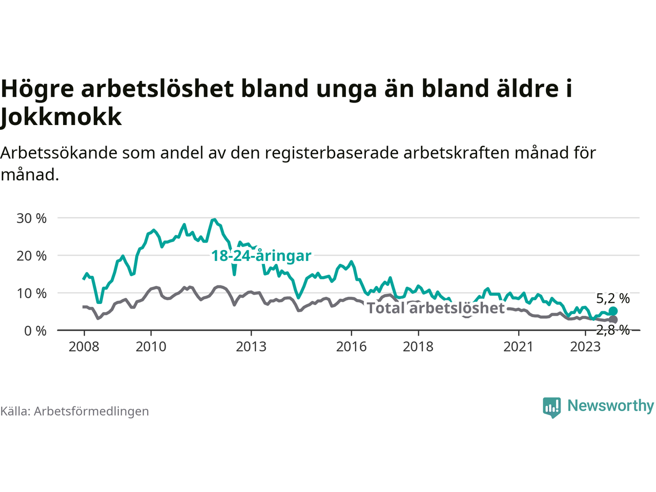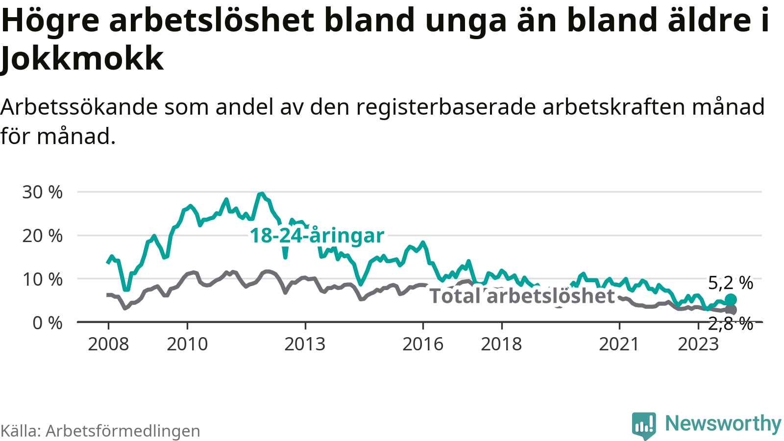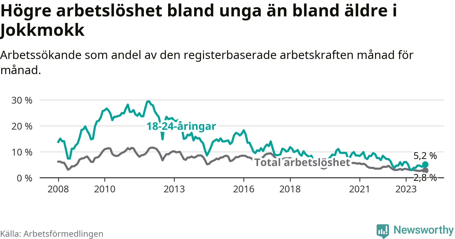 Till skillnad från den totala arbetslösheten stiger arbetslösheten bland unga (+0,5 procentenheter). I november var 5,2 procent av 18–24-åringarna inskrivna som arbetssökande (motsvarande elva personer). Mäter vi antalet inskrivna ser vi en ökning med ett personer på ett års sikt.