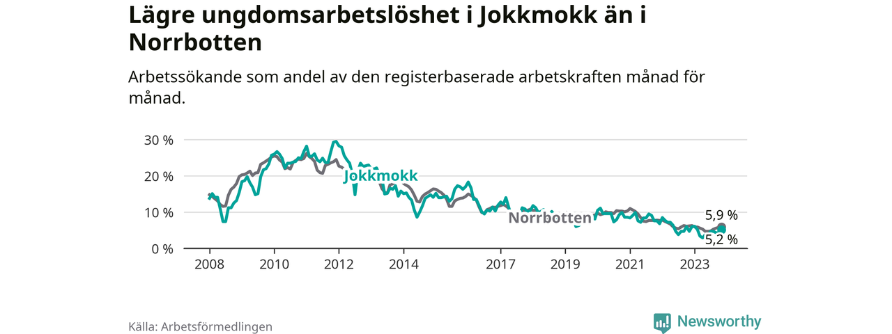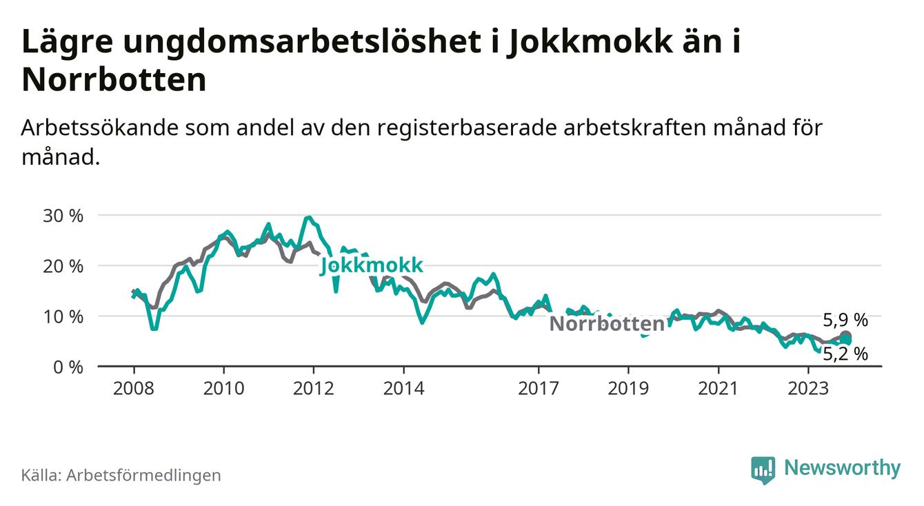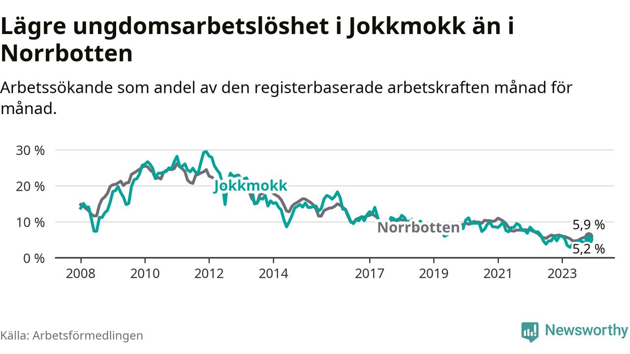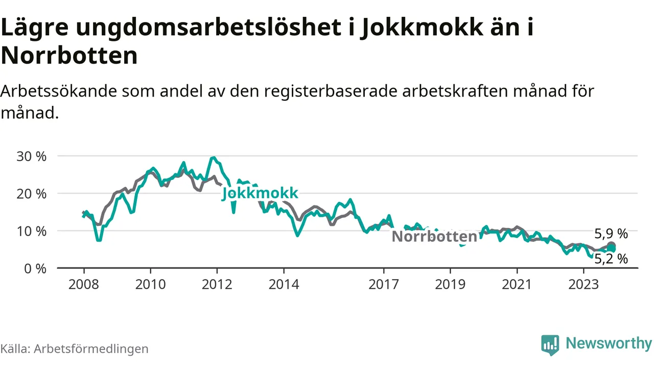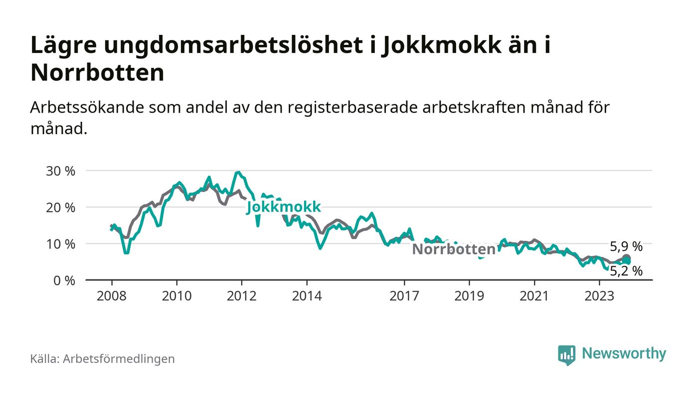 Precis som den totala arbetslösheten ligger ungdomsarbetslösheten i Jokkmokk lägre än i Norrbotten som helhet. Skillnaden mellan kommunen och länet är 0,7 procentenheter.
