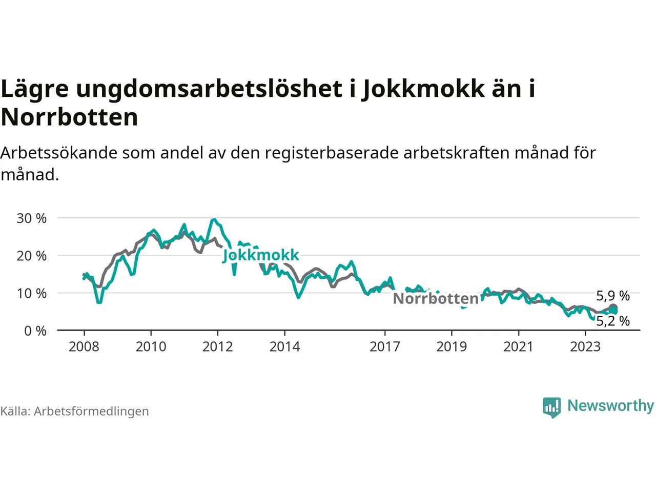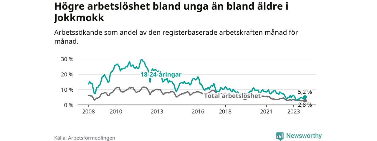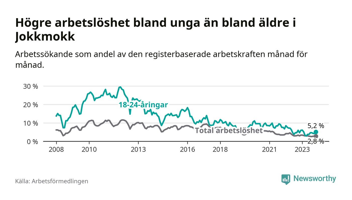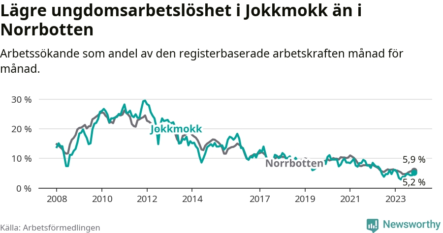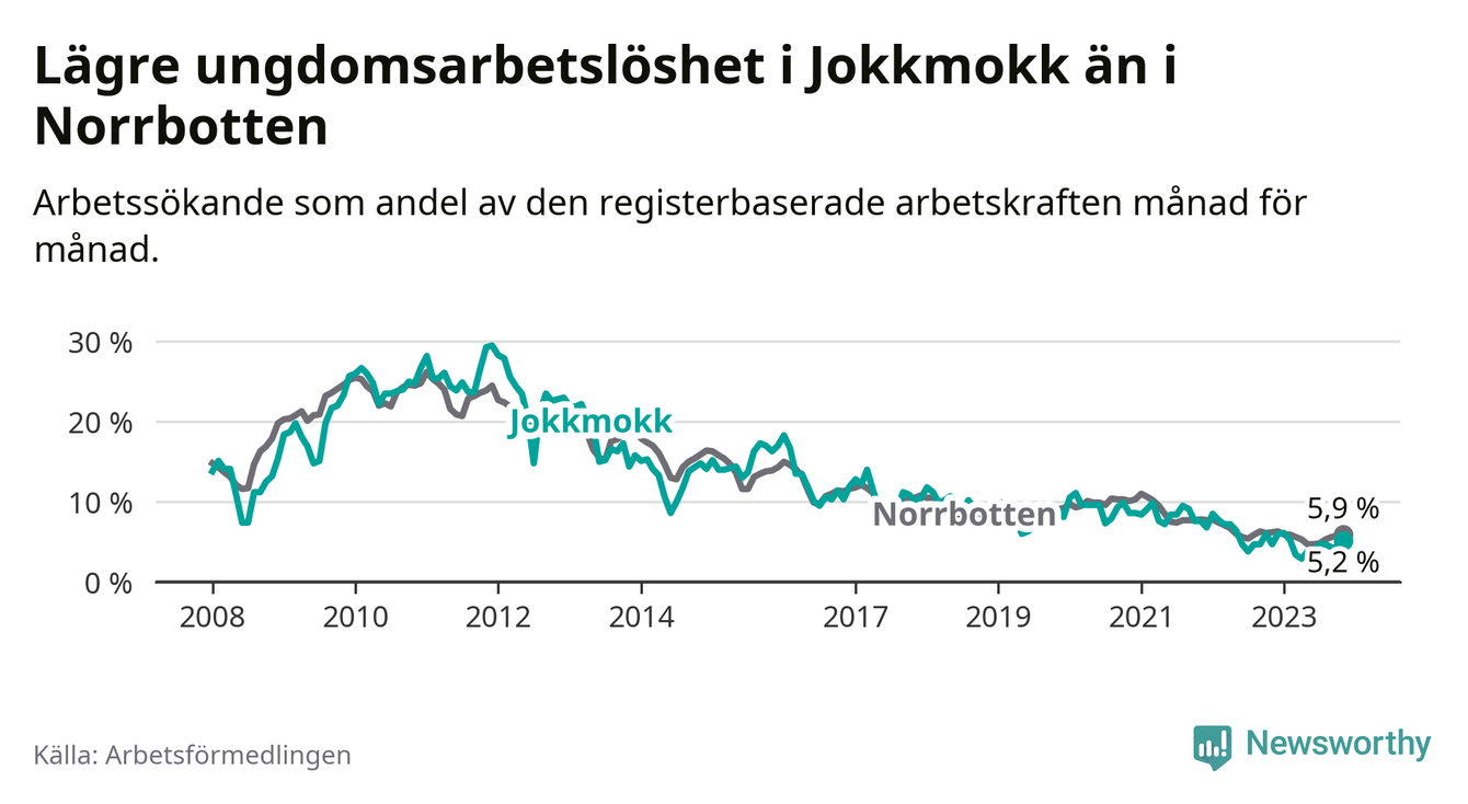 Precis som den totala arbetslösheten ligger ungdomsarbetslösheten i Jokkmokk lägre än i Norrbotten som helhet. Skillnaden mellan kommunen och länet är 0,7 procentenheter.