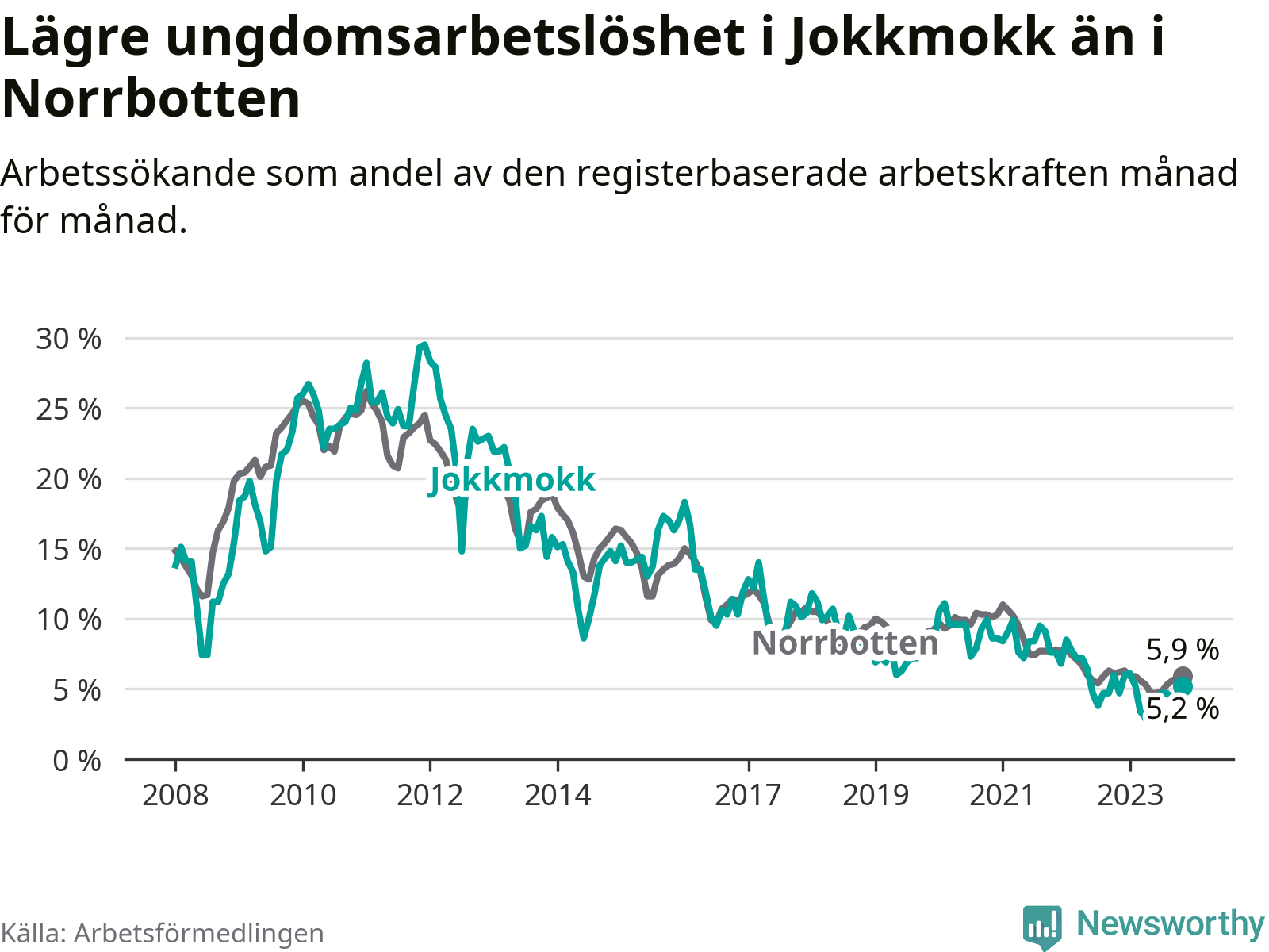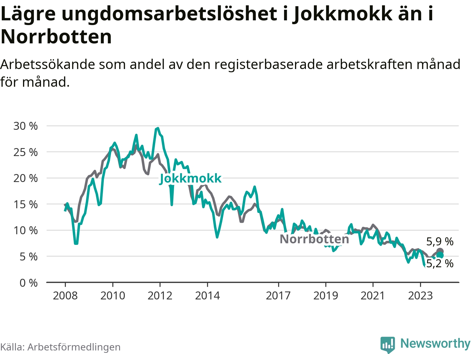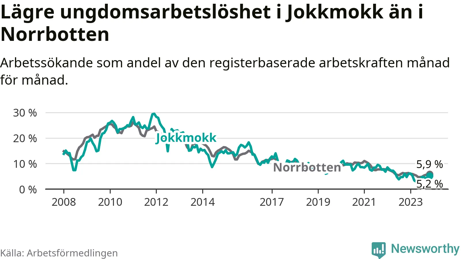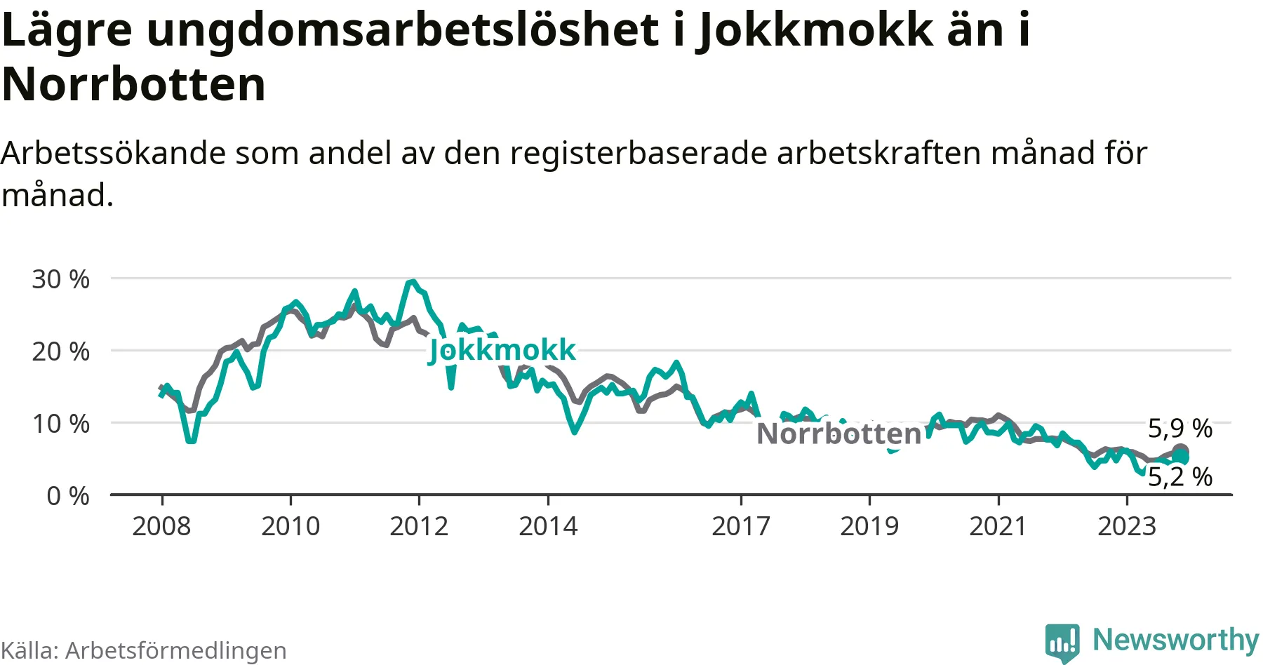 Precis som den totala arbetslösheten ligger ungdomsarbetslösheten i Jokkmokk lägre än i Norrbotten som helhet. Skillnaden mellan kommunen och länet är 0,7 procentenheter.