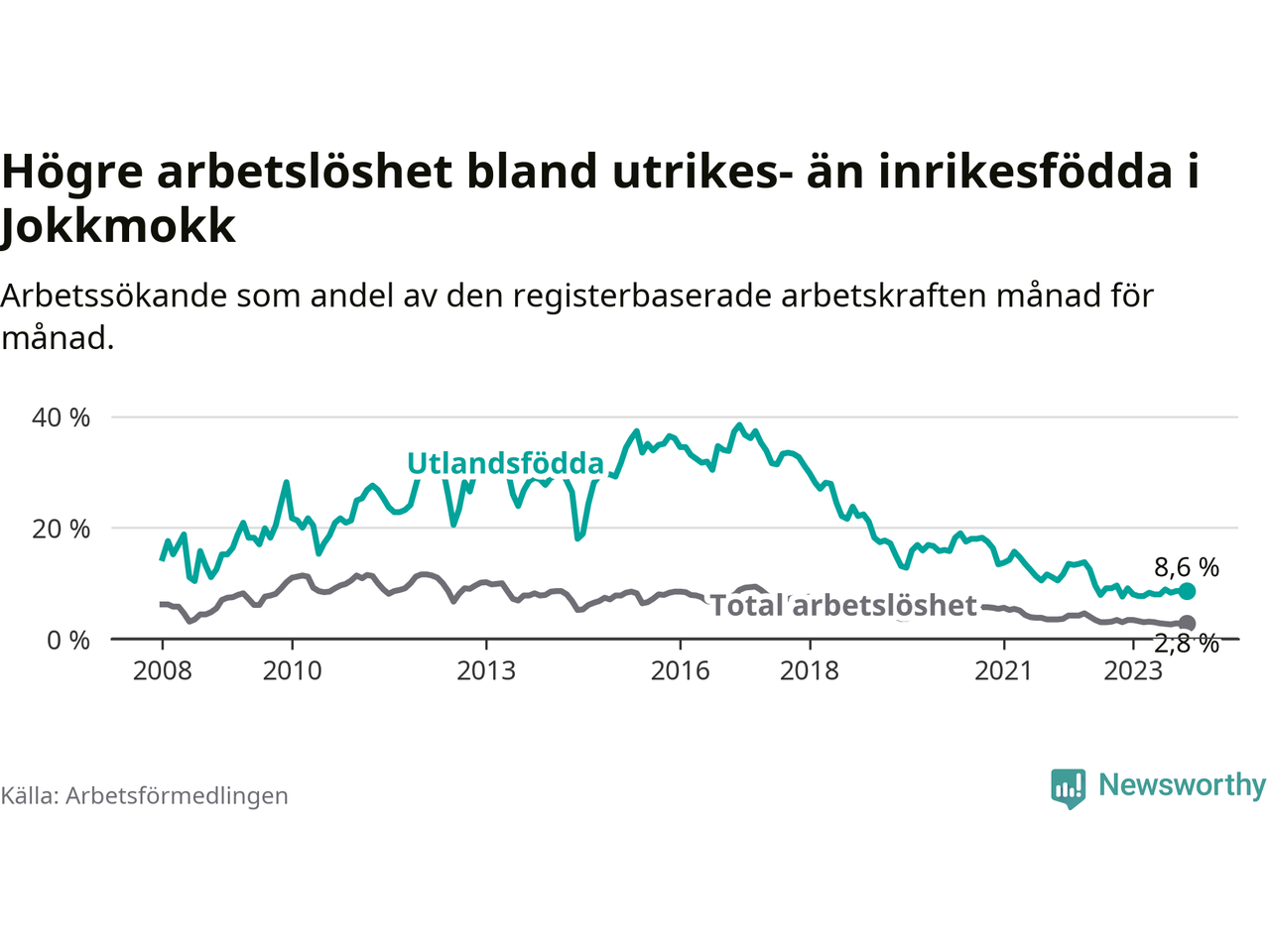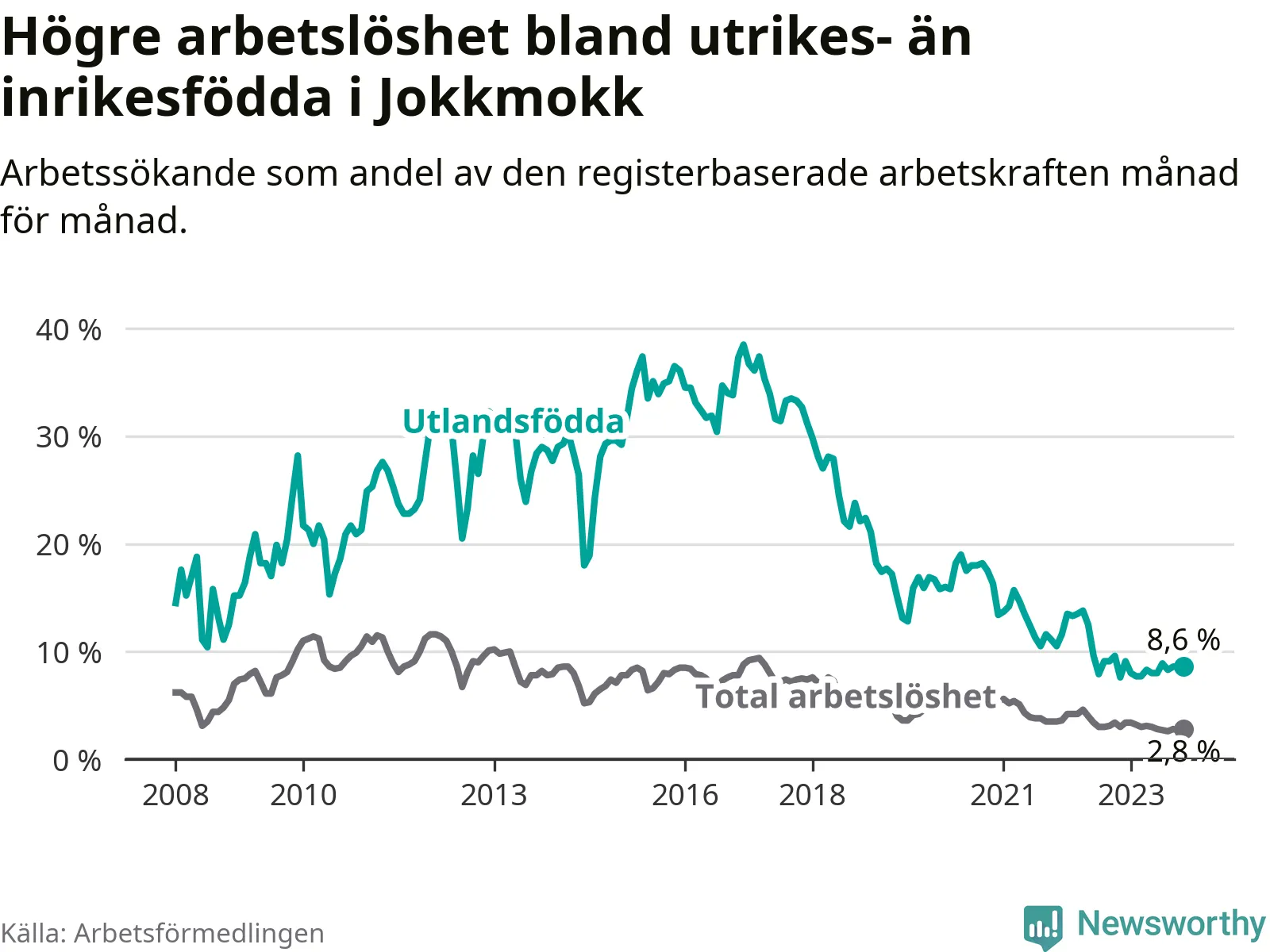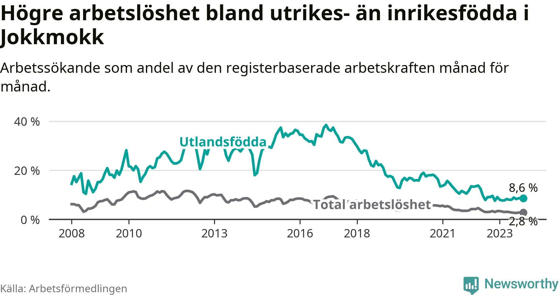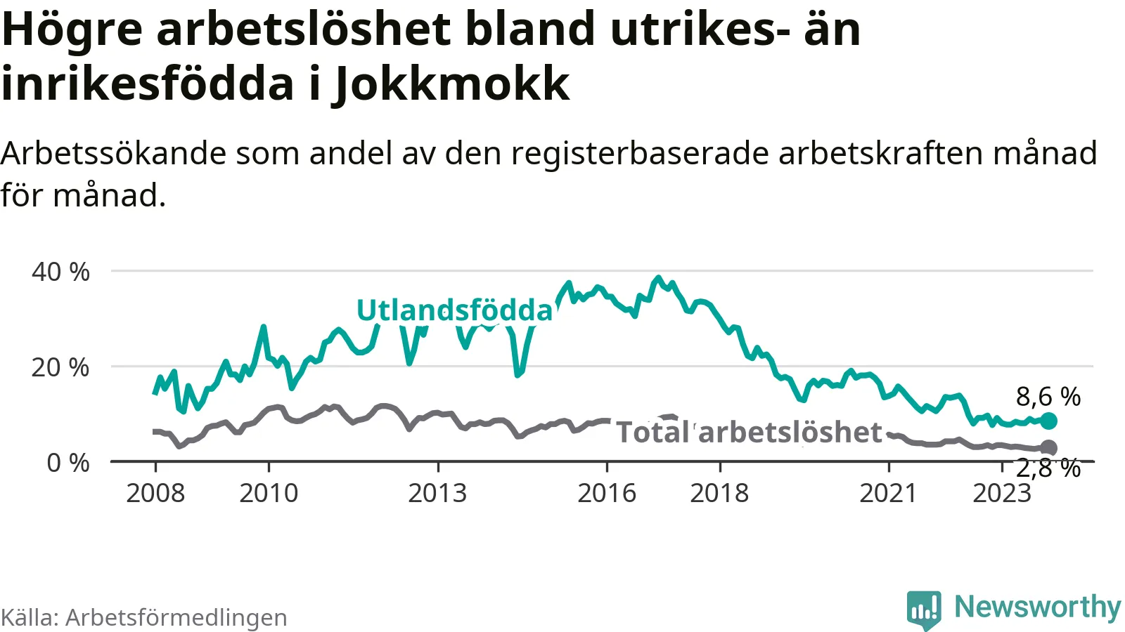 | Bland utlandsfödda | 8,6 % | +1,0 % ▲ | 10,8 % | −1,1 % ▼ | 15,3 % | −1,2 % ▼ |
