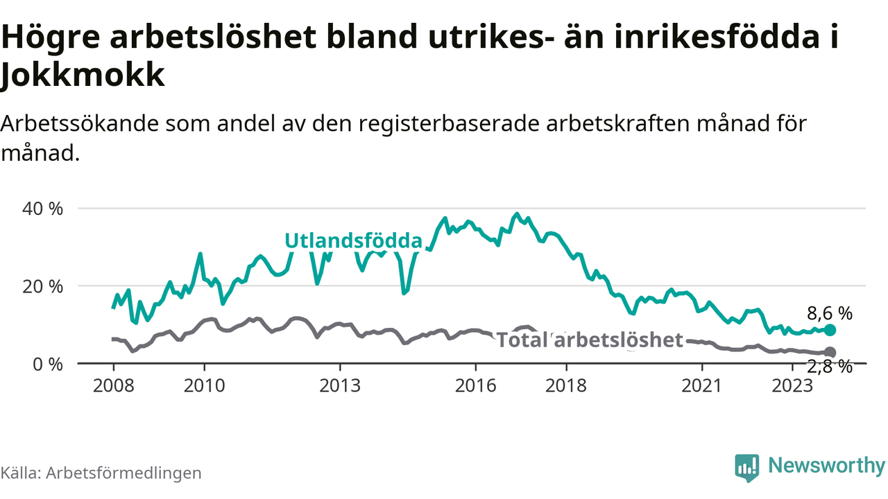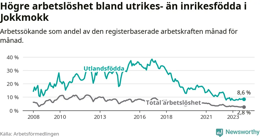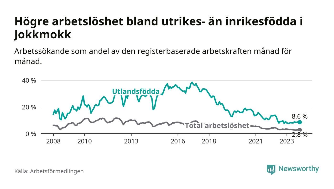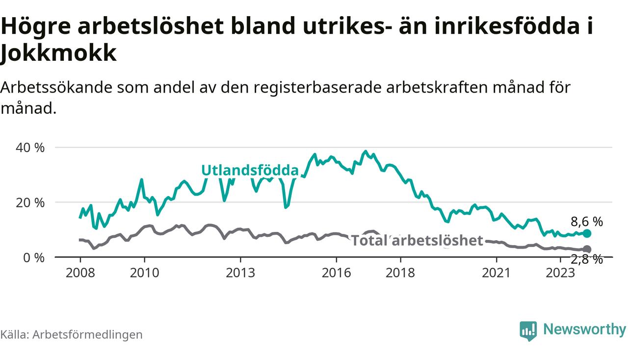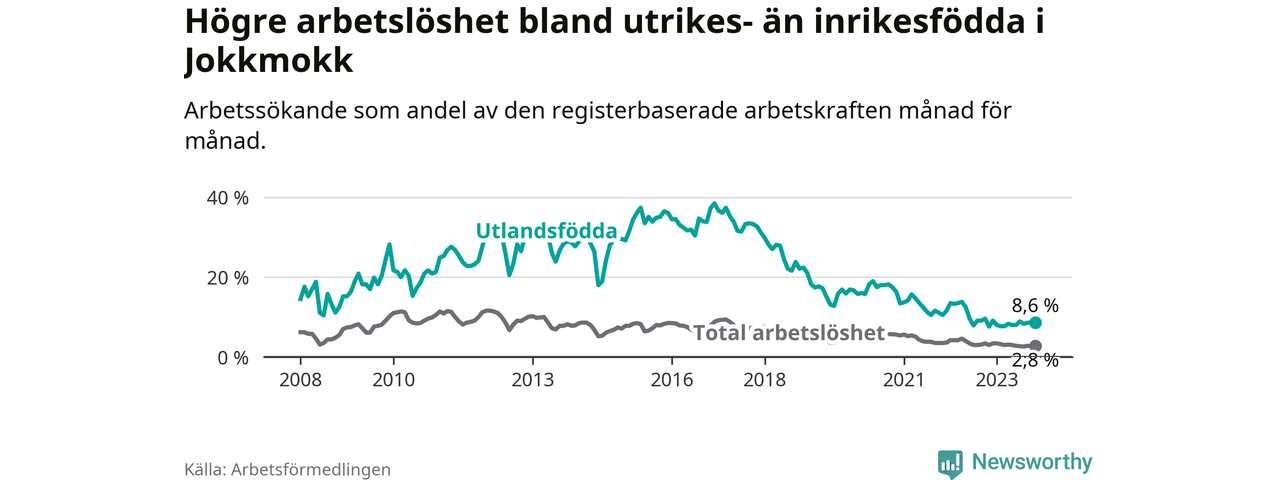 Arbetslösheten bland utlandsfödda var 8,6 procent i Jokkmokk under november månad, motsvarande 28 av 326 personer. Det är 1,0 procentenheter fler än vid samma tidpunkt i fjol (+5 om man räknar personer). Den senaste månadens uppgång innebär ett trendbrott. Under de tre föregående månaderna hade arbetslösheten bland utlandsfödda varit lägre än motsvarande tidpunkt året innan.