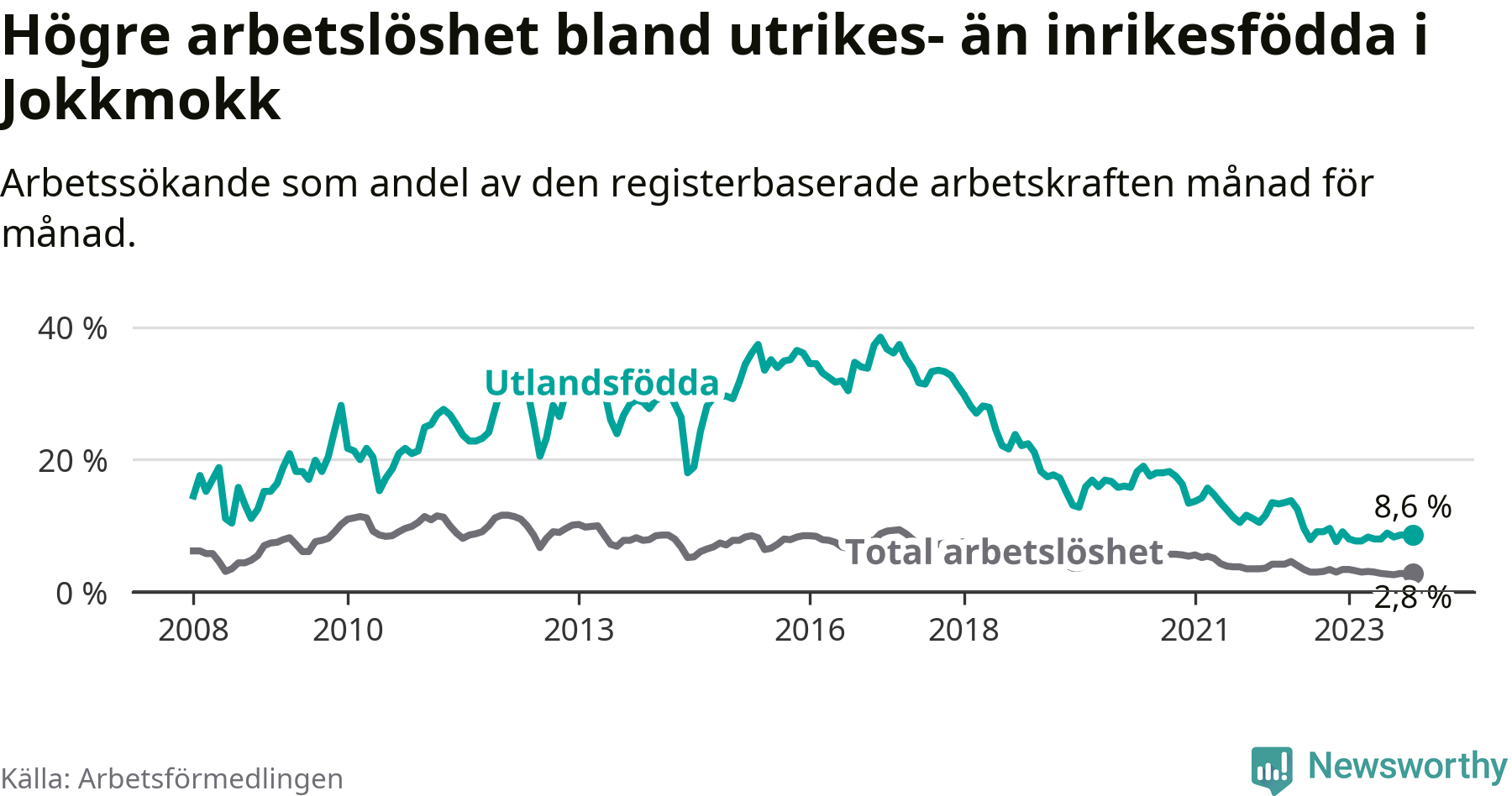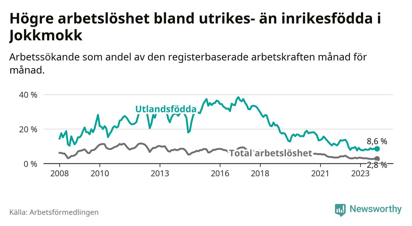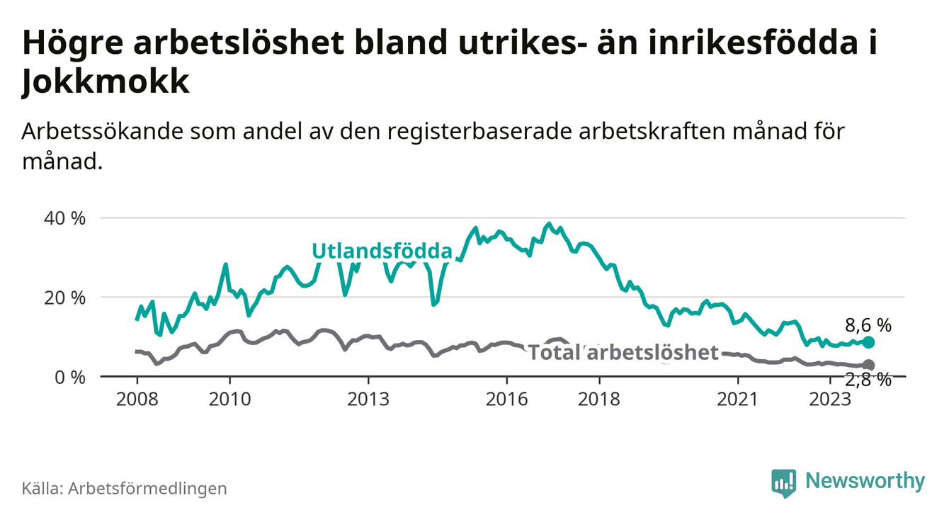 Arbetslösheten bland utlandsfödda var 8,6 procent i Jokkmokk under november månad, motsvarande 28 av 326 personer. Det är 1,0 procentenheter fler än vid samma tidpunkt i fjol (+5 om man räknar personer). Den senaste månadens uppgång innebär ett trendbrott. Under de tre föregående månaderna hade arbetslösheten bland utlandsfödda varit lägre än motsvarande tidpunkt året innan.