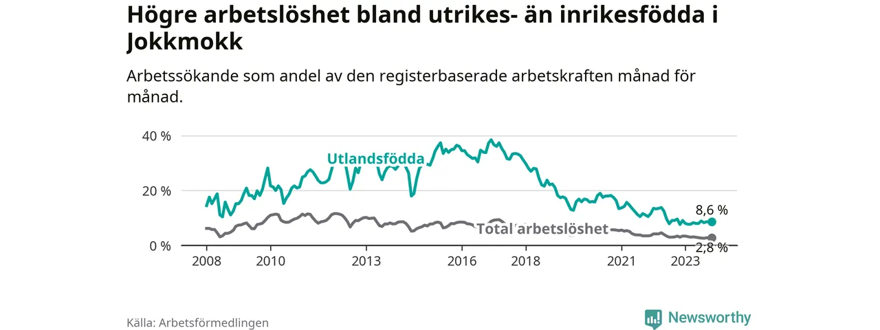 Skillnaden i arbetslöshet mellan utrikesfödda och hela befolkningen är 5,8 procentenheter i Jokkmokk. Det är en större skillnad än för ett år sedan (+1,2 procentenheter).