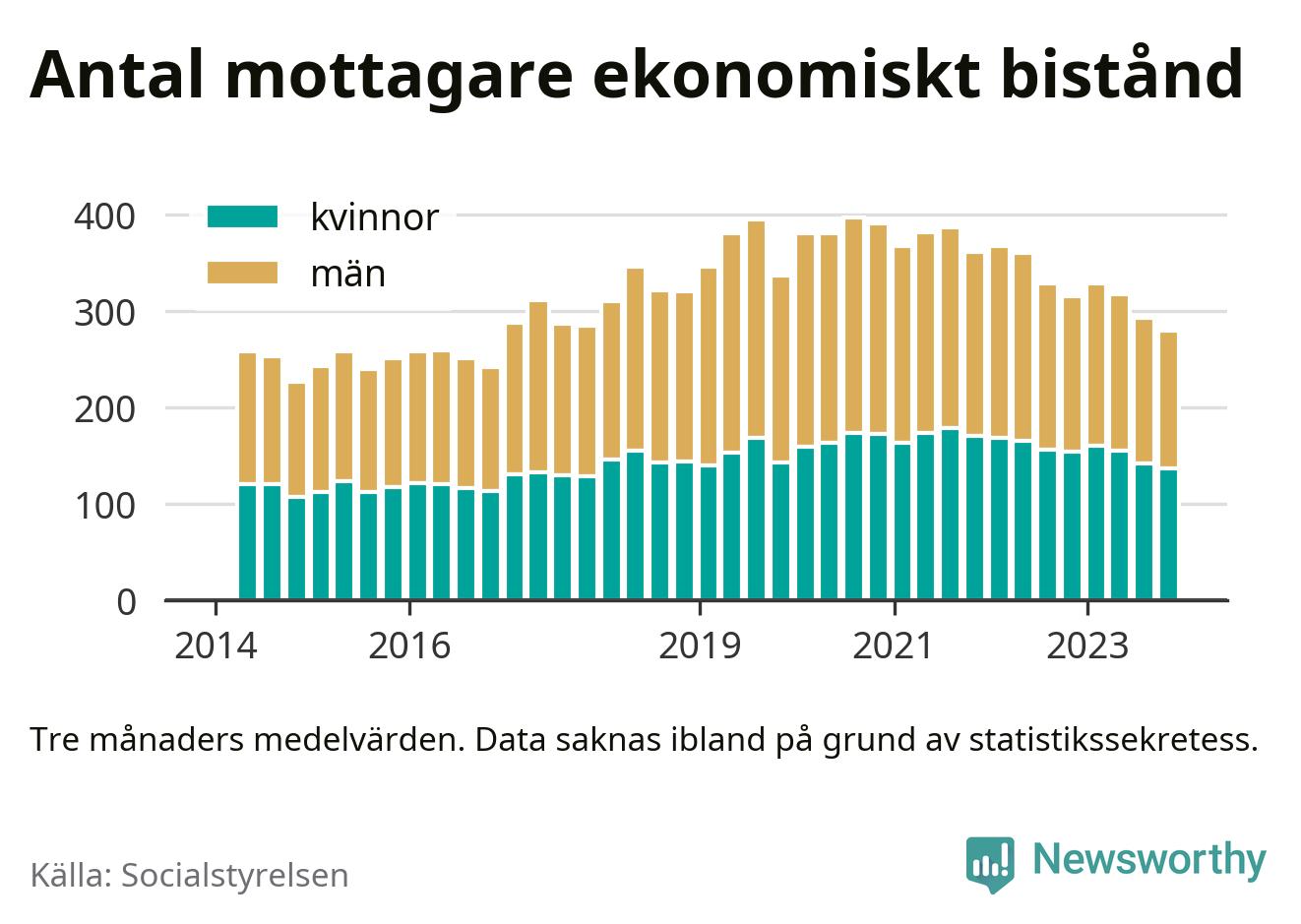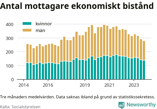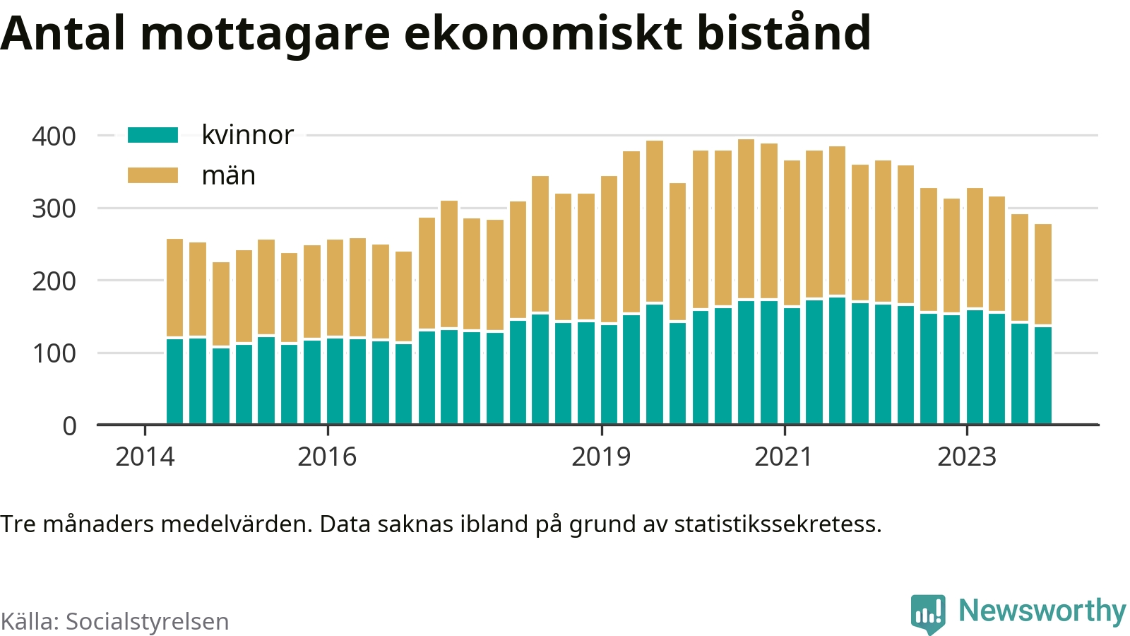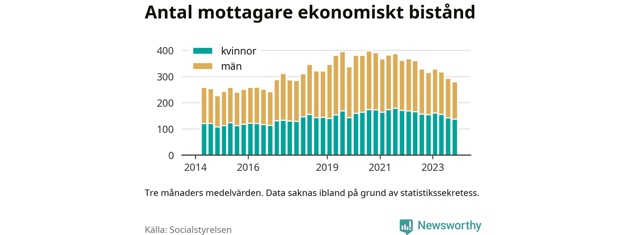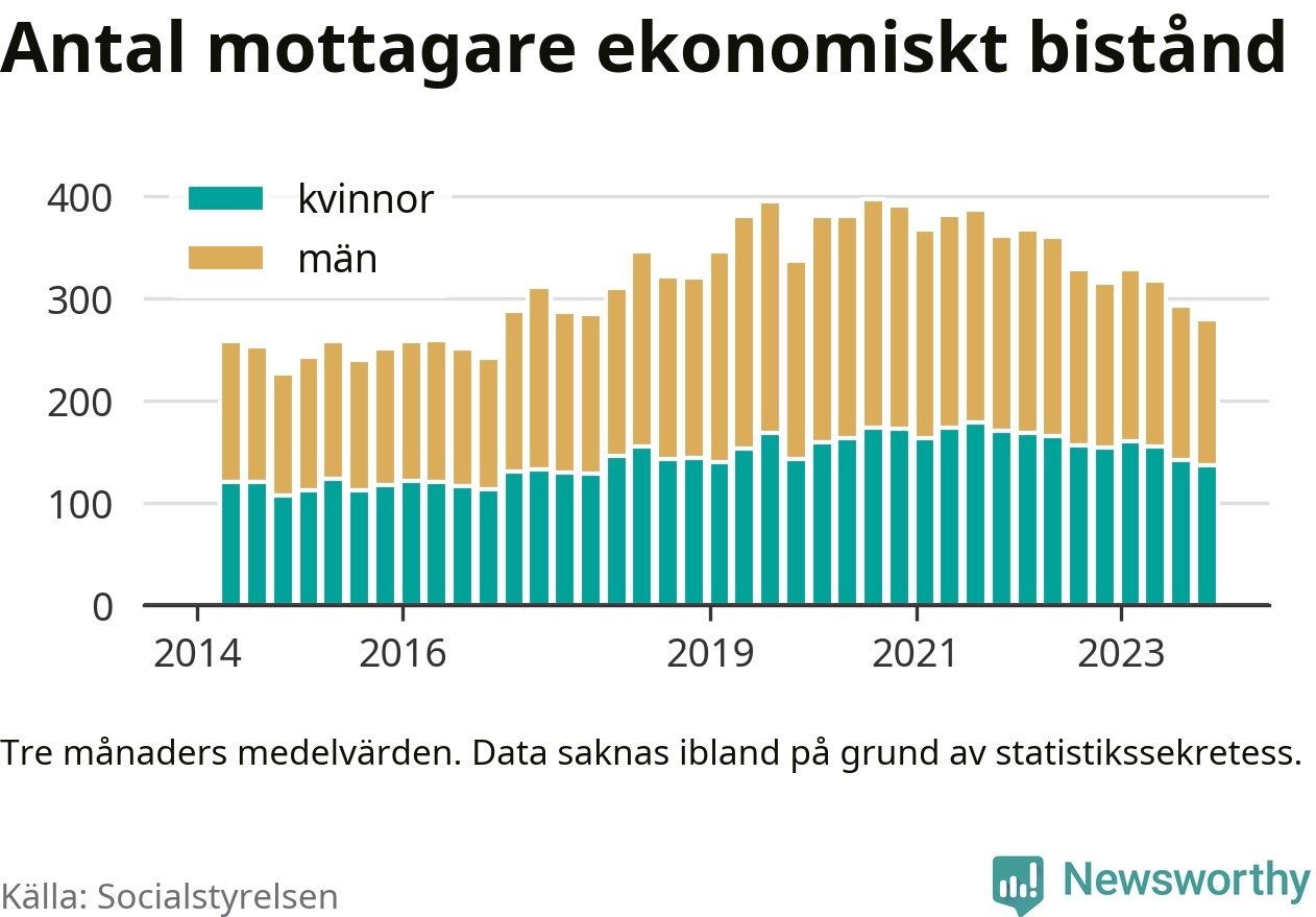 I genomsnitt 279 personer per månad fick ekonomiskt bistånd i Eksjö kommun