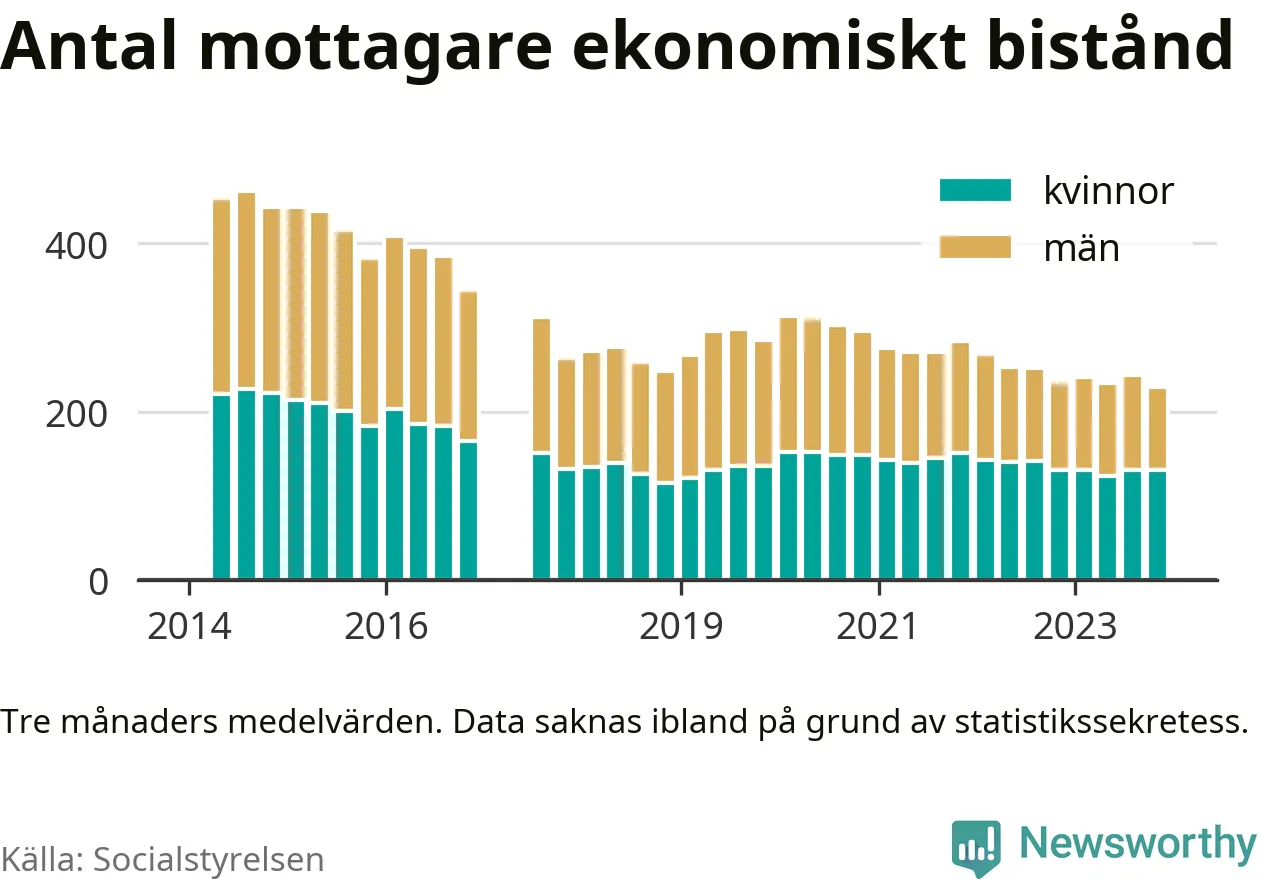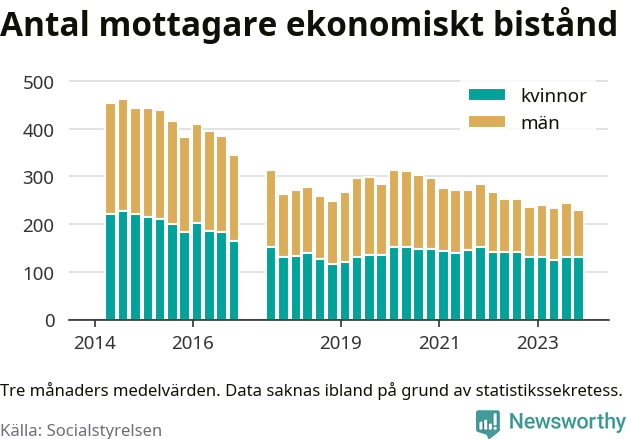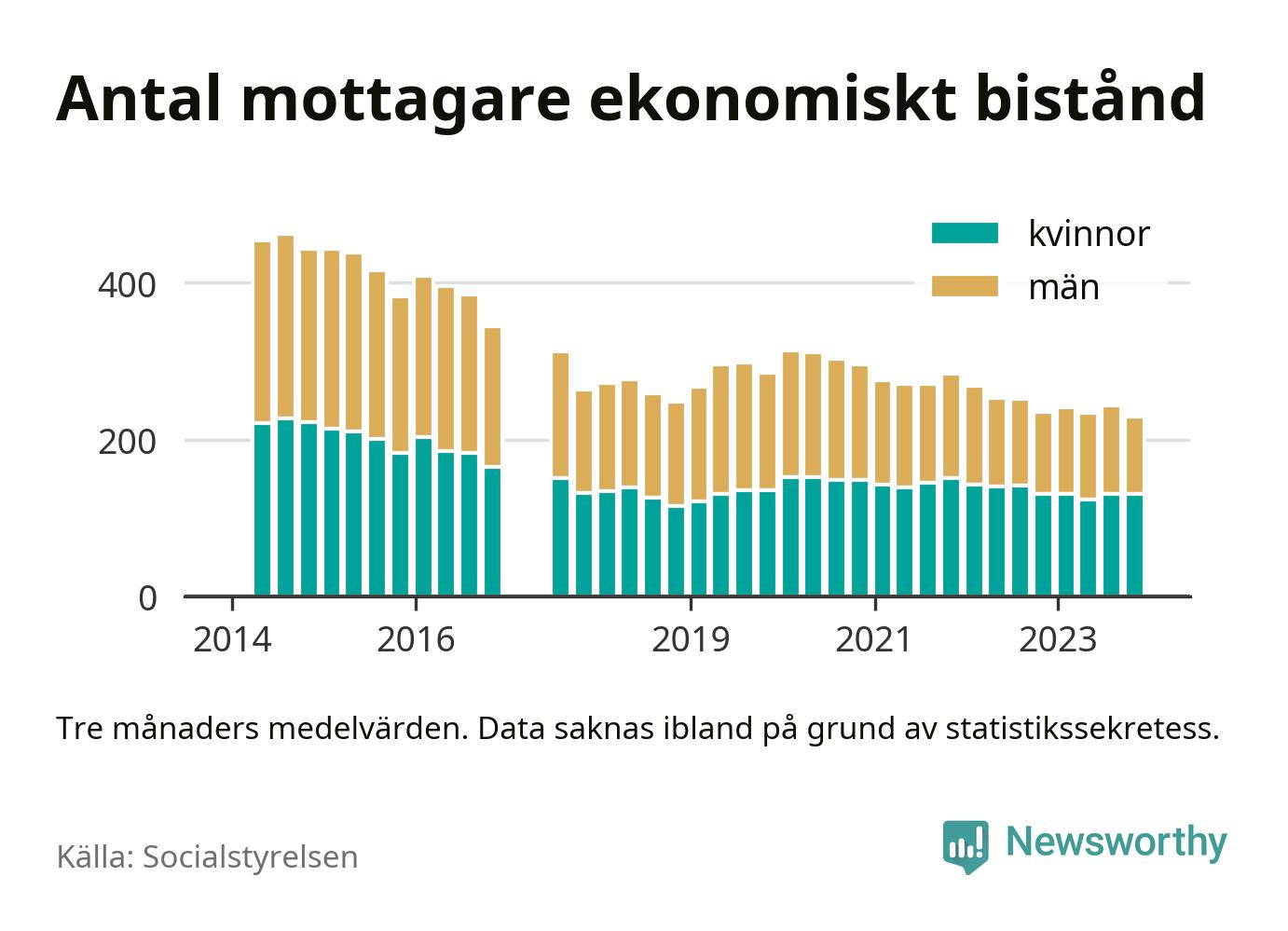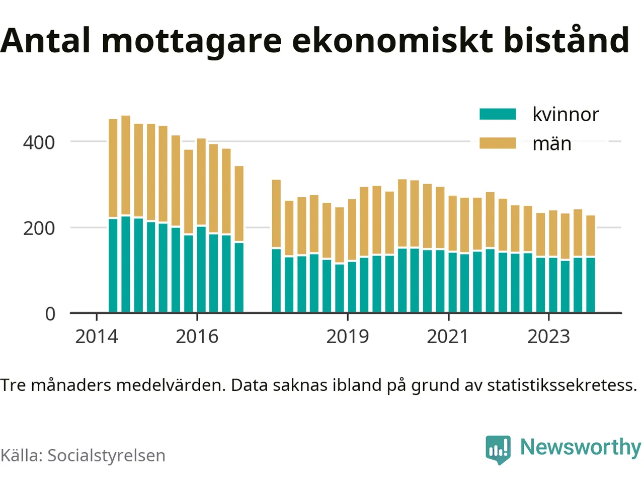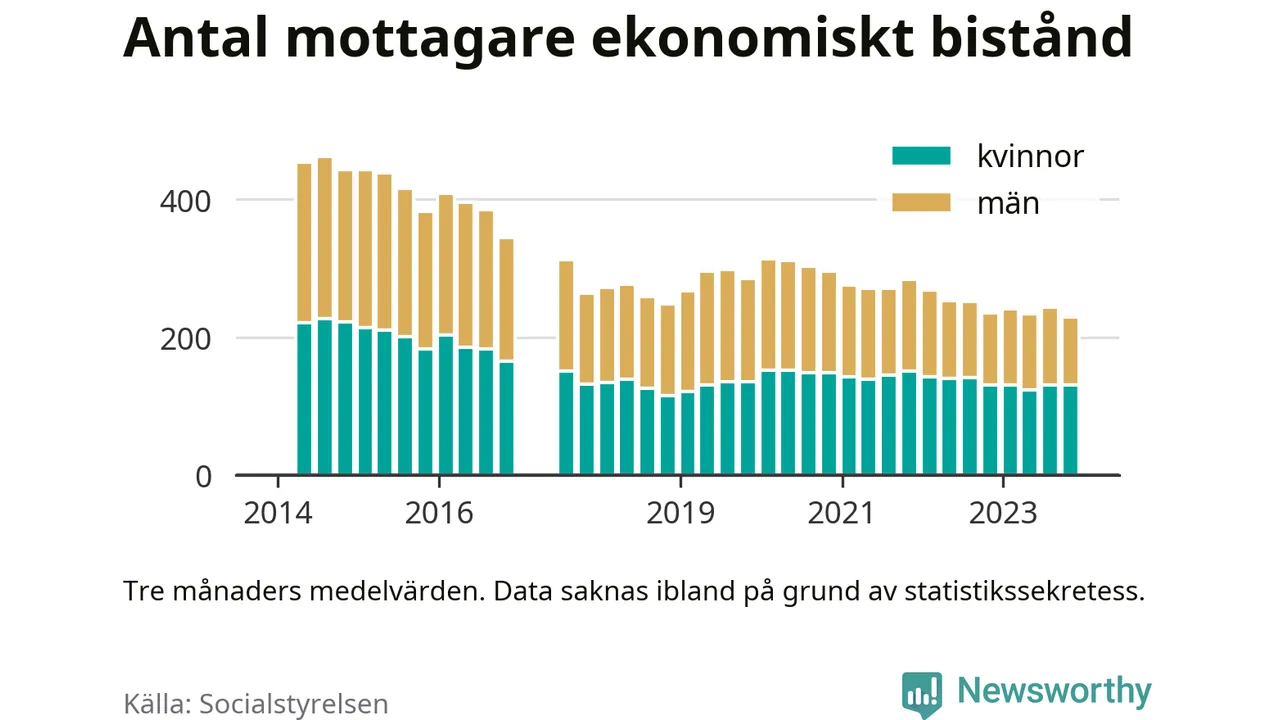 I genomsnitt 229 personer per månad fick ekonomiskt bistånd i Värnamo kommun