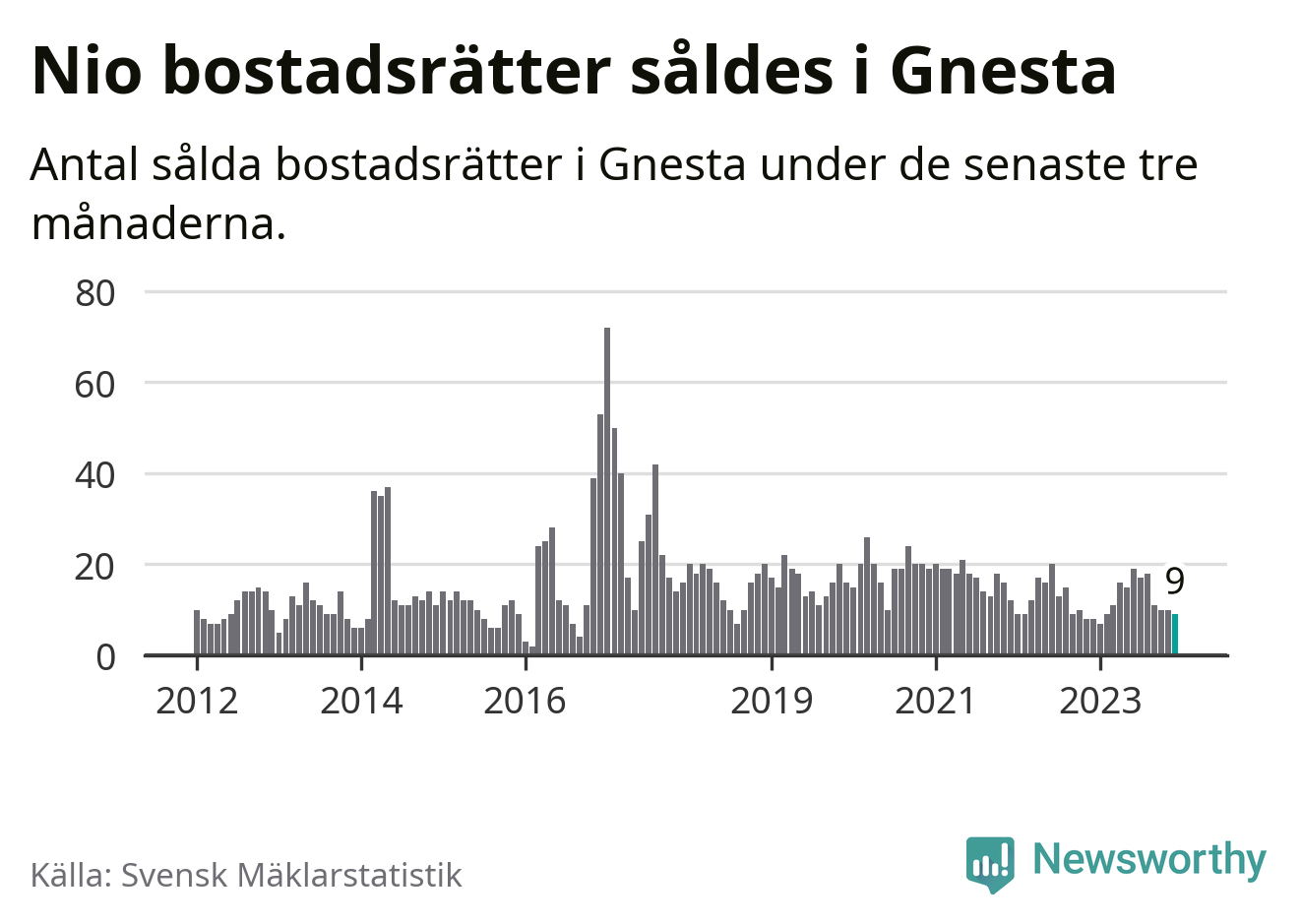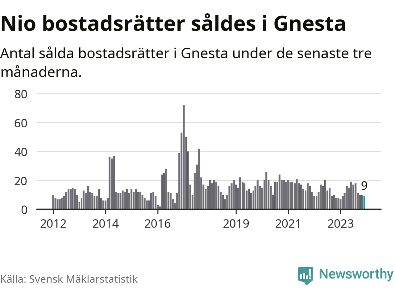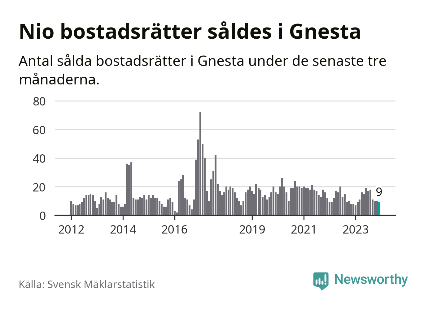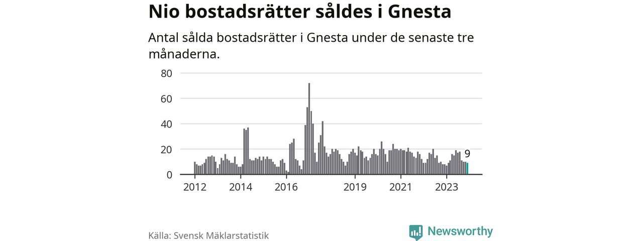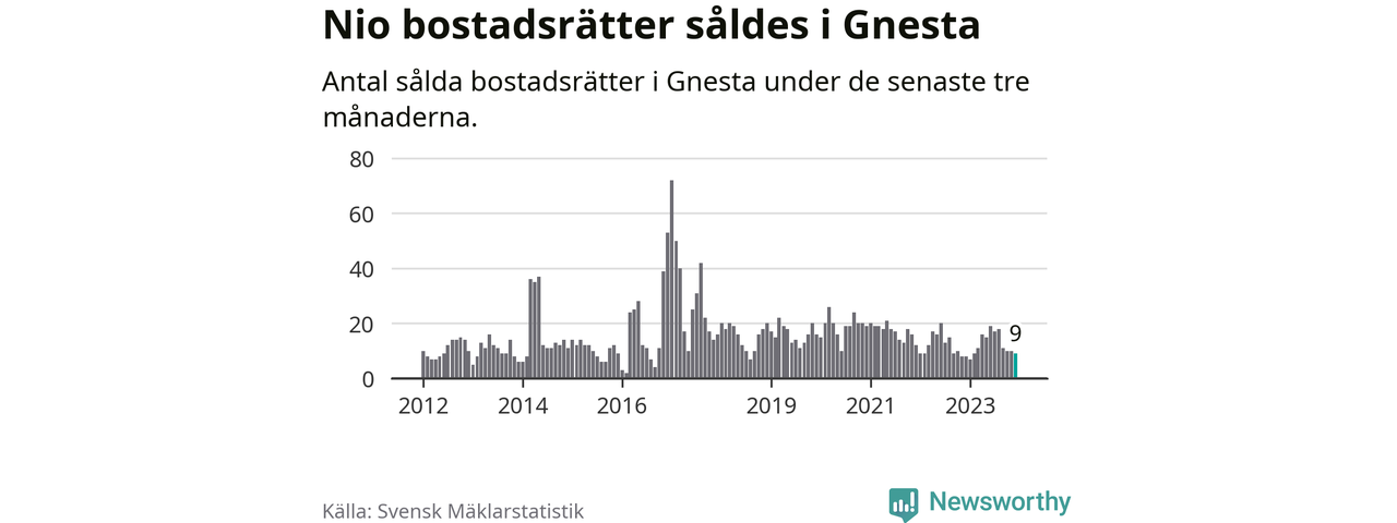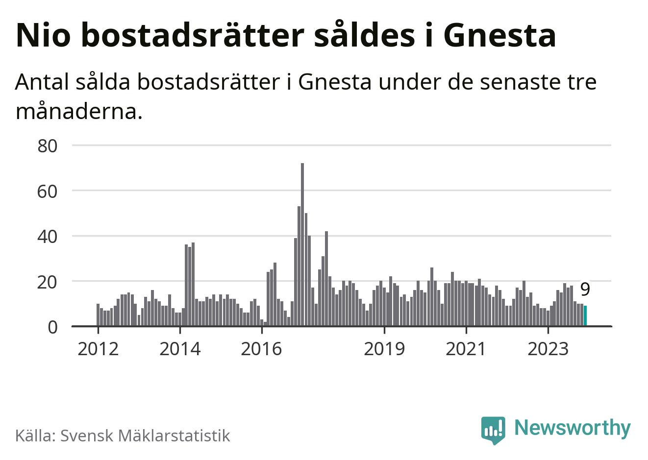 Mellan oktober och december gjordes sammanlagt nio affärer med bostadsrätter i Gnesta kommun. Det kan jämföras med åtta vid motsvarande tid i fjol.