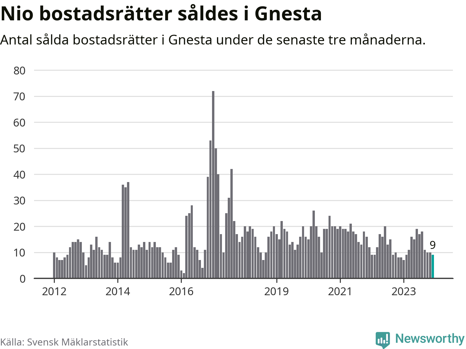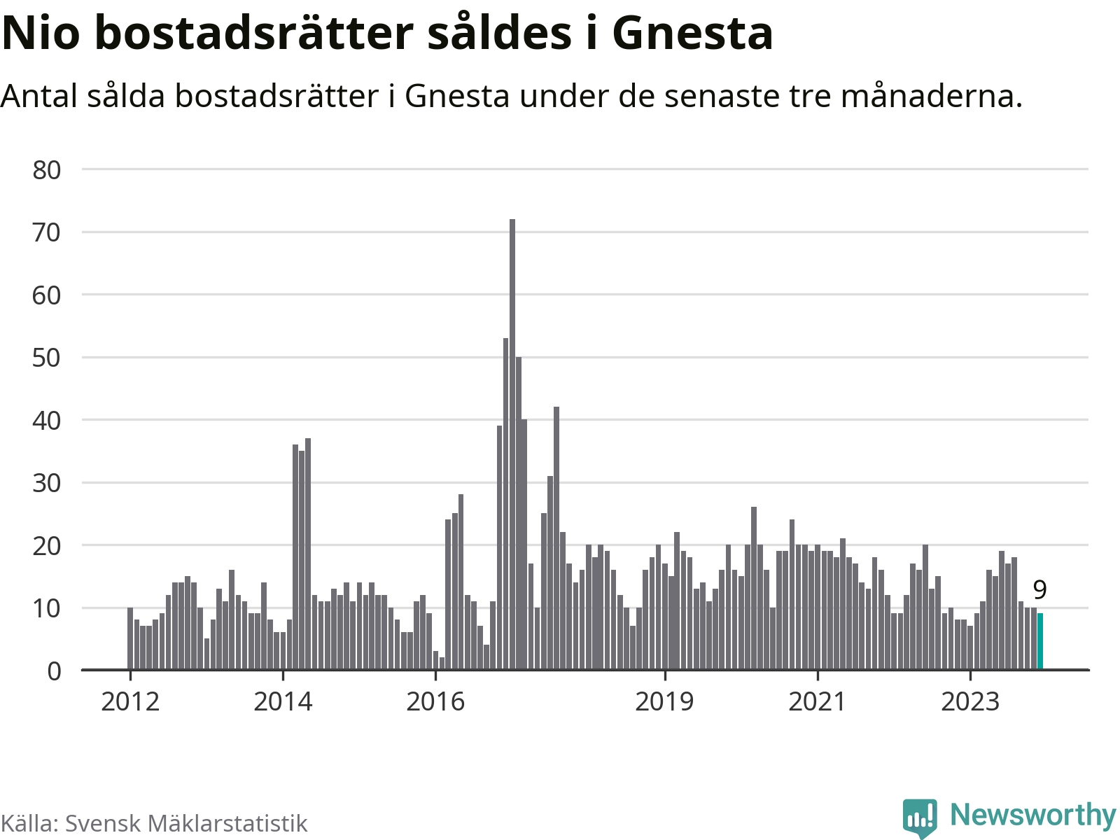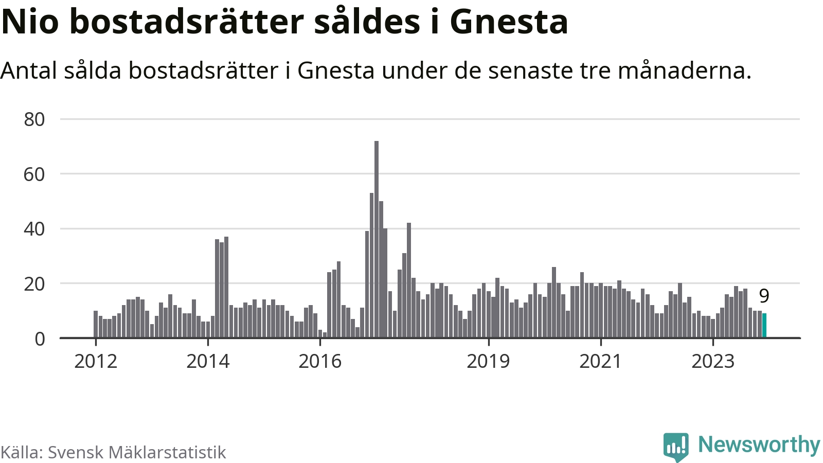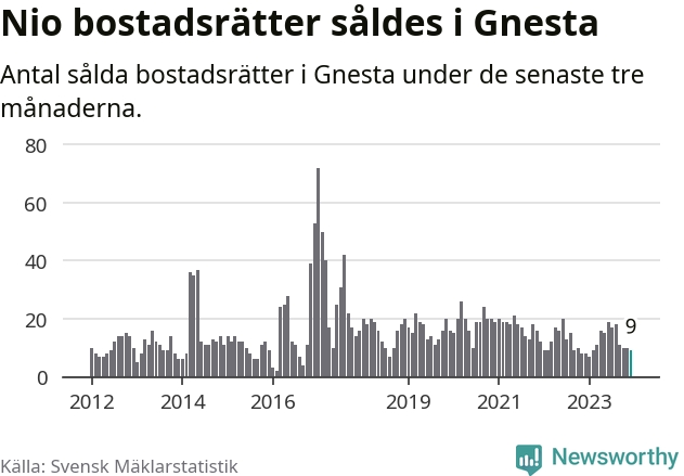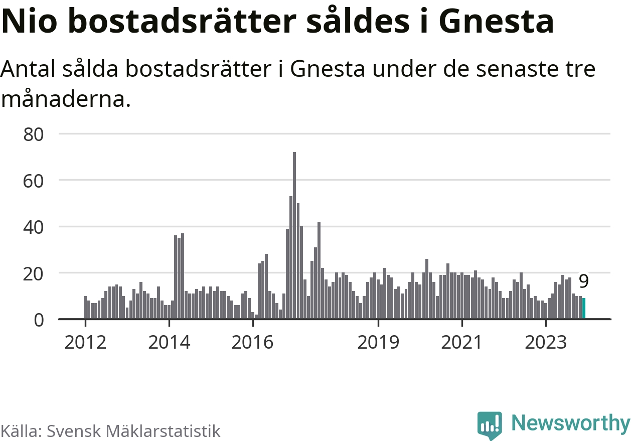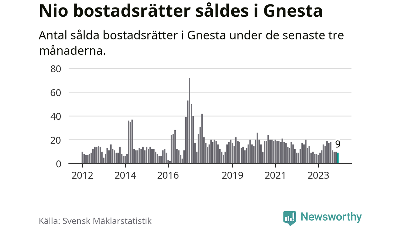 Mellan oktober och december gjordes sammanlagt nio affärer med bostadsrätter i Gnesta kommun. Det kan jämföras med åtta vid motsvarande tid i fjol.