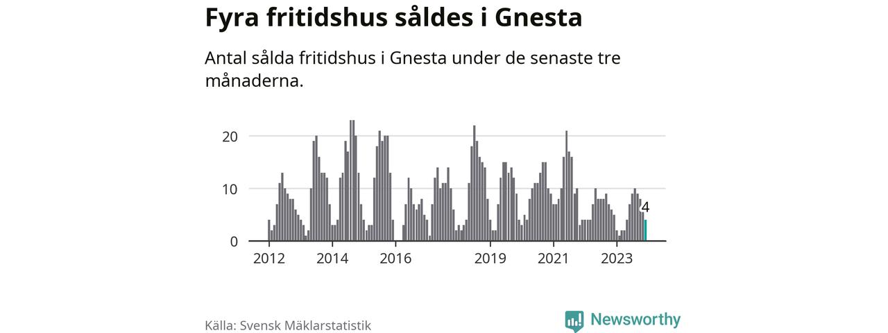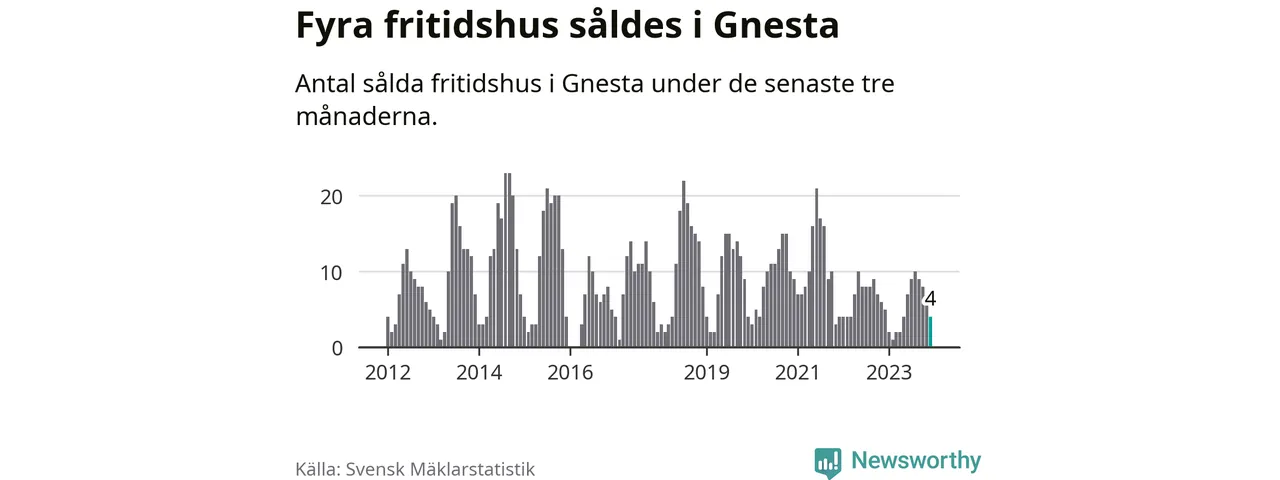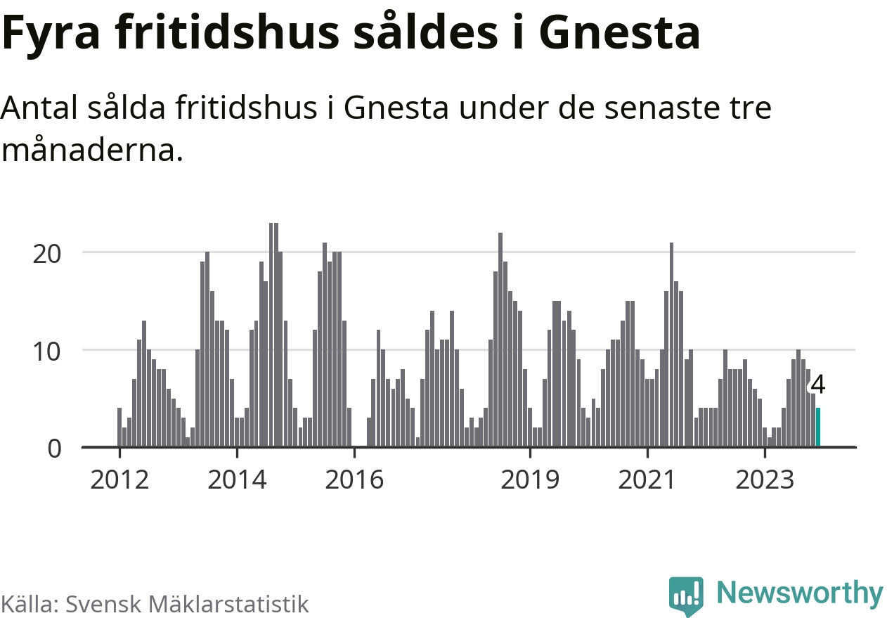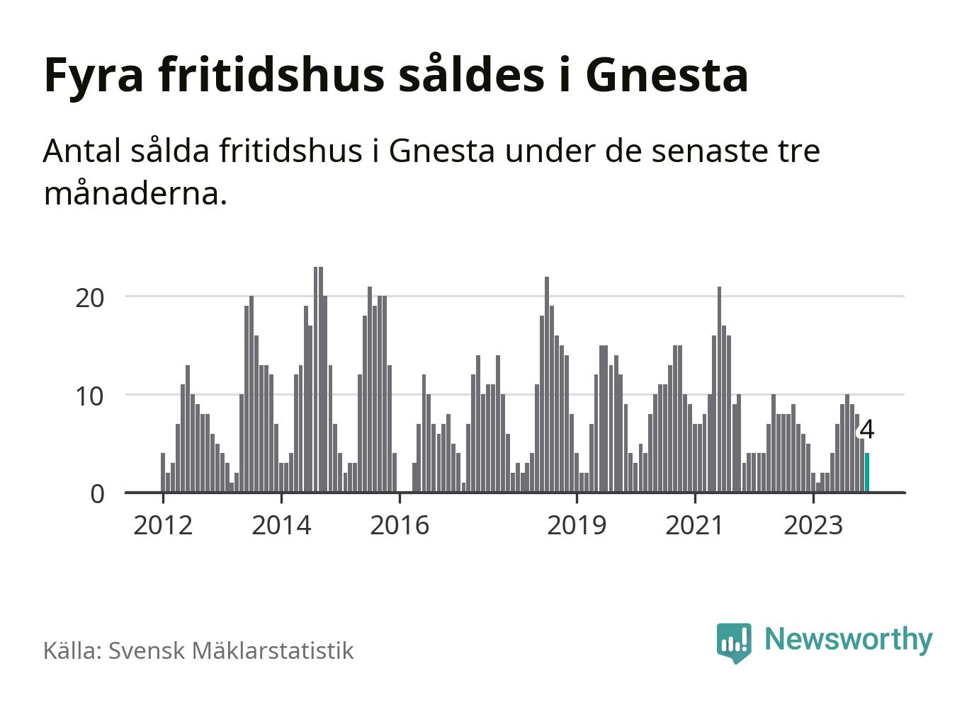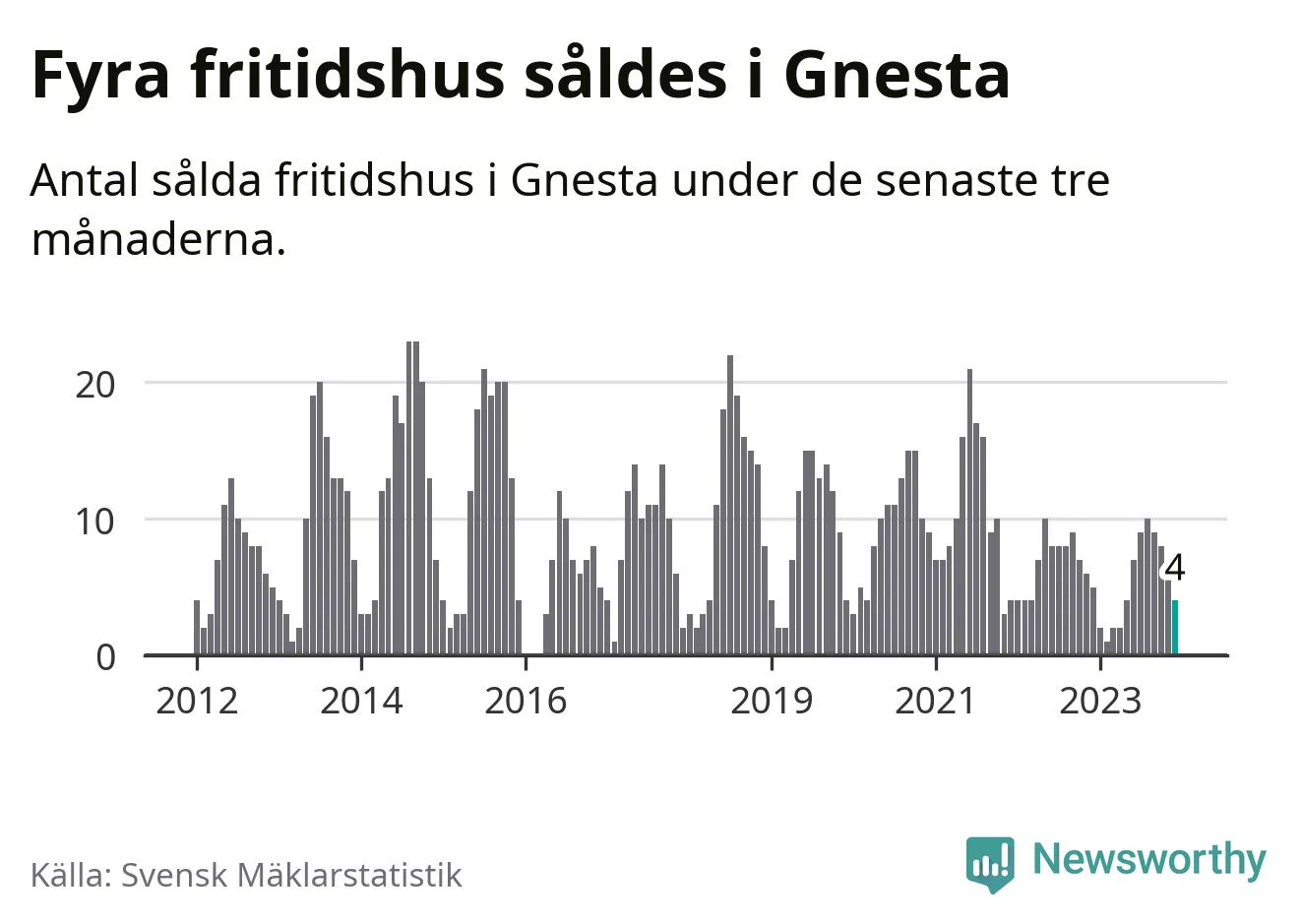 Mellan oktober och december gjordes sammanlagt fyra affärer med fritidshus i Gnesta kommun. Det kan jämföras med fem vid motsvarande tid i fjol.